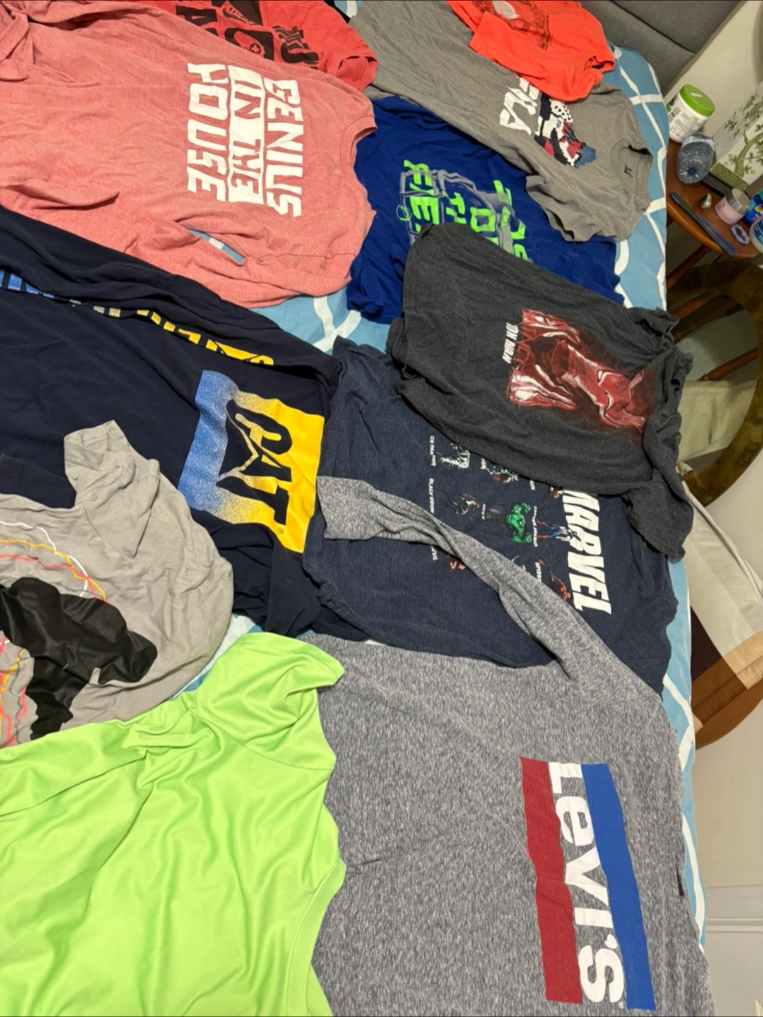 Large bundle of boys' graphic tees. Variety of colours and designs. Sizes vary. Includes Marvel, Levi's, CAT, and other brands. Great for everyday wear or layering.( total 20 t-shirts) size 14-16 . Pick up and cash only