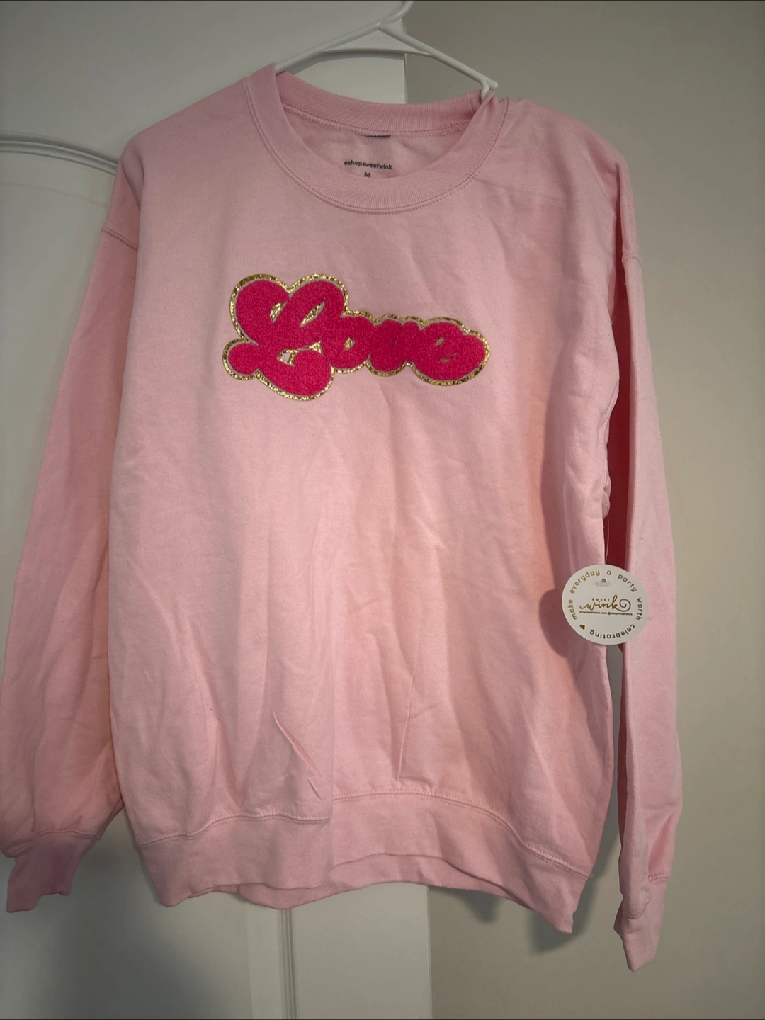 Pink crewneck sweatshirt. Features sparkly gold and pink Love graphic. Size medium. ShopSweetRebel brand.