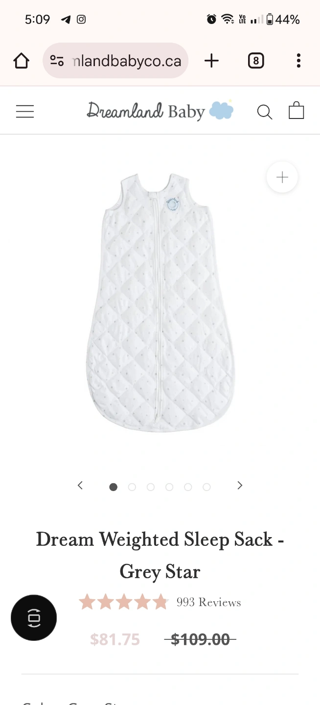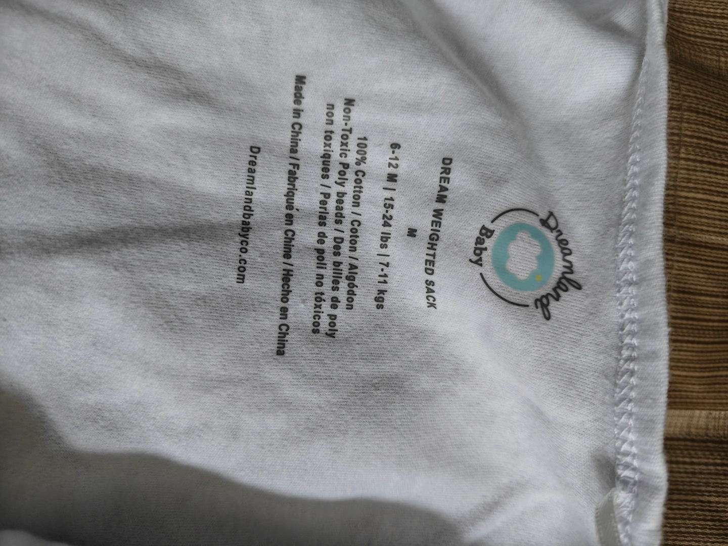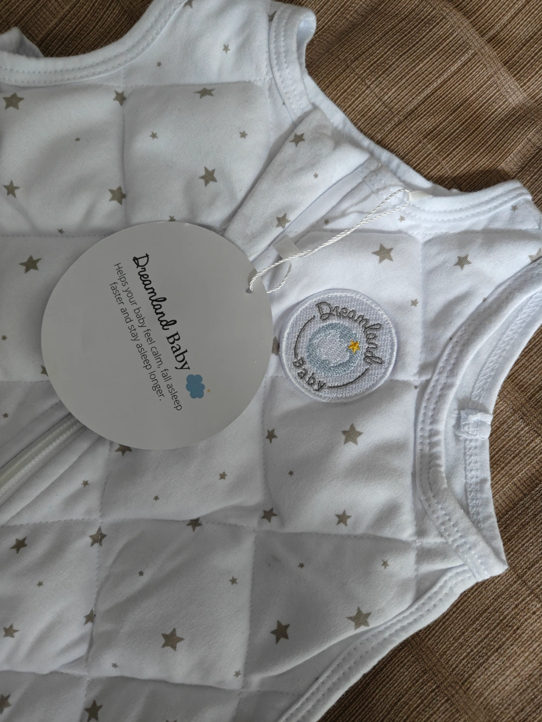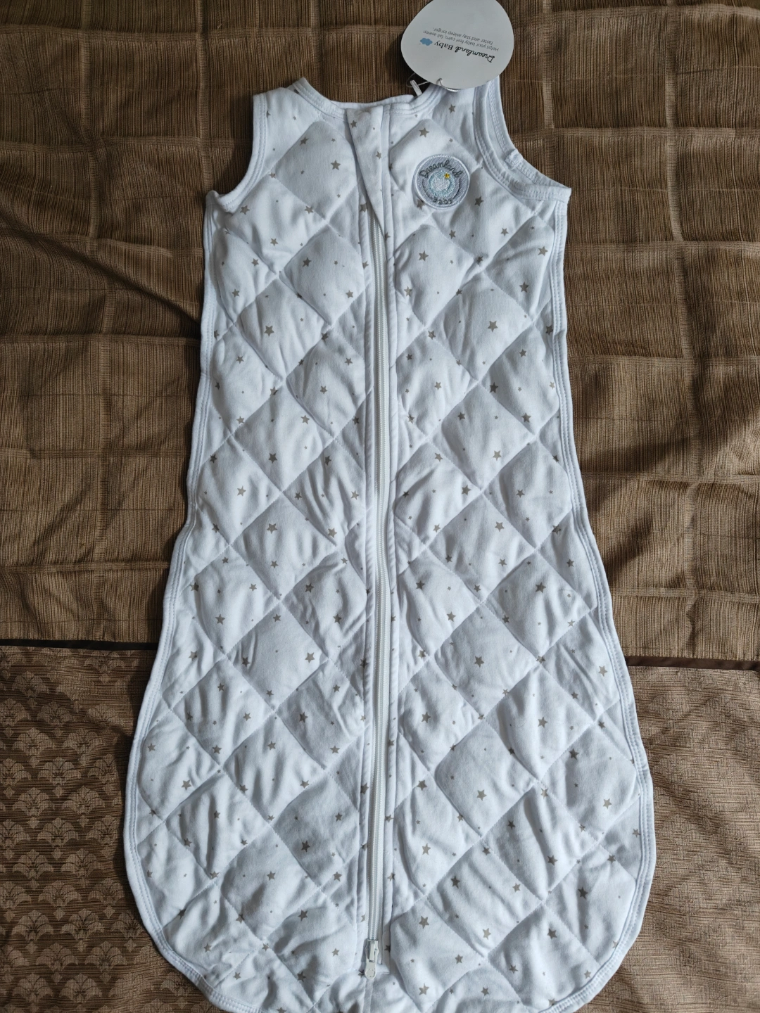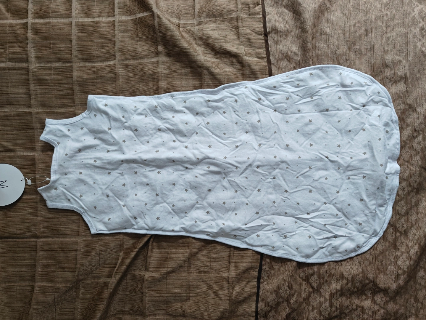 Weighted sleep sack. Grey stars on white background. Zipper closure. Suitable for 6-12 months.