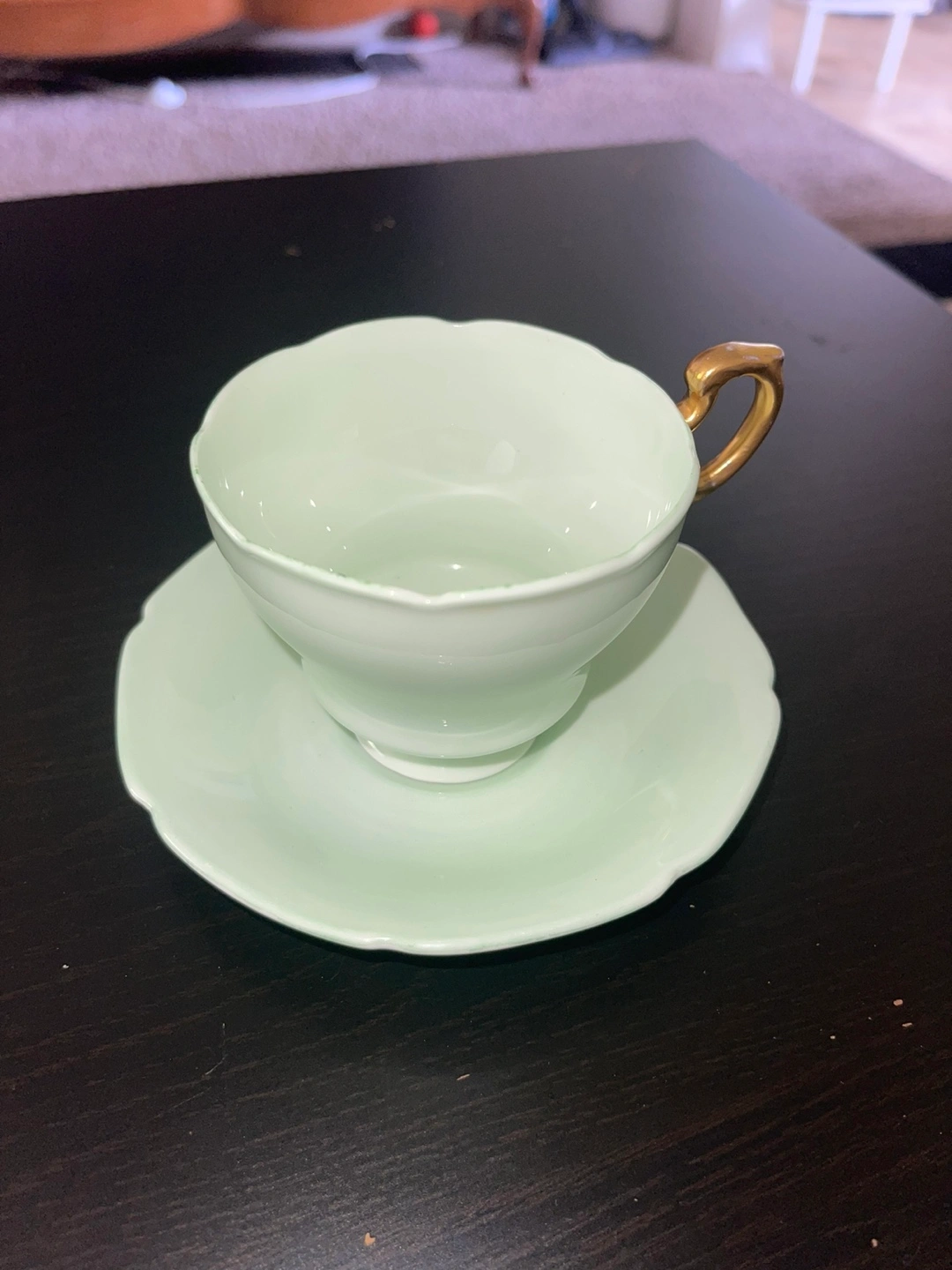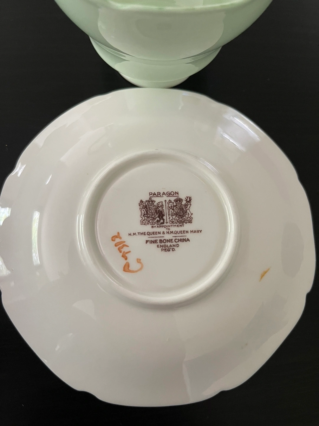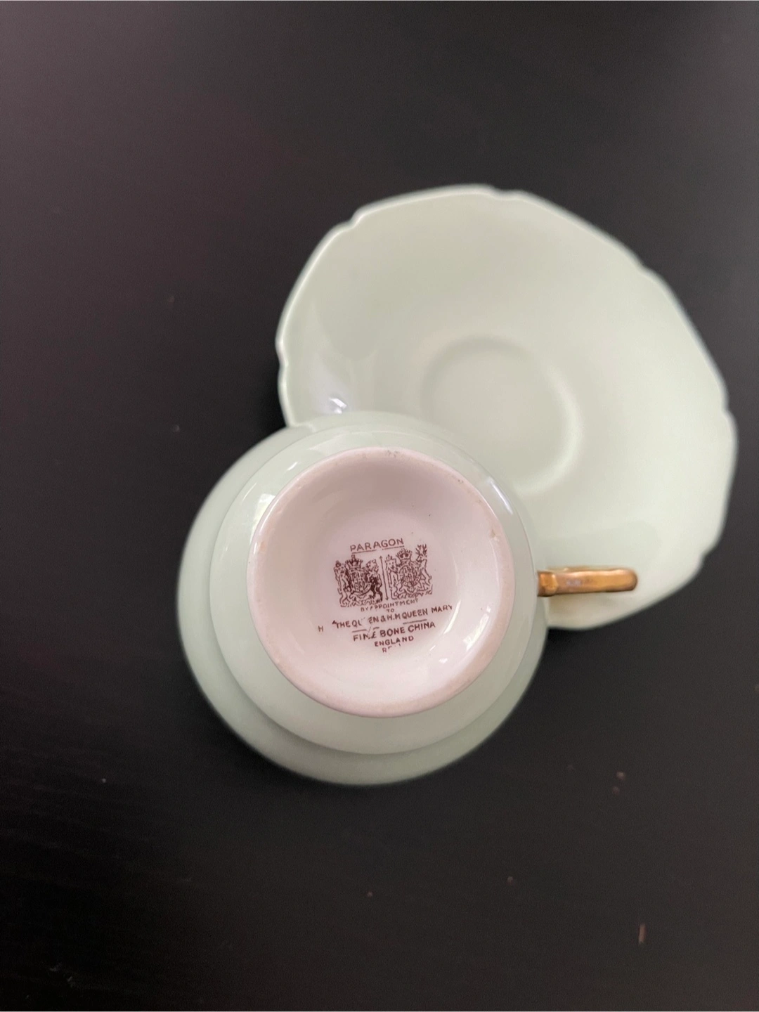 Elegant white saucer with intricate detailing. Crafted by Paragon. Paragon | DOUBLE Warrant | Tea Cup Saucer | Light Mint Green | Gold | China Teacup Saucer | 1940s Cup | Etsy Canada | Etsy Manitoba | Wpg VINTAGE tea cup set is green inside and out with an all gold handle. A wonderful, elegant set that would compliment any collection. This item is in excellent used condition with no chips, cracks or crazing. Minor gold wear on the handle due to age and use. Amazing condition for over 70 years old! Made In England Fine Bone China Back Stamp dates: 1939-1949 Features Double Warrant HM the Queen and HM the Queen Mary