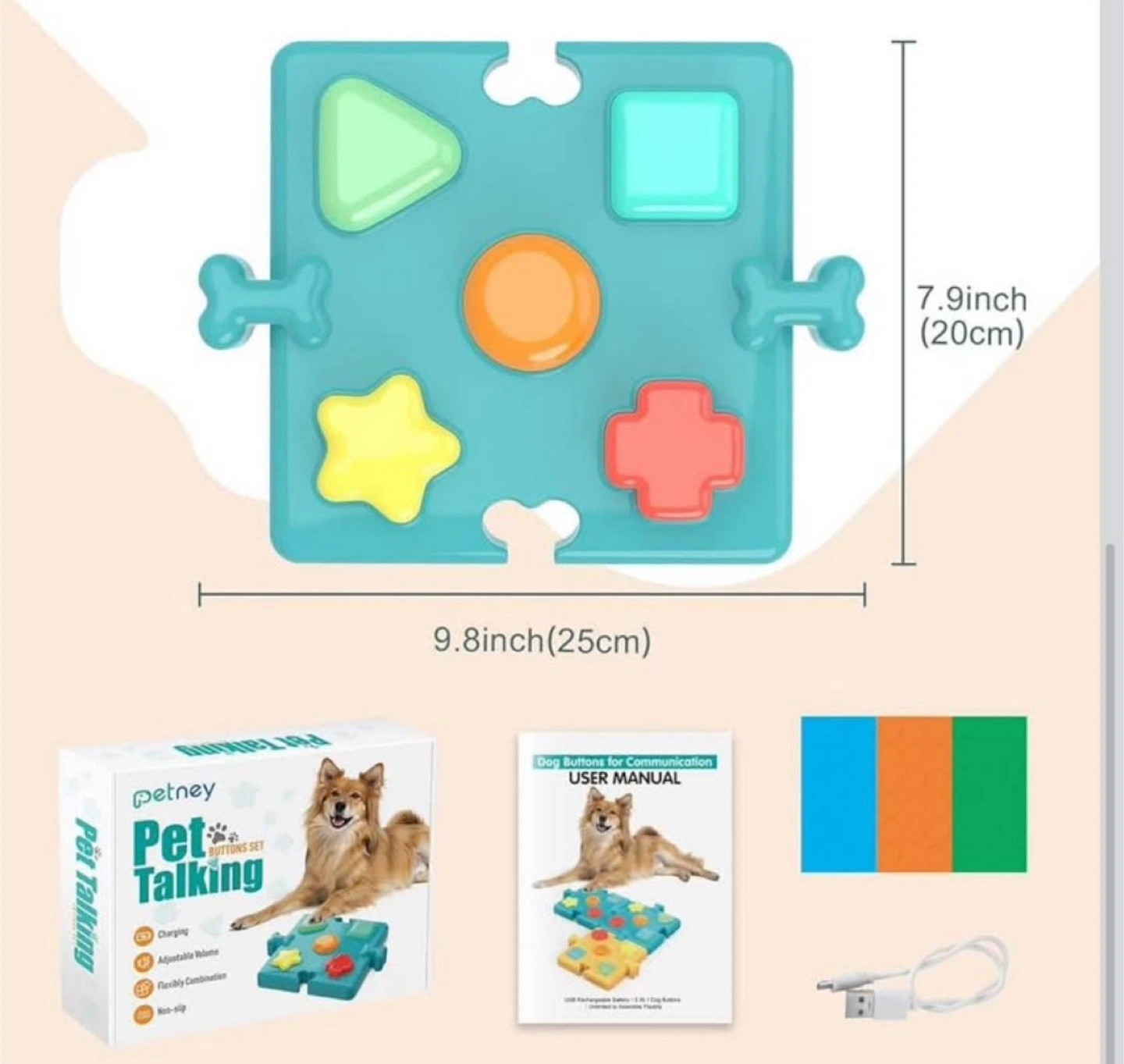 【Easy to Use】5 different colors and shapes make it easier for your pet to recognize commands. Equipped with blank stickers, you can write down the record words and put the stickers onto the buttons to distinguish. You can use these recordable buttons to record specific words or phrases such as eat, play, go out, etc.