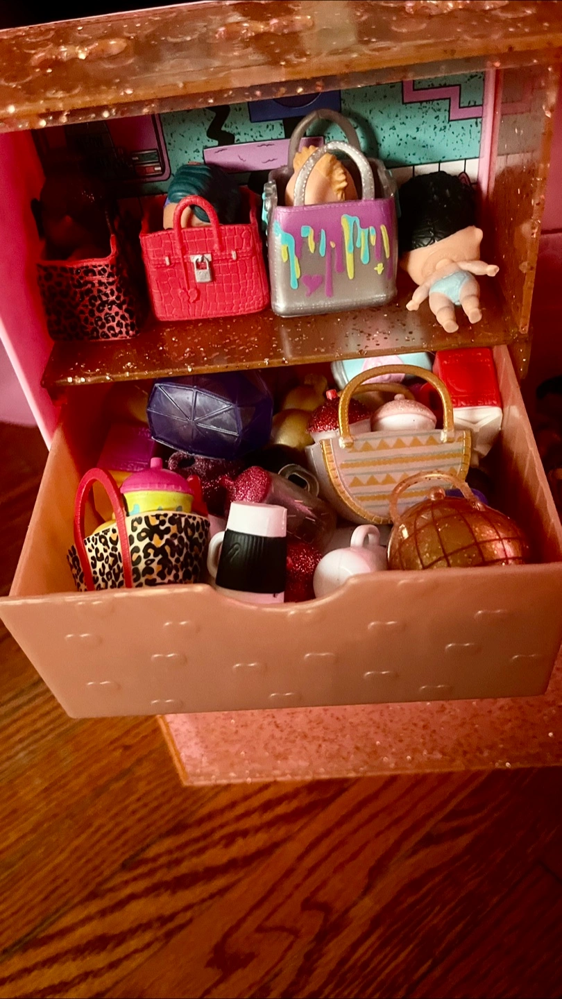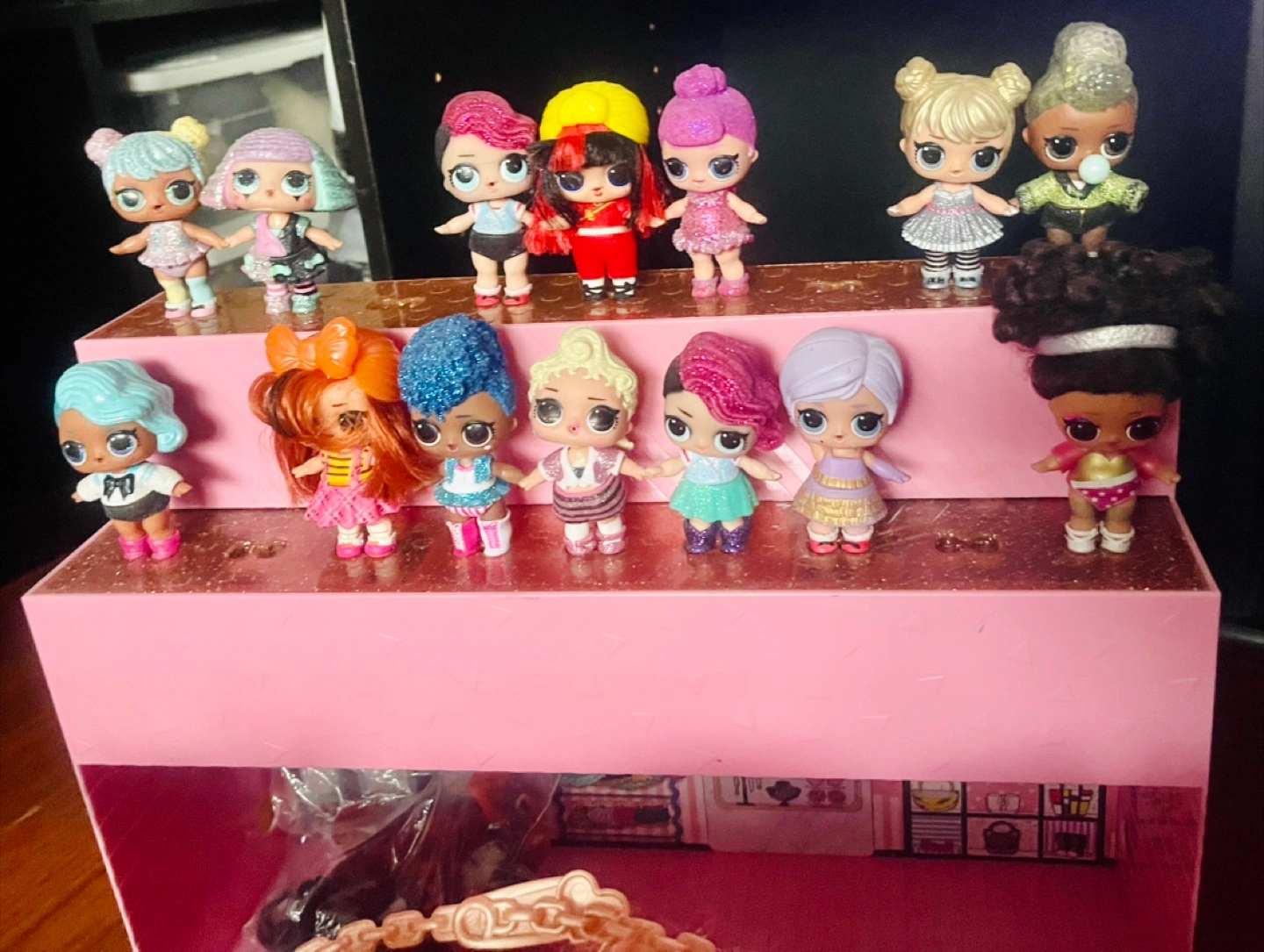 Large LOL Surprise! playset. Includes numerous dolls and accessories. Features a multi-tiered display stand with drawers for storage. Pink and gold colour scheme. Great for collectors or for play.