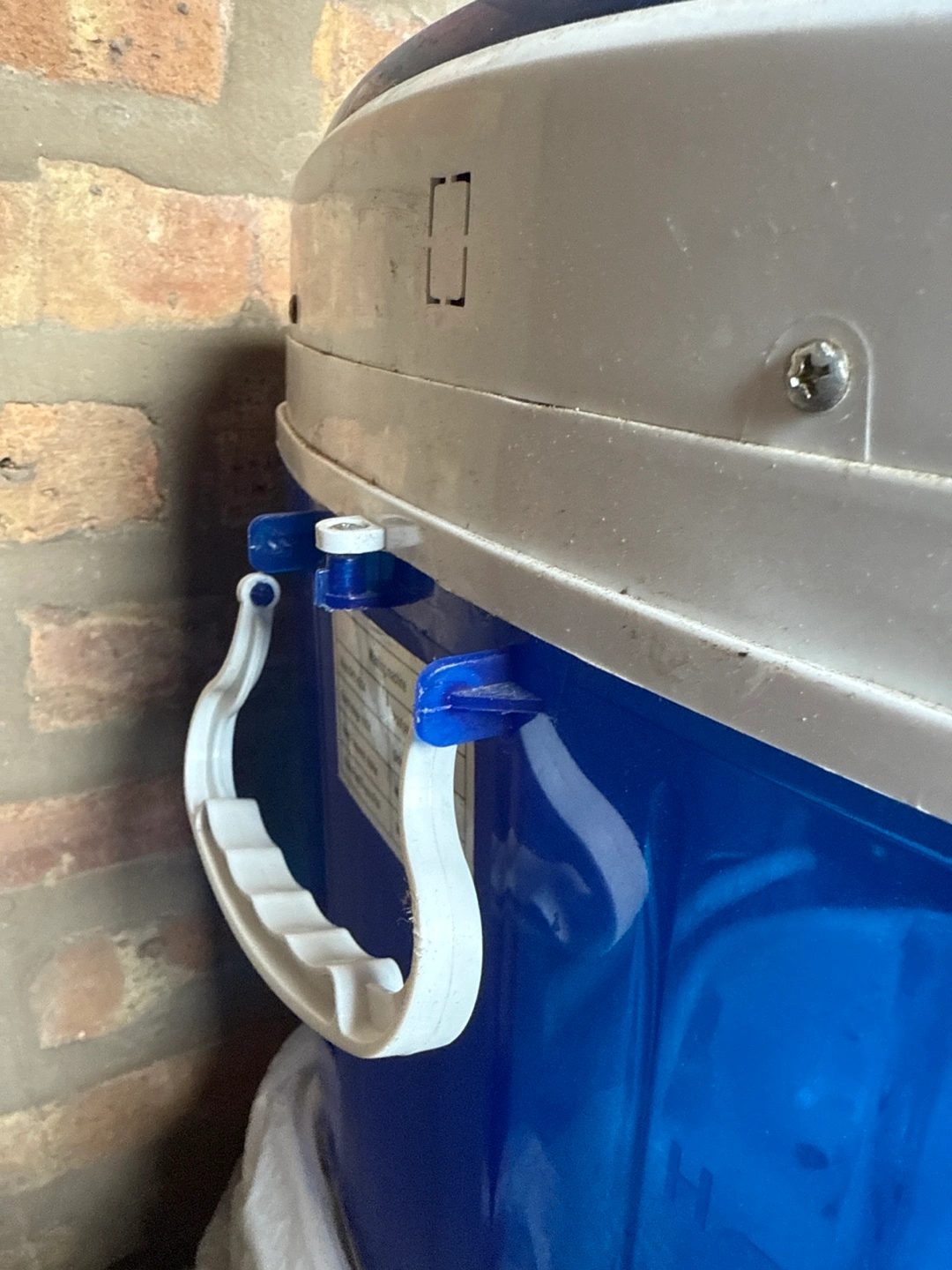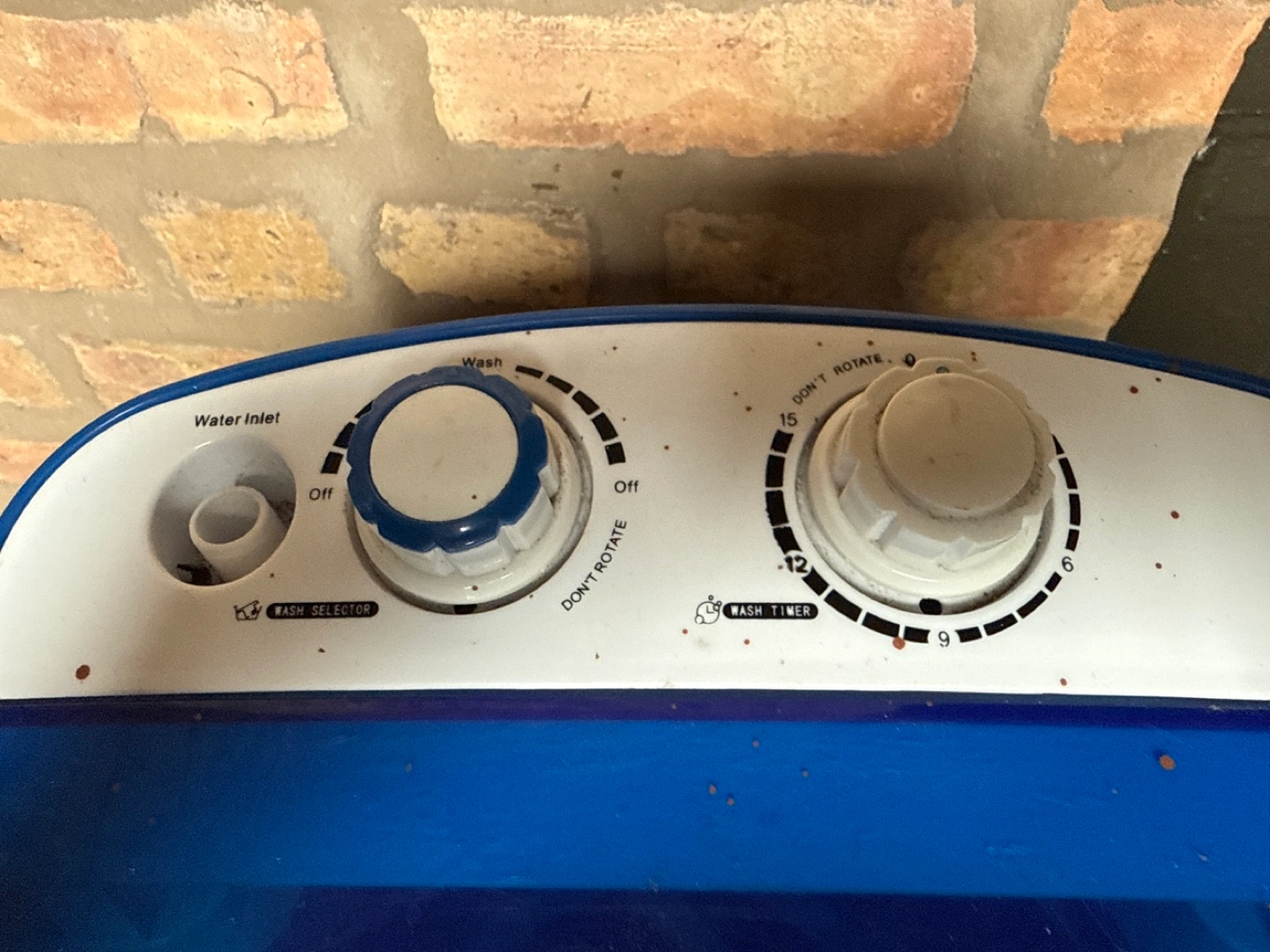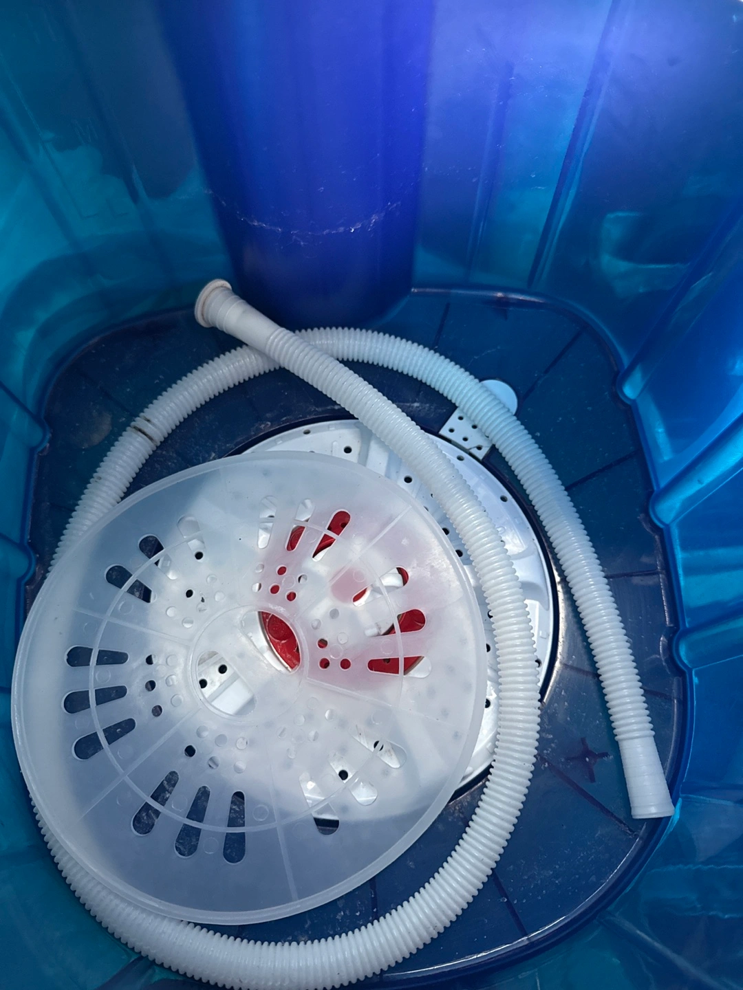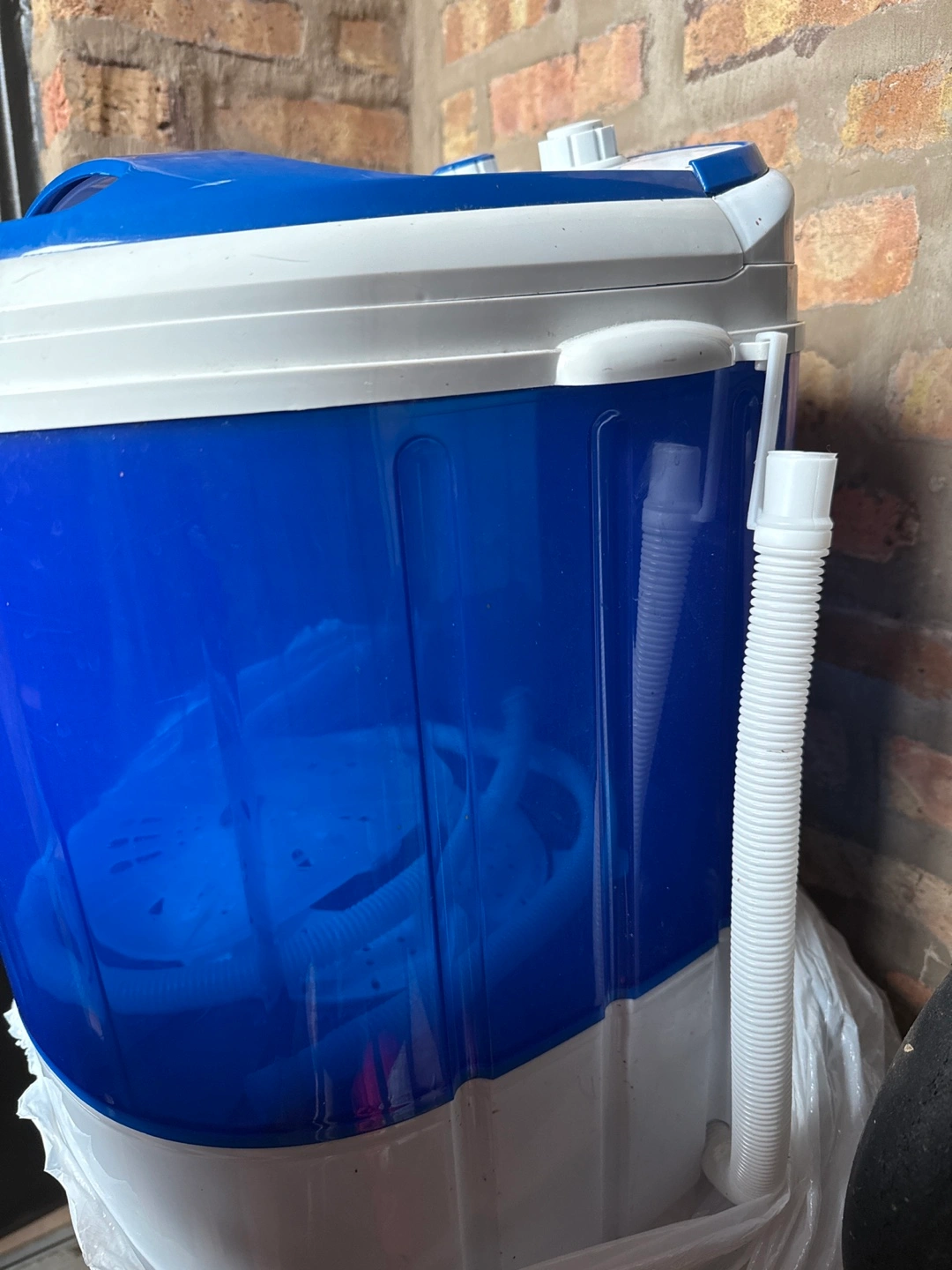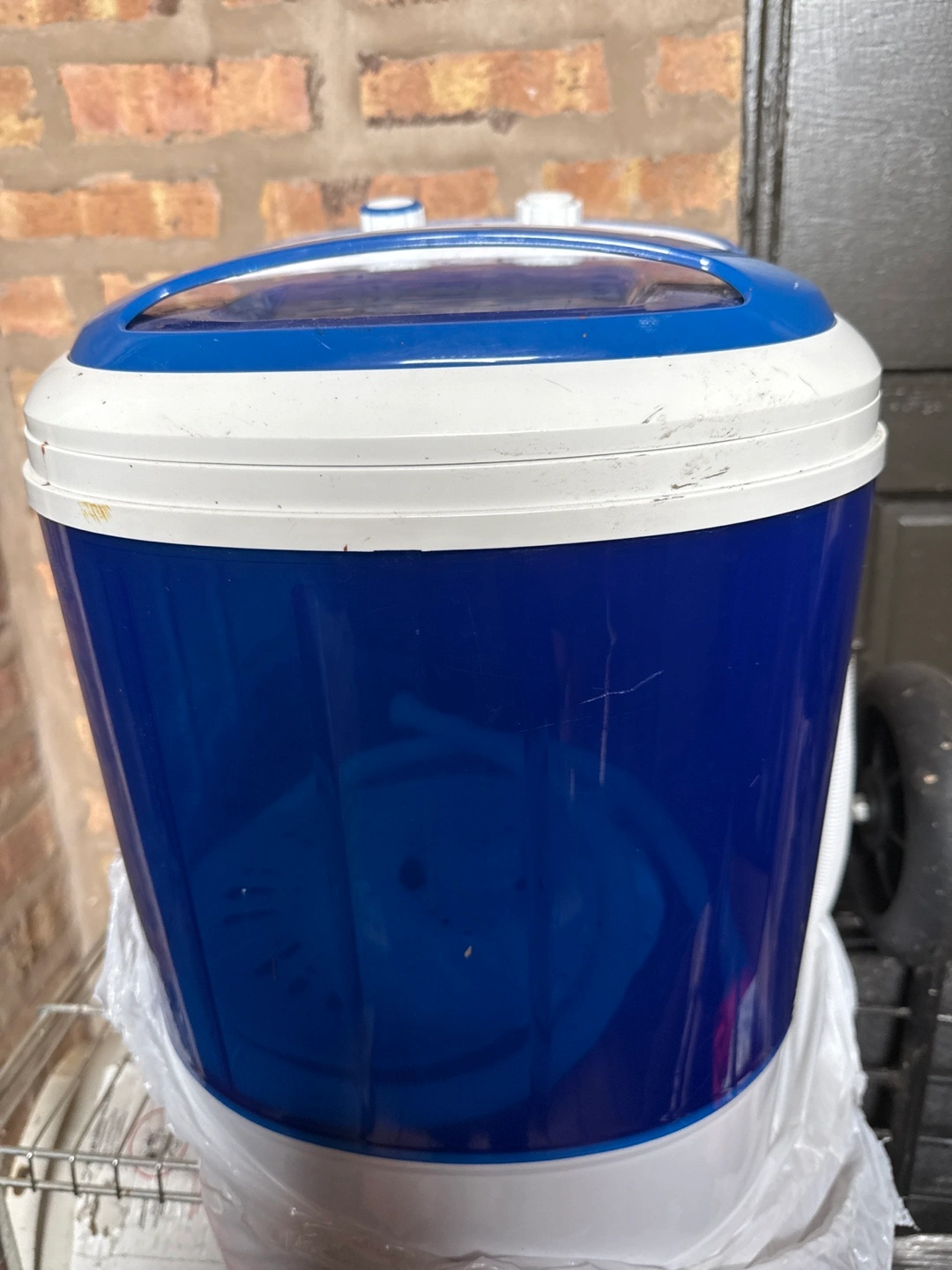 Moving sale! CASH ONLY! Compact washing machine, great for small spaces. Blue and white plastic construction. Features a wash and spin cycle. Includes drain hose. Shows some minor wear. The handle in the back is broken.