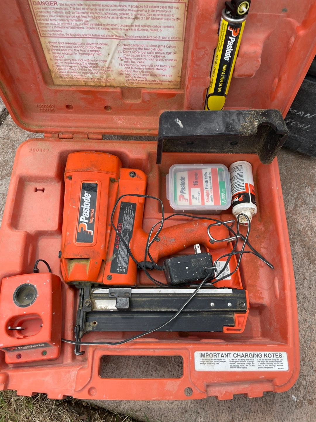 Cordless finish nailer. Includes carrying case, battery, charger, and extra nails. Used condition. Good working order.