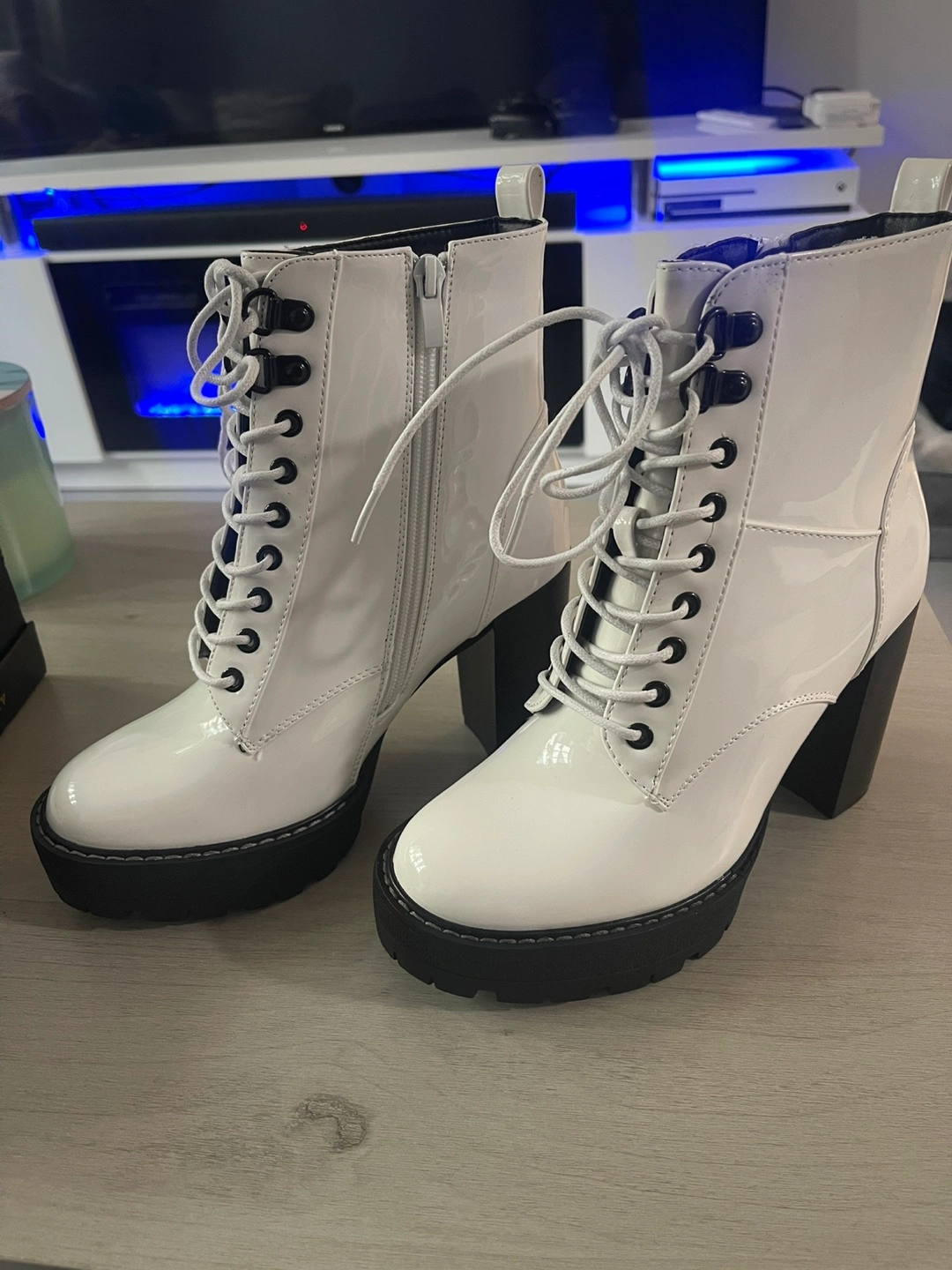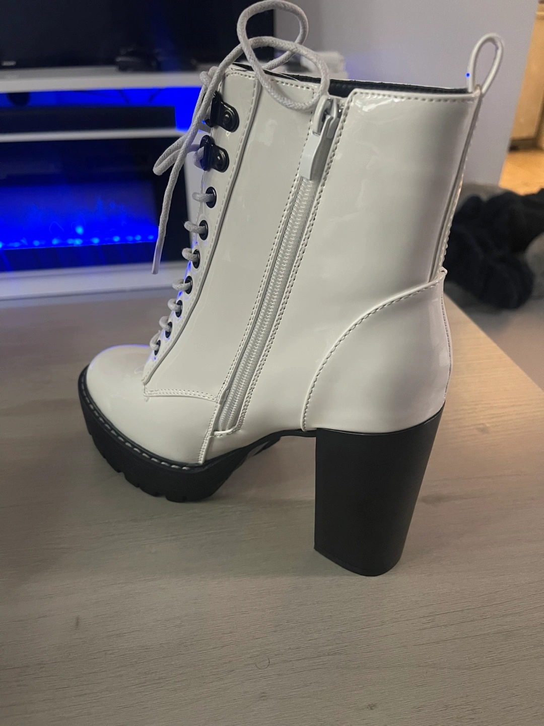 Women's white platform boots. Features a chunky heel, lace-up front, and side zipper. Patent leather material. Perfect for fall and winter.