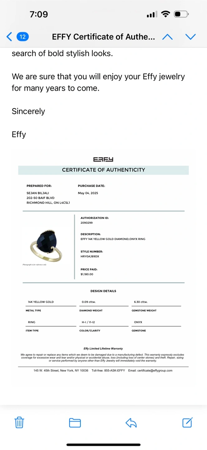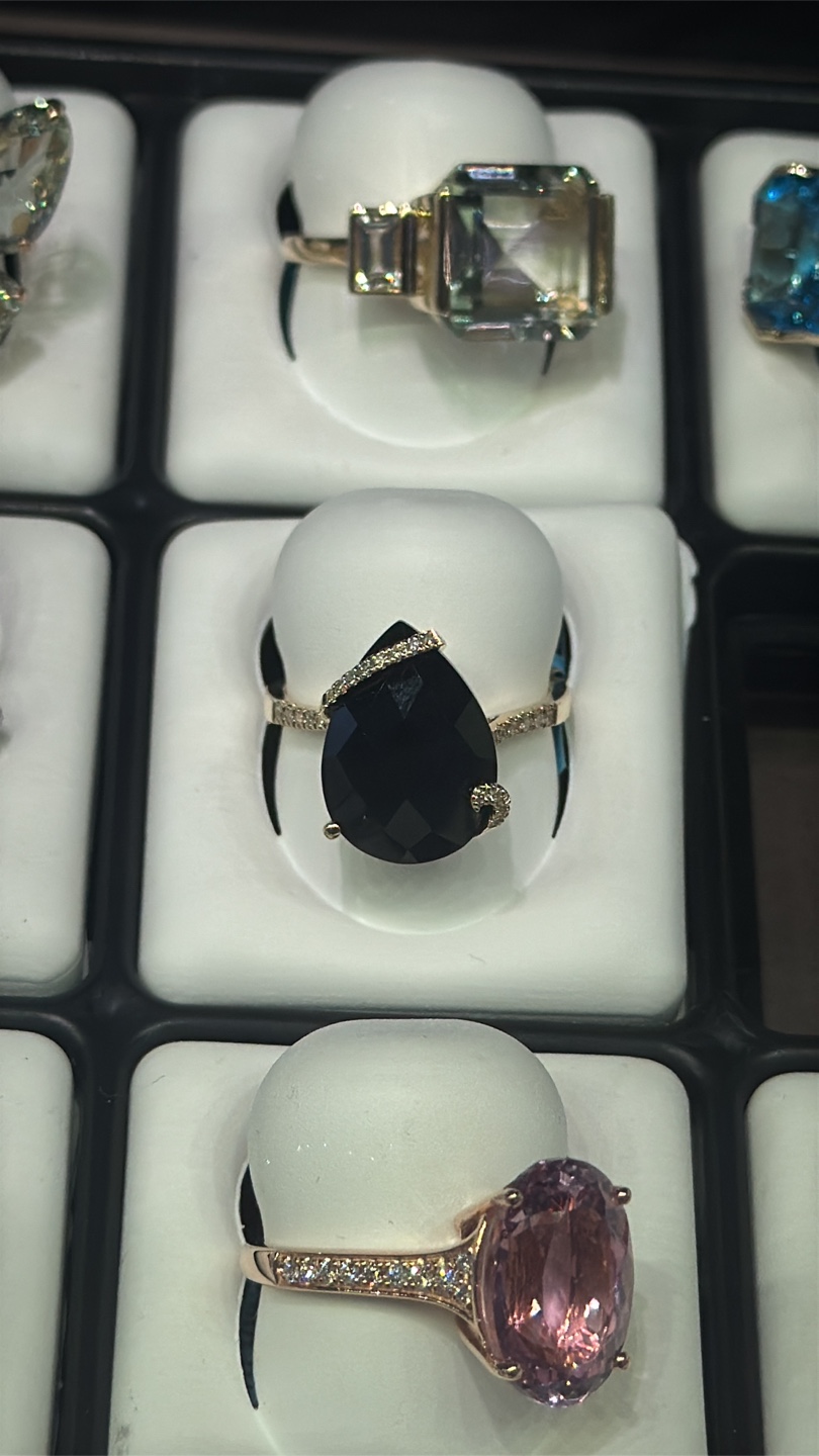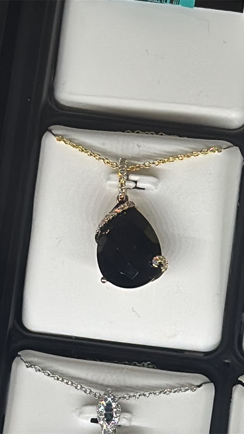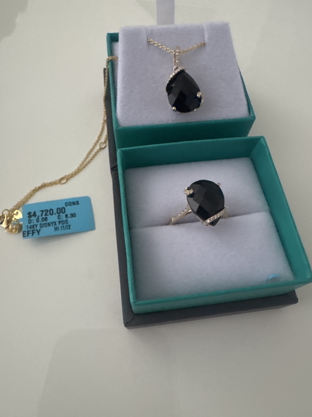 Stunning Effy jewellery set. Includes a ring and pendant featuring a black onyx gemstone and diamonds. 14K yellow gold. Comes with original boxes and certificate of authenticity.