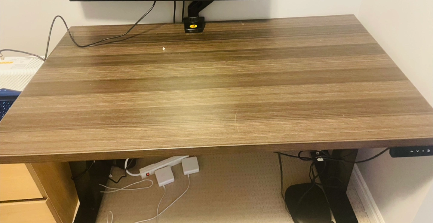 Electric standing desk. Dark brown wood grain top. Black frame. Good condition.
