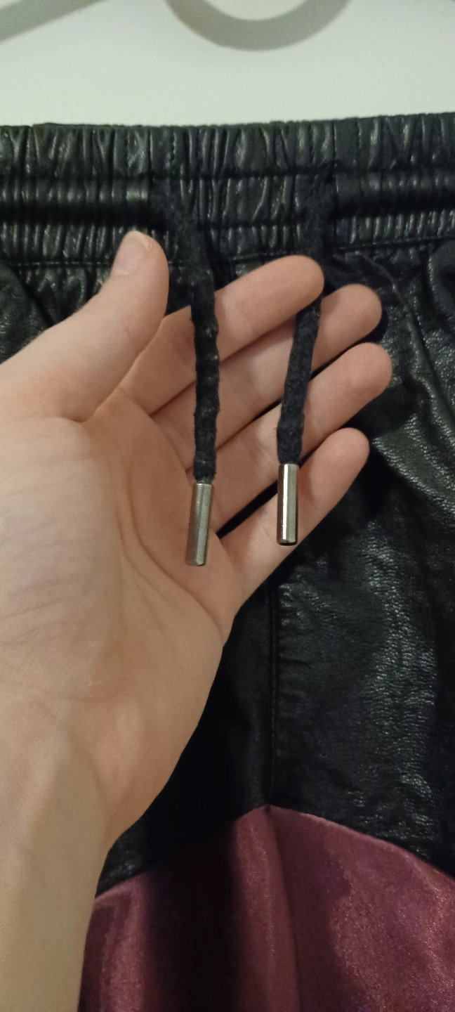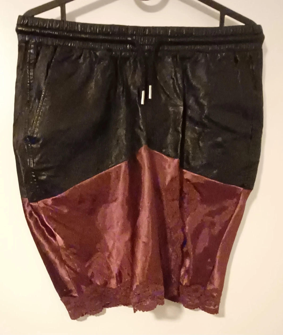 Stylish skirt. Two-toned design. Features a black leather-like top and a burgundy satin bottom. Finished with delicate lace trim. Elastic waistband. Great for a unique look. Has pockets! One of a kind design and rad-cycled from old pants and a lingerie top💫✨️♻️
