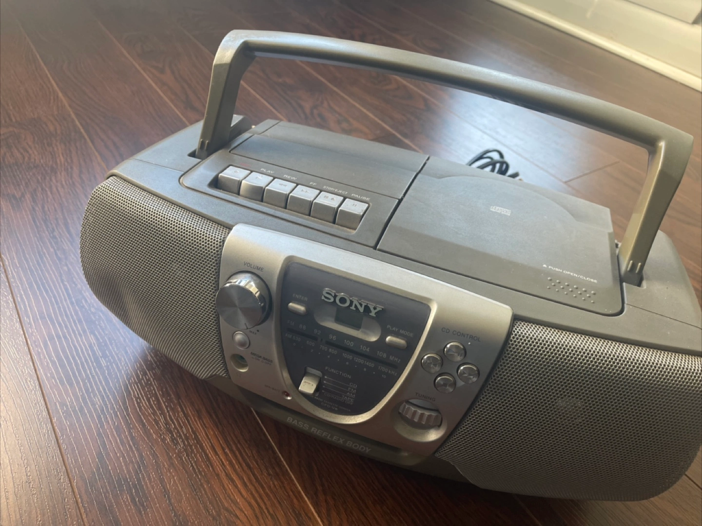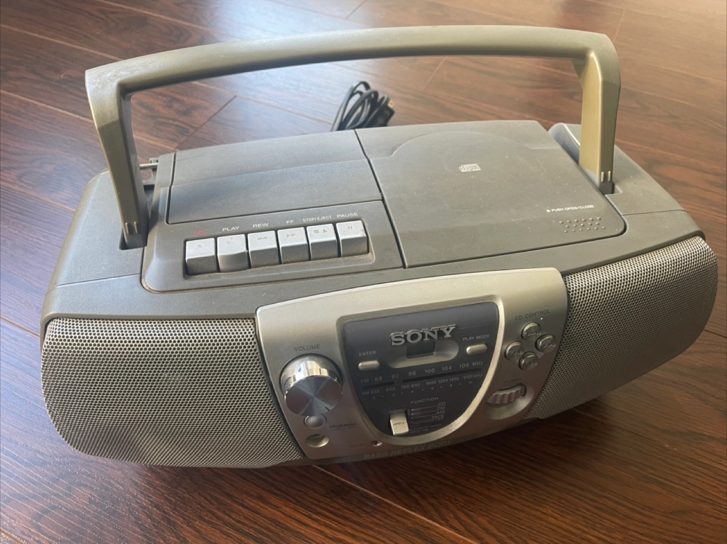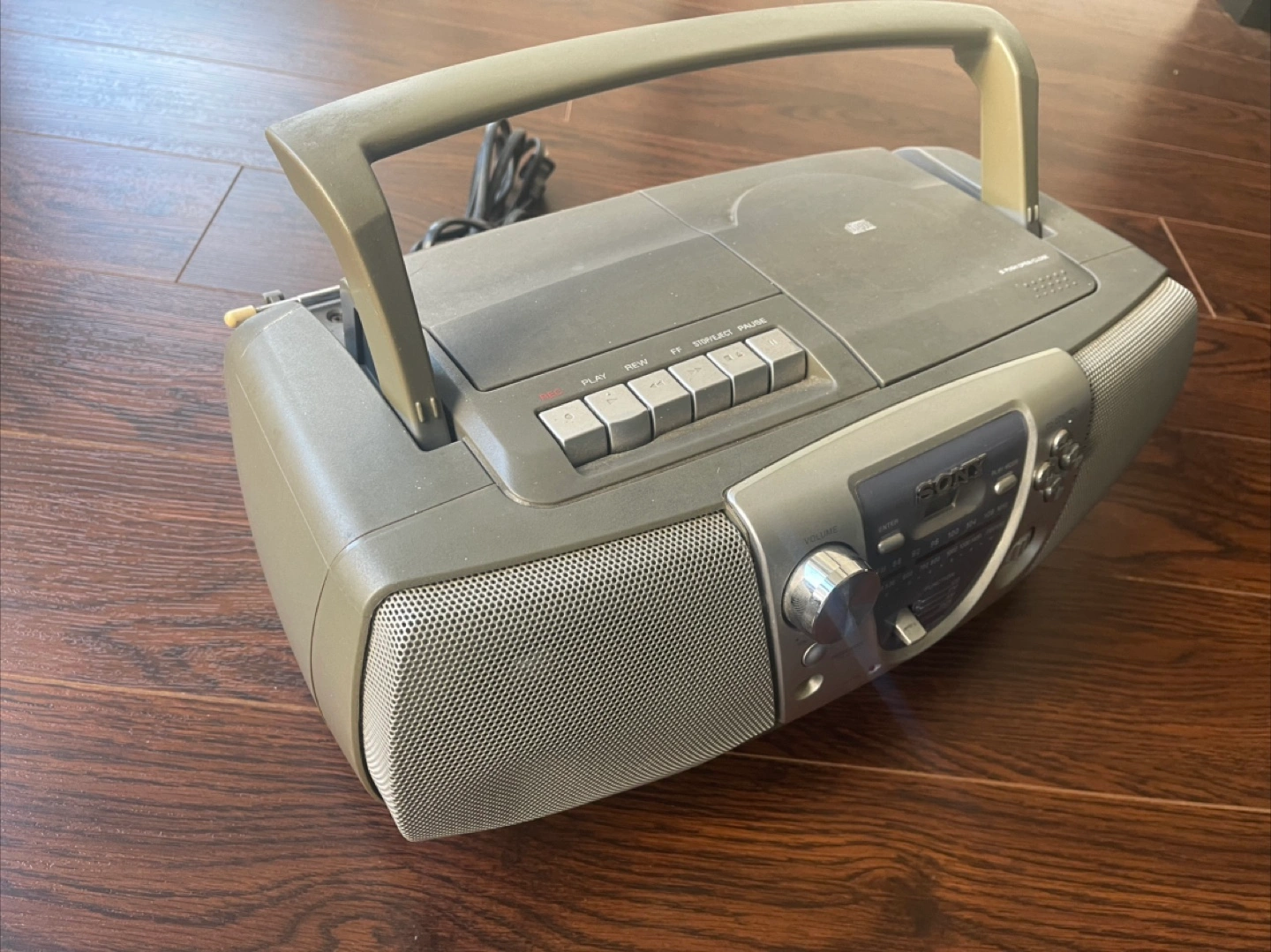 Portable CD player and radio. Features a built-in handle for easy portability. Plays CDs and radio. Includes power cord.