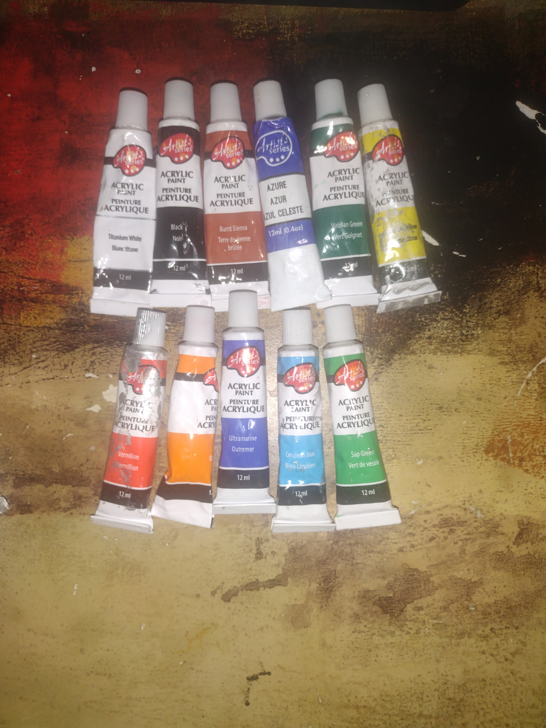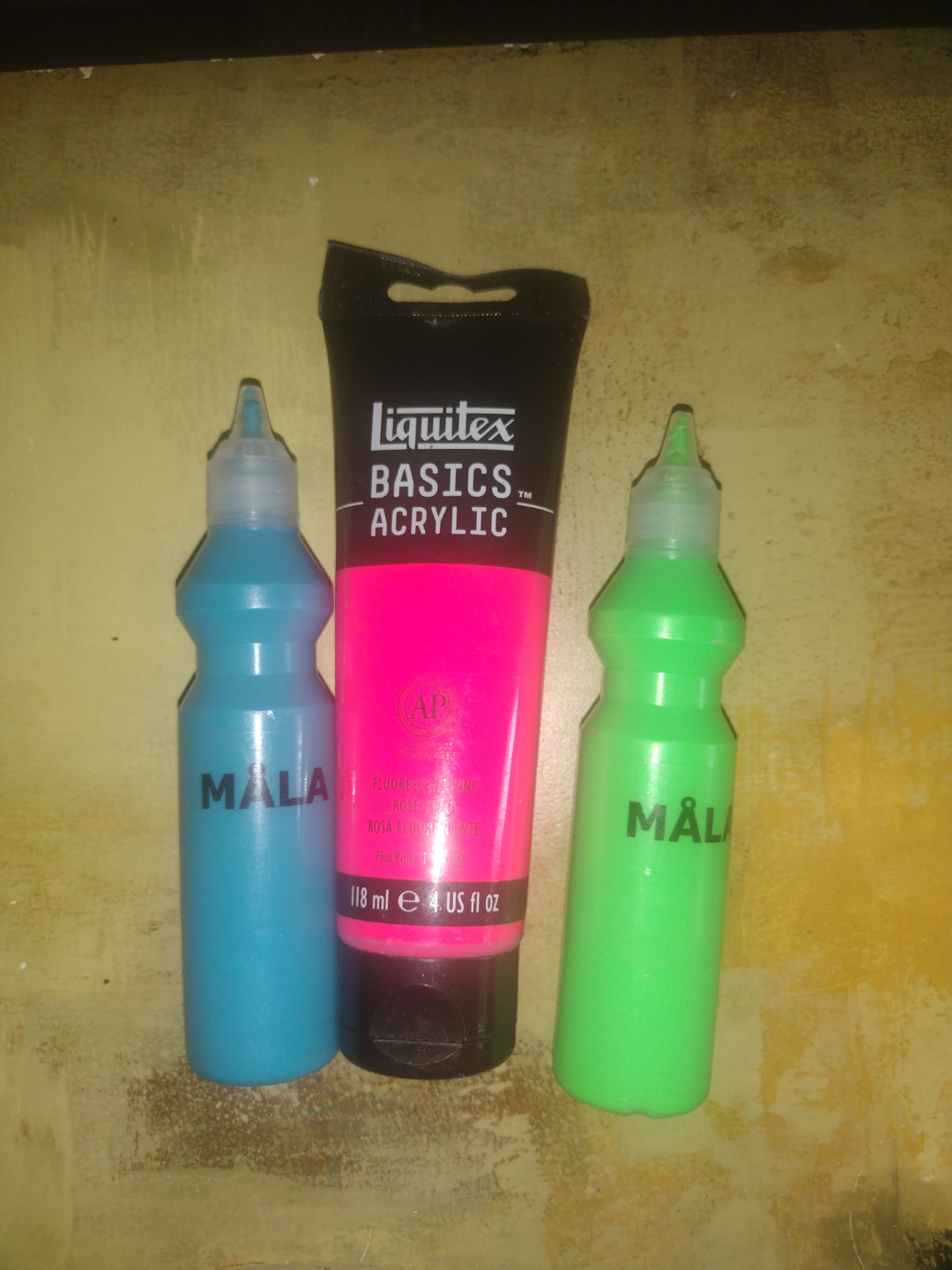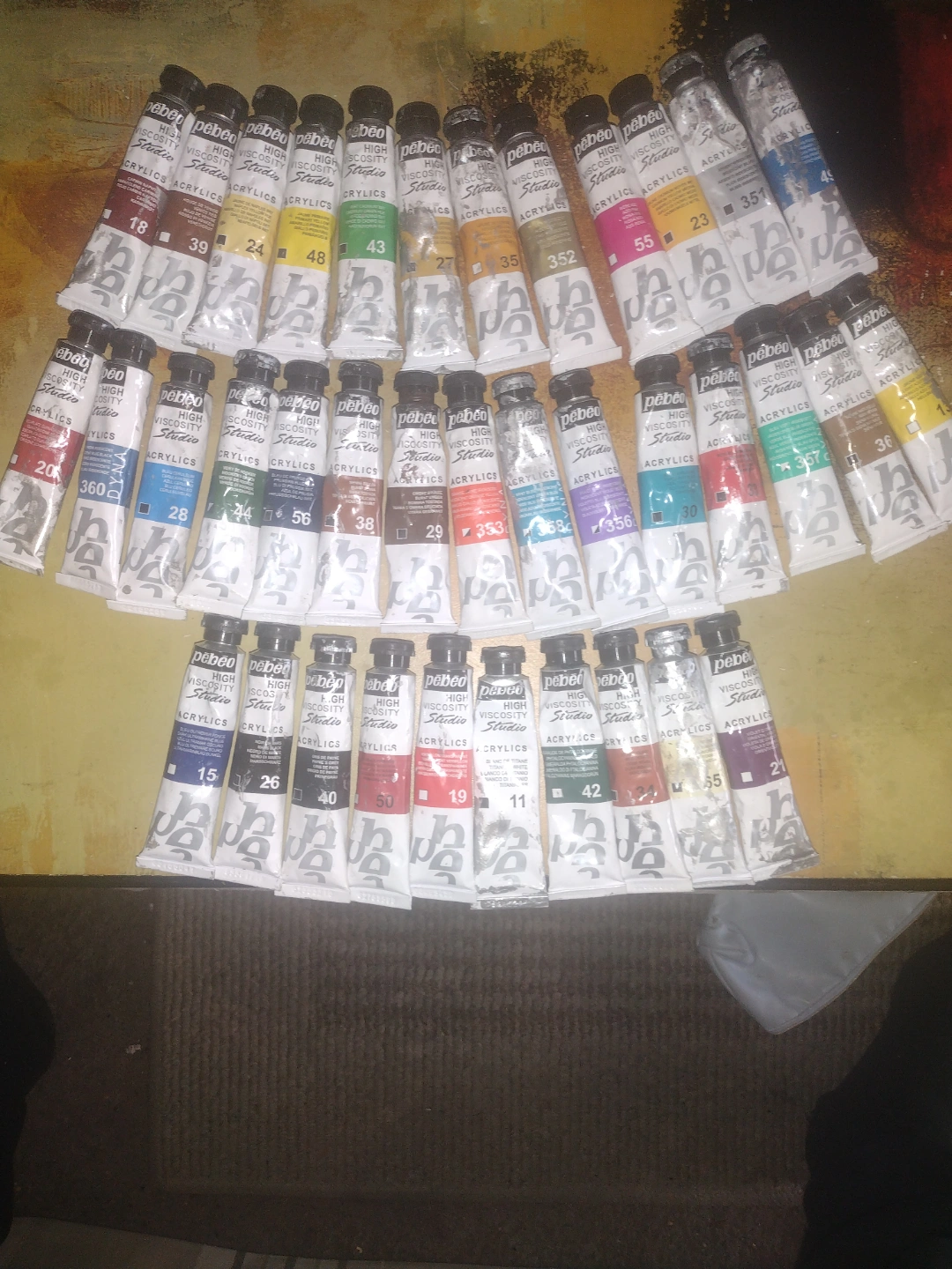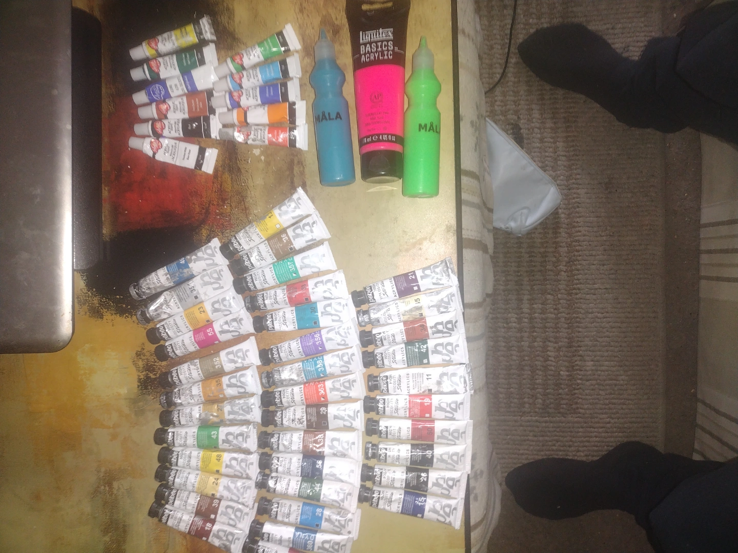 Huge assortment of acrylic paints. Includes various brands and colours. Many tubes are Pebeo Studio High Viscosity Acrylics. Also includes Liquitex Basics Acrylics and Mala fluorescent paints. Some Artist's acrylic paints included as well. Great for students or hobbyists. All are full