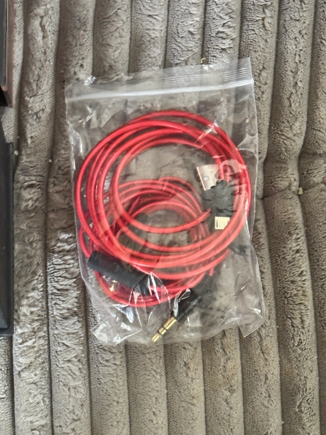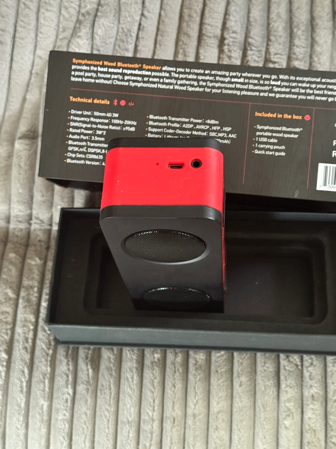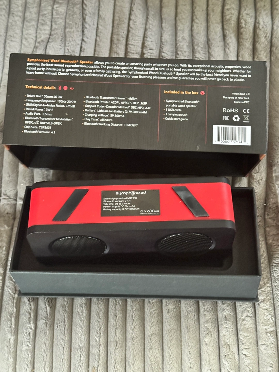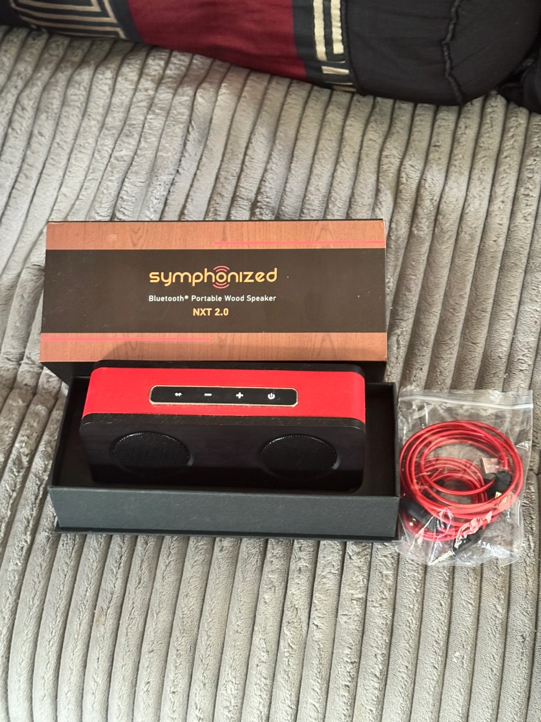 Portable Bluetooth speaker. Wood construction. Red and black. Includes USB cable. Excellent sound quality. Great for parties, travel, or home use.
