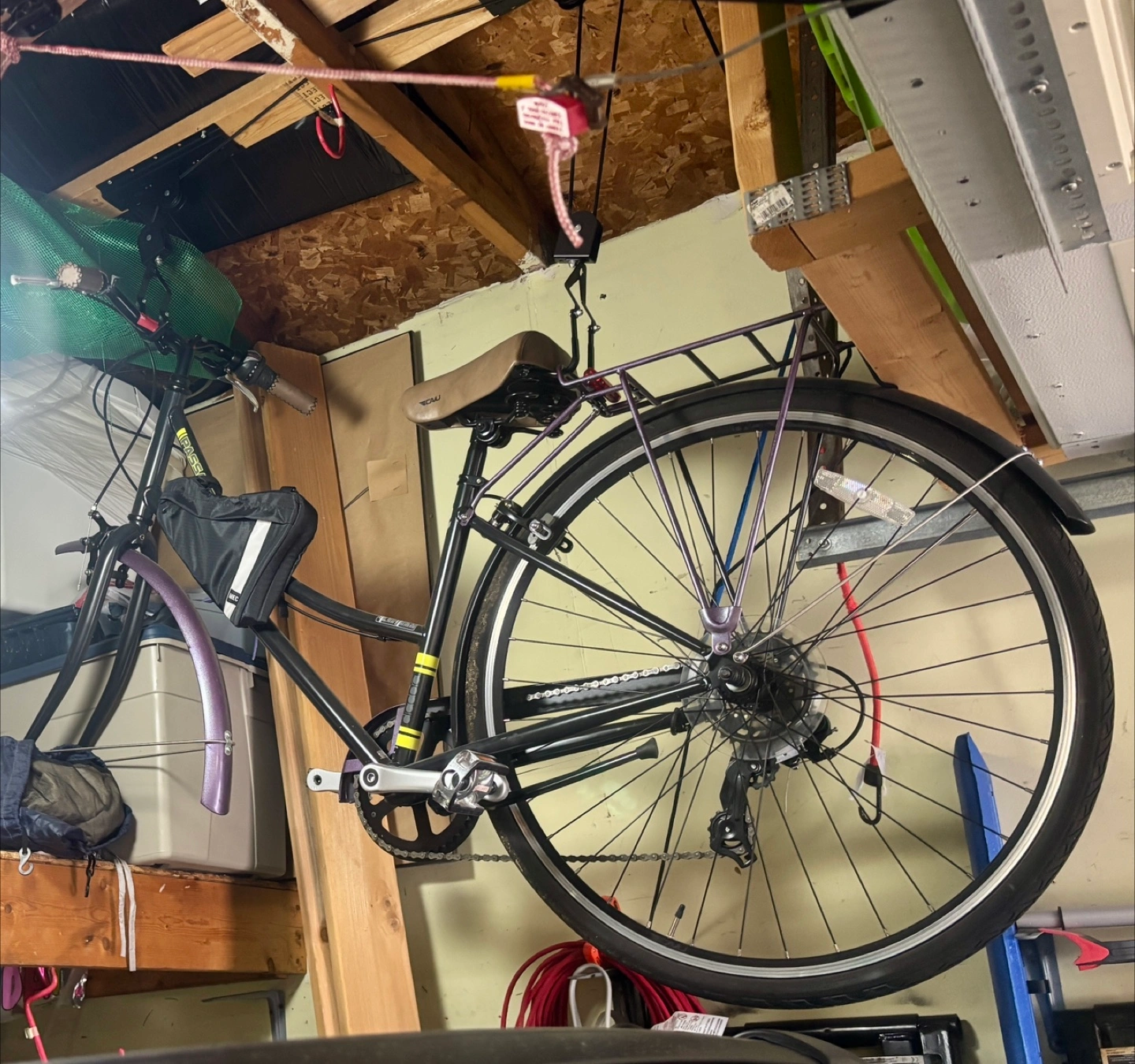 Used once only, women's hybrid bicycle. Dark frame, purple front fender, tan saddle. Includes rear rack, excellent condition, it’s hanging in my garage as you can see in the picture.
