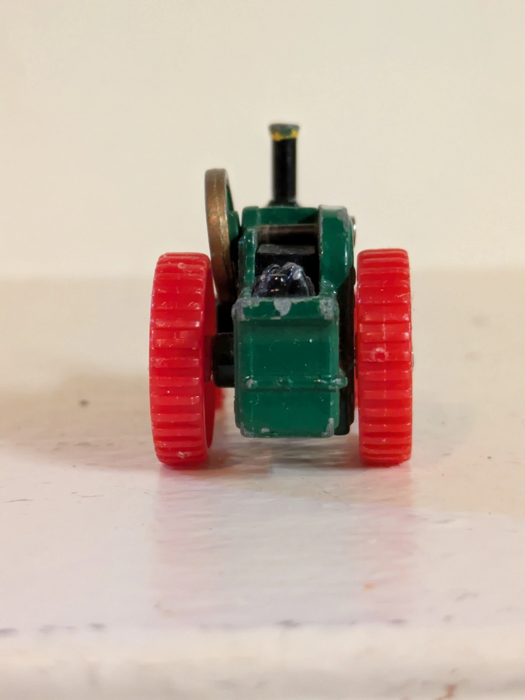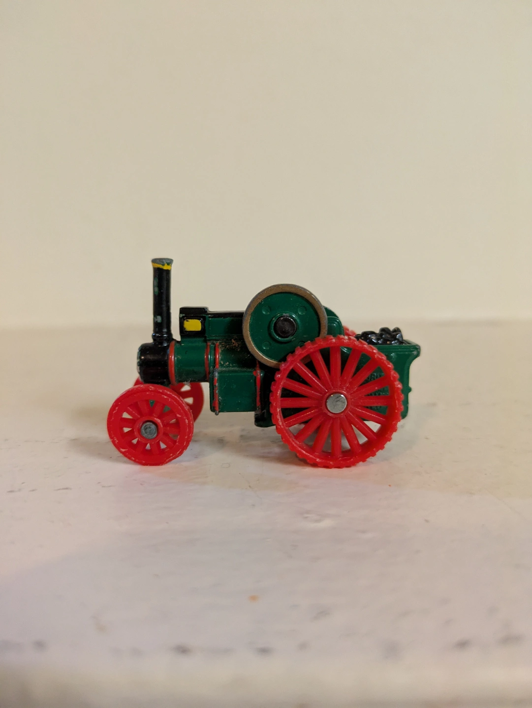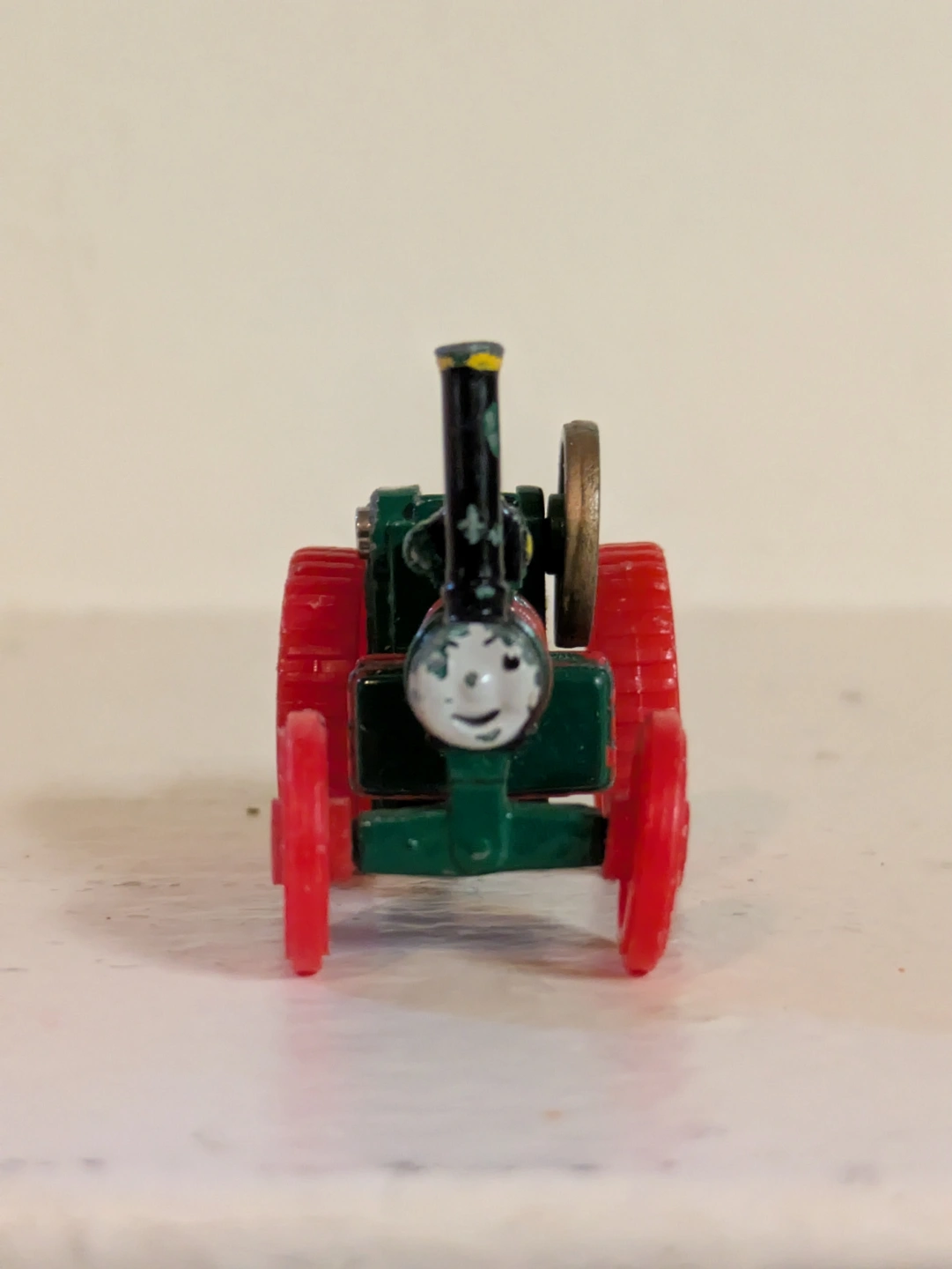 Collectible miniature diecast model of Trevor. ERTL 1991. Green body, red wheels. Shows minor wear. Suitable for collectors or children.