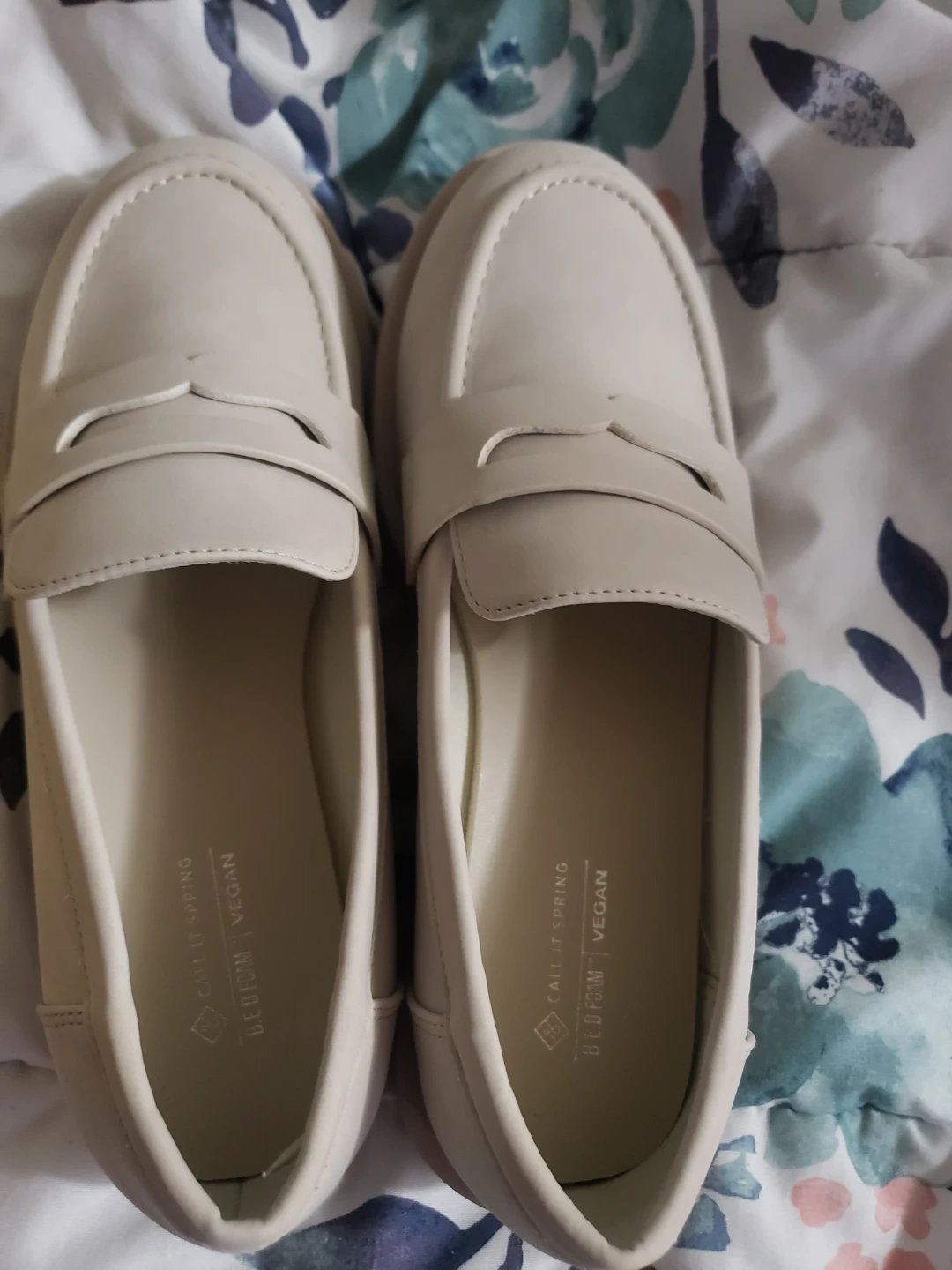 Pair of beige vegan leather loafers. Size 8. Made in China. Minimalist design. Excellent condition.
