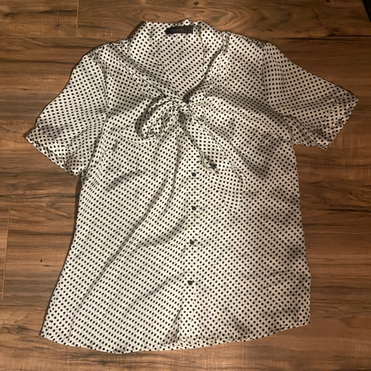 White and black polka dot blouse. Short sleeves. Neck tie. Button front. Size large.