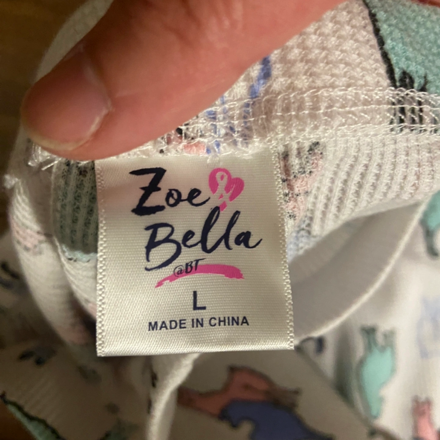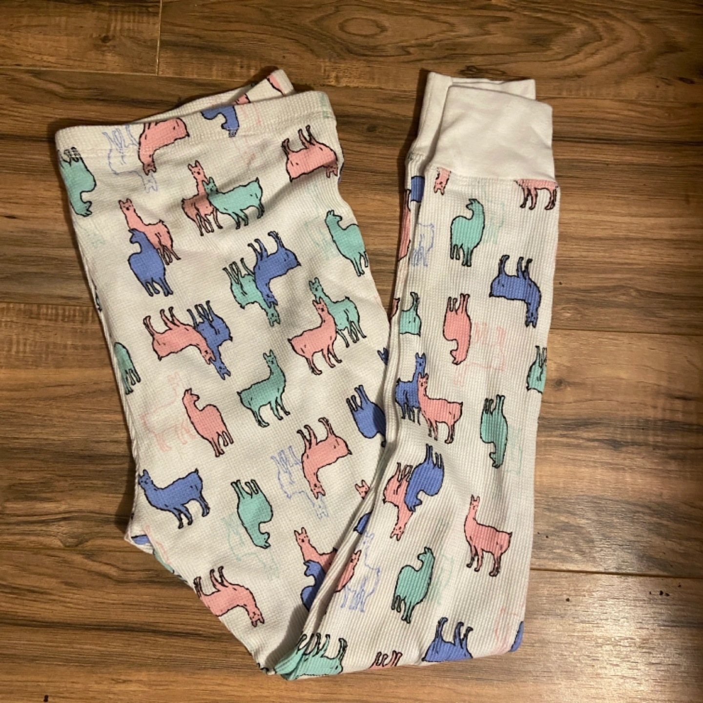 Cozy waffle-knit pajama pants. Cute llama print. Size large. Made in China.