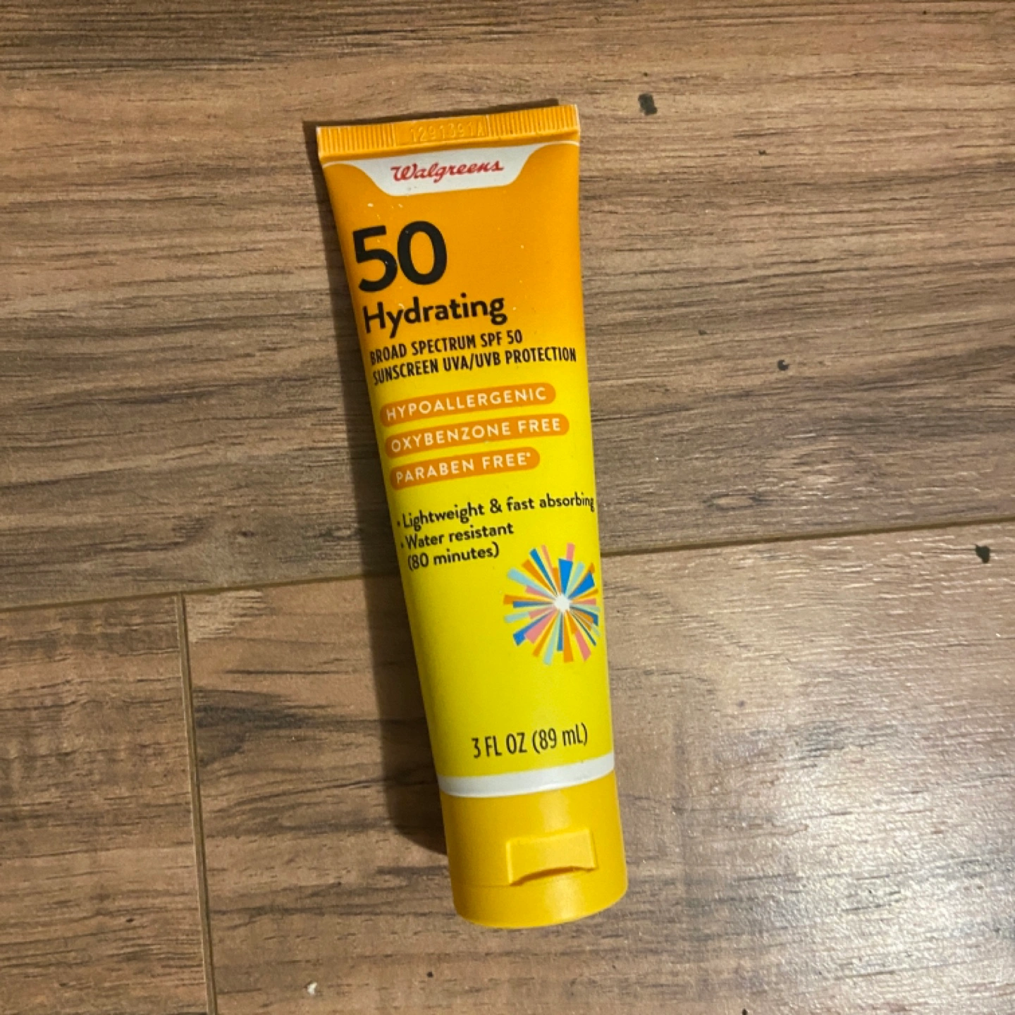 3 fl oz tube of SPF 50 sunscreen. Hypoallergenic, oxybenzone free, paraben free. Lightweight and fast absorbing. Water resistant for 80 minutes.