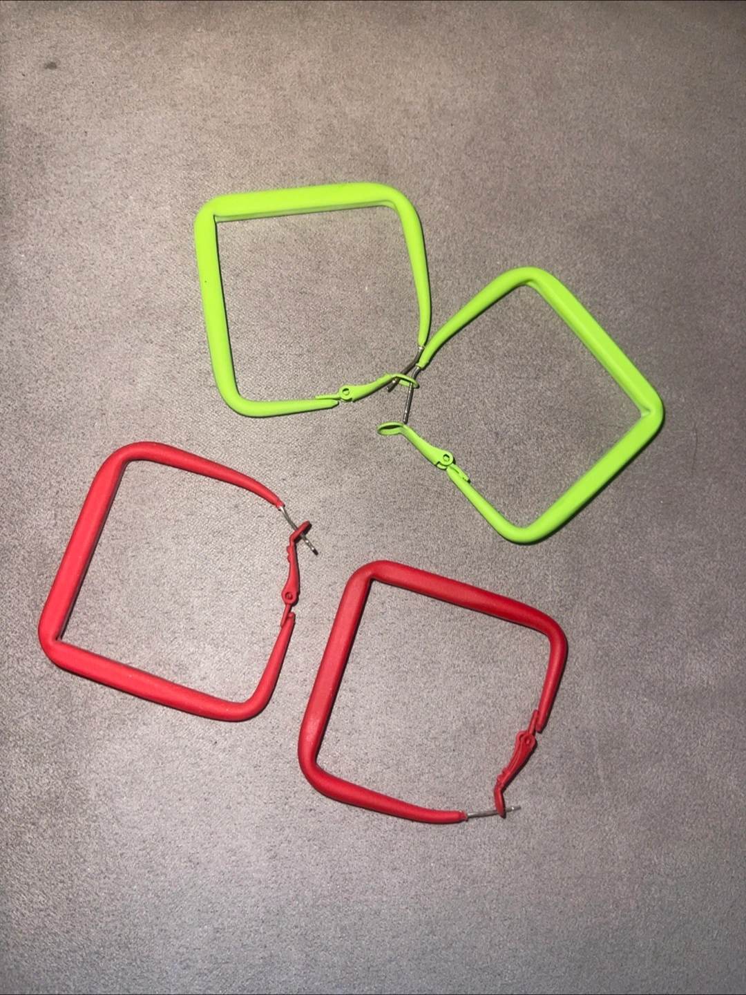 Pair of lime green and red square hoop earrings. Lightweight and fun. Perfect for adding a pop of colour to any outfit.