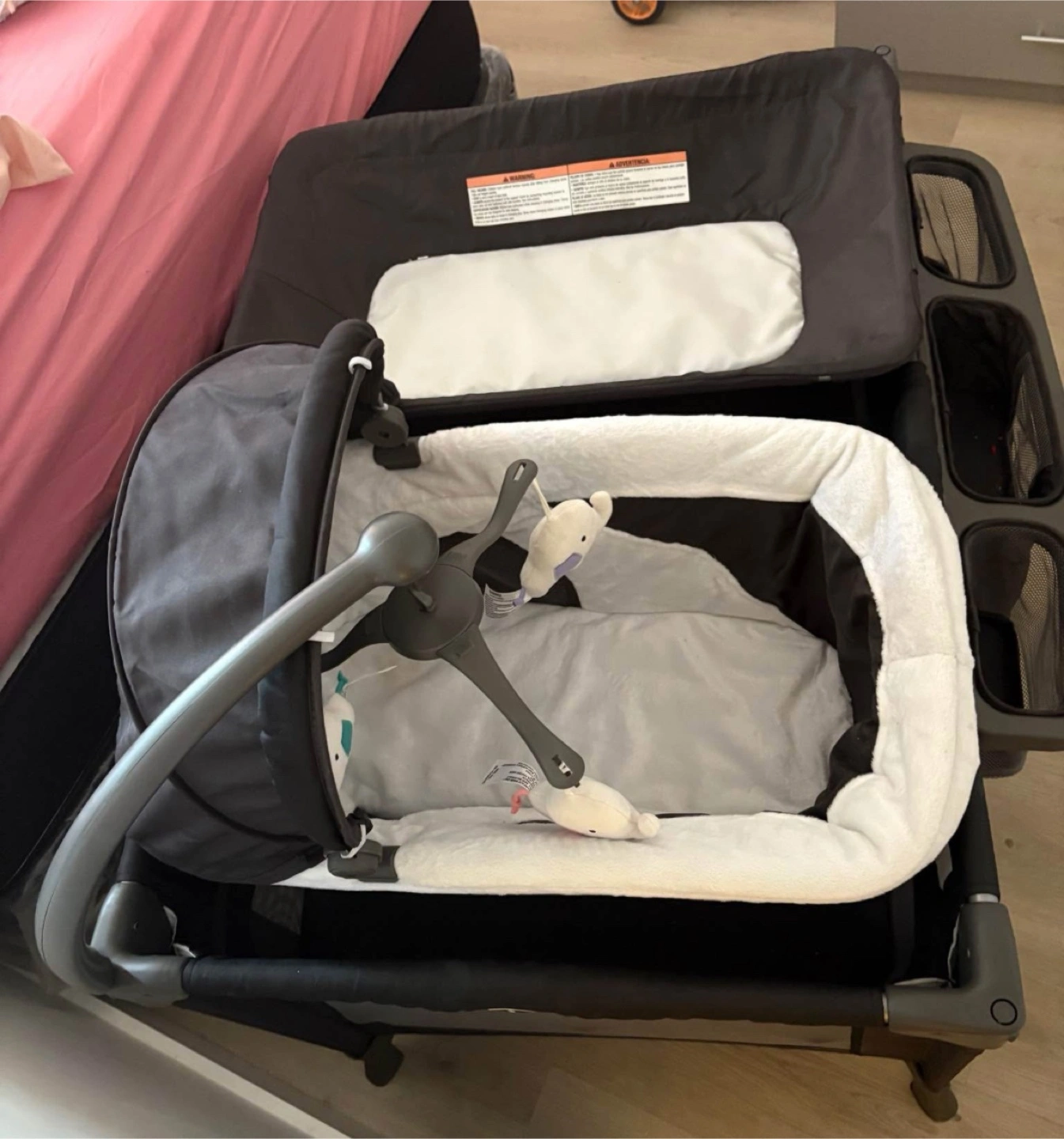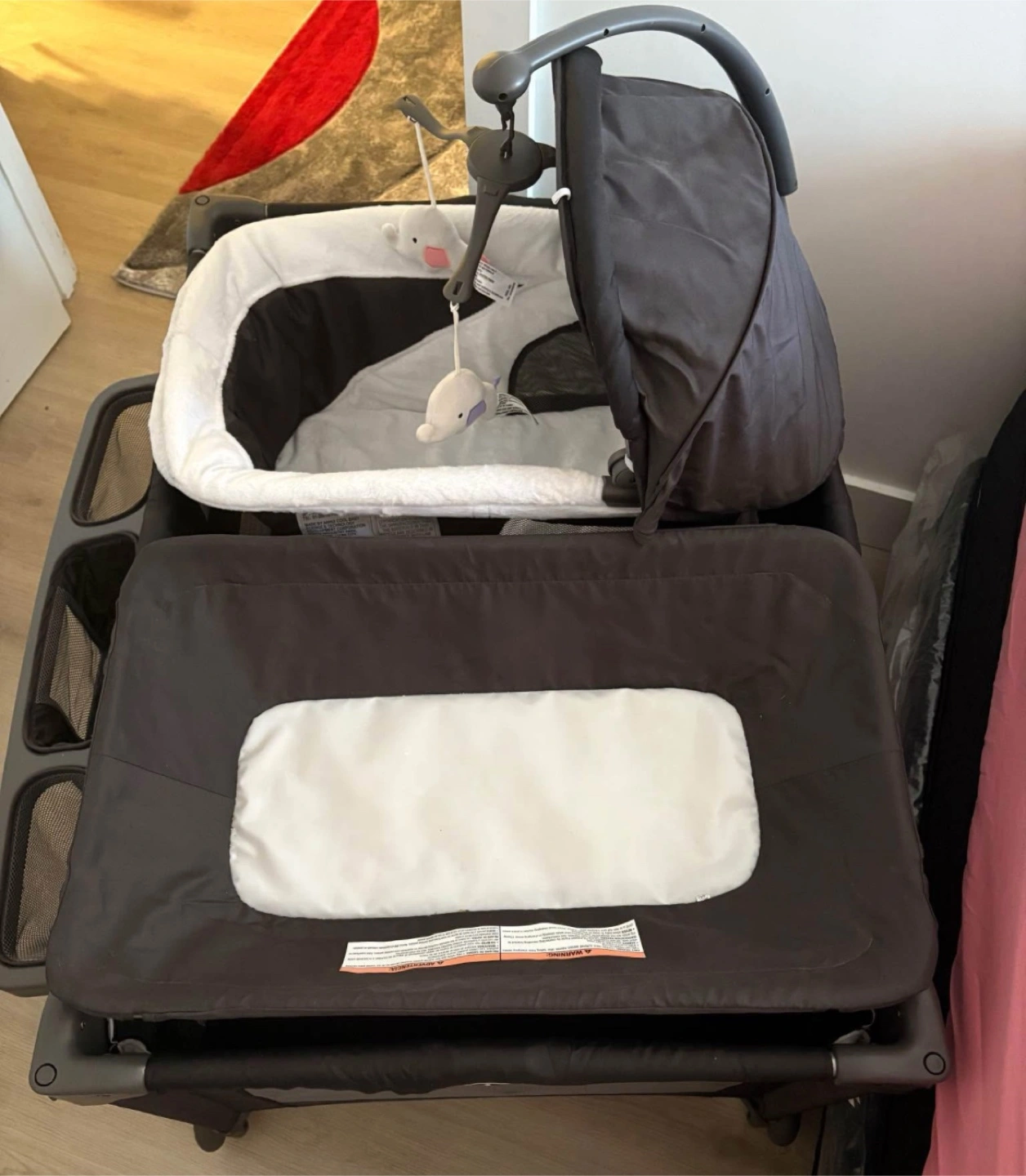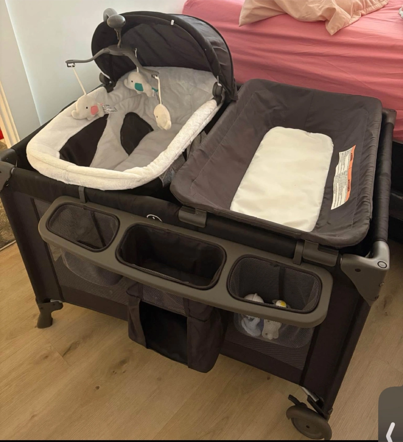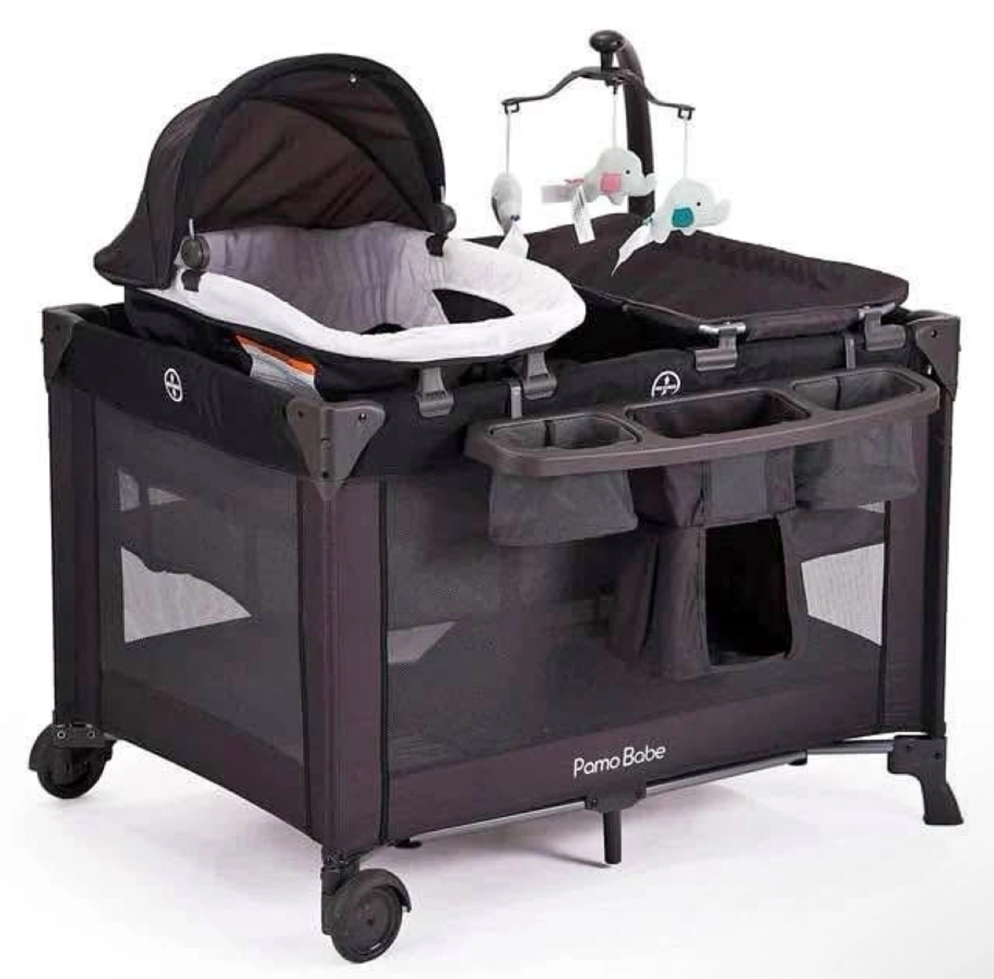 3-in-1 portable crib, bassinet, and changing table. Features a canopy, mobile, and storage. Wheels for easy transport. Great for travel or home use.