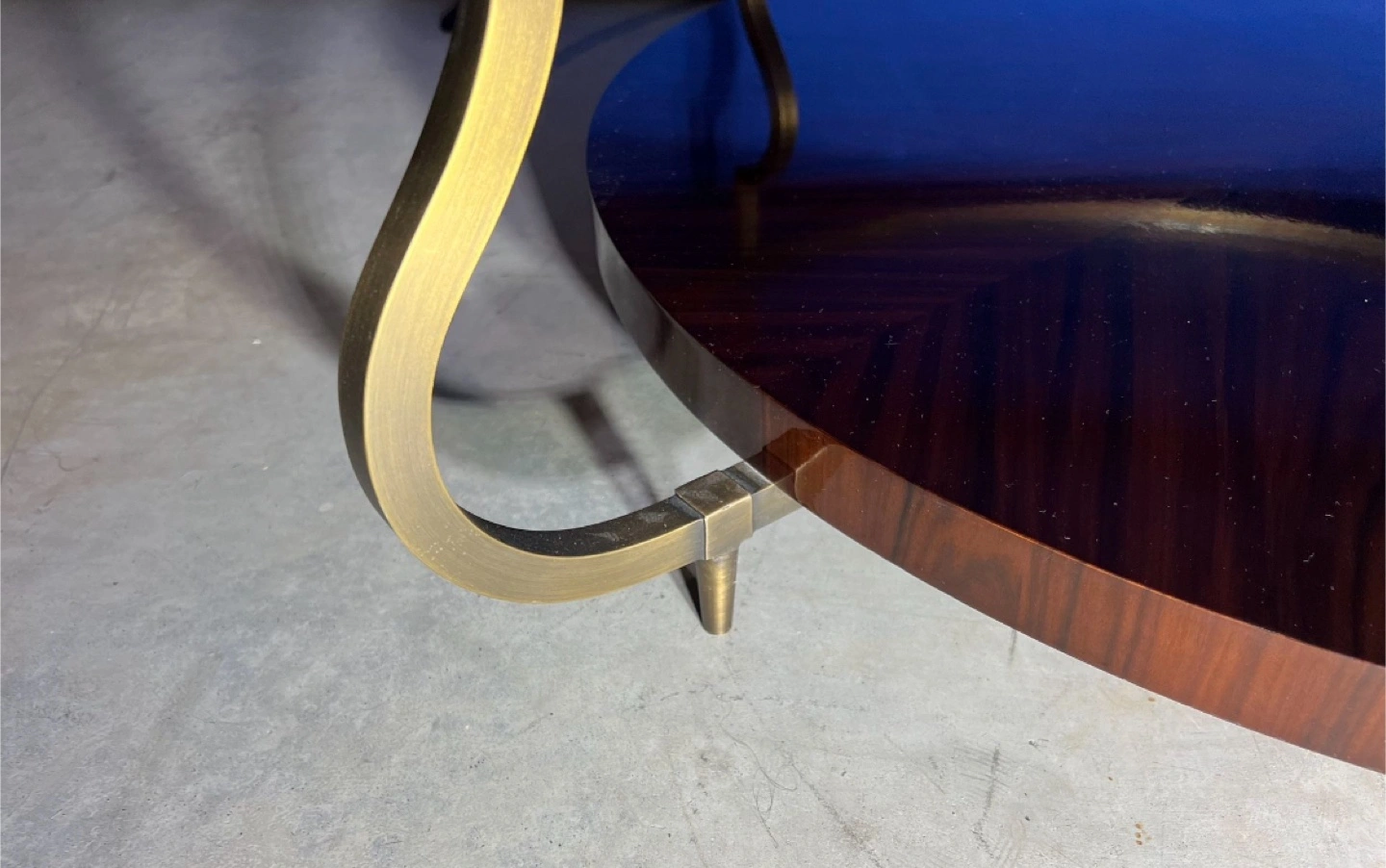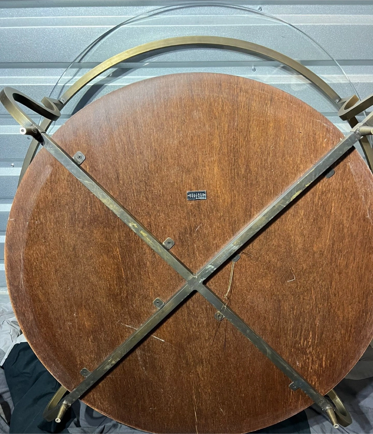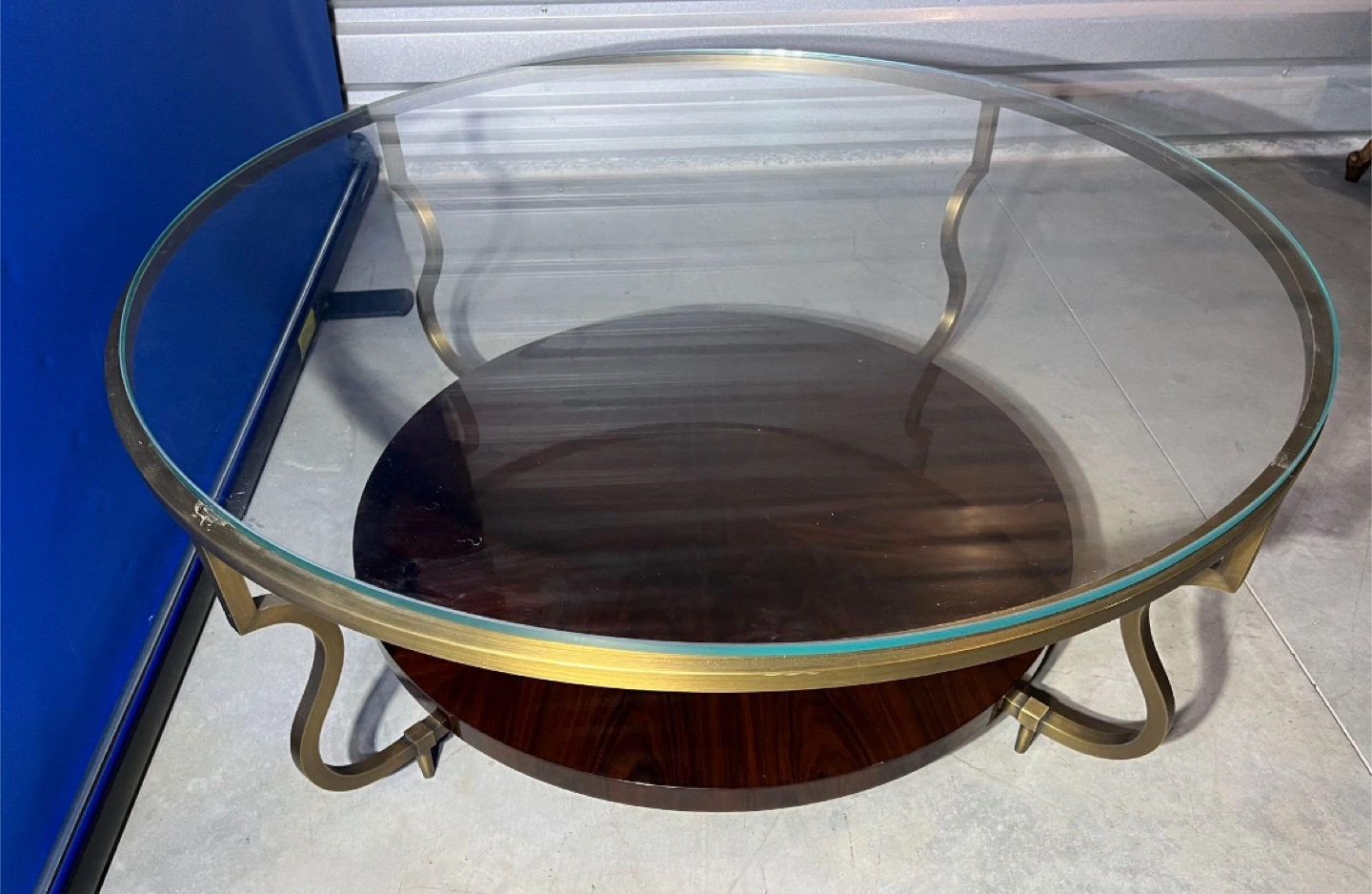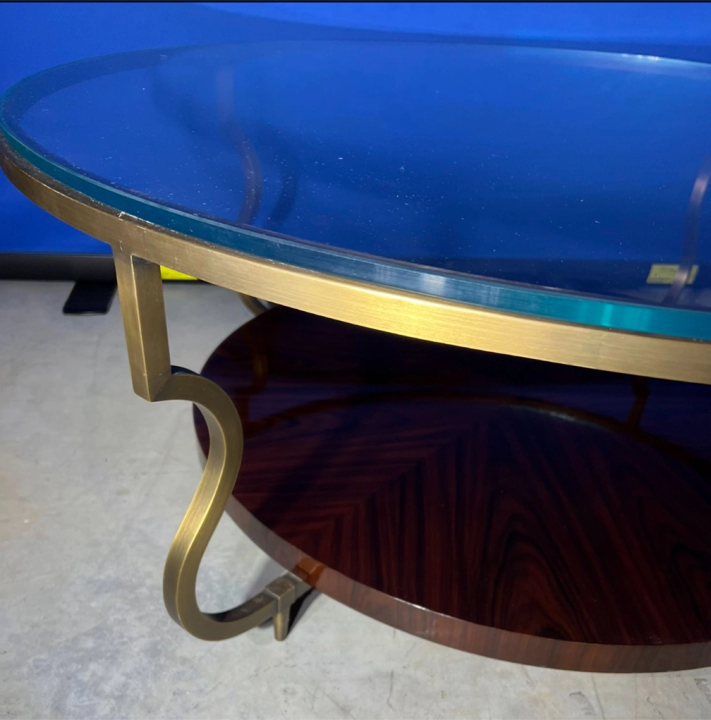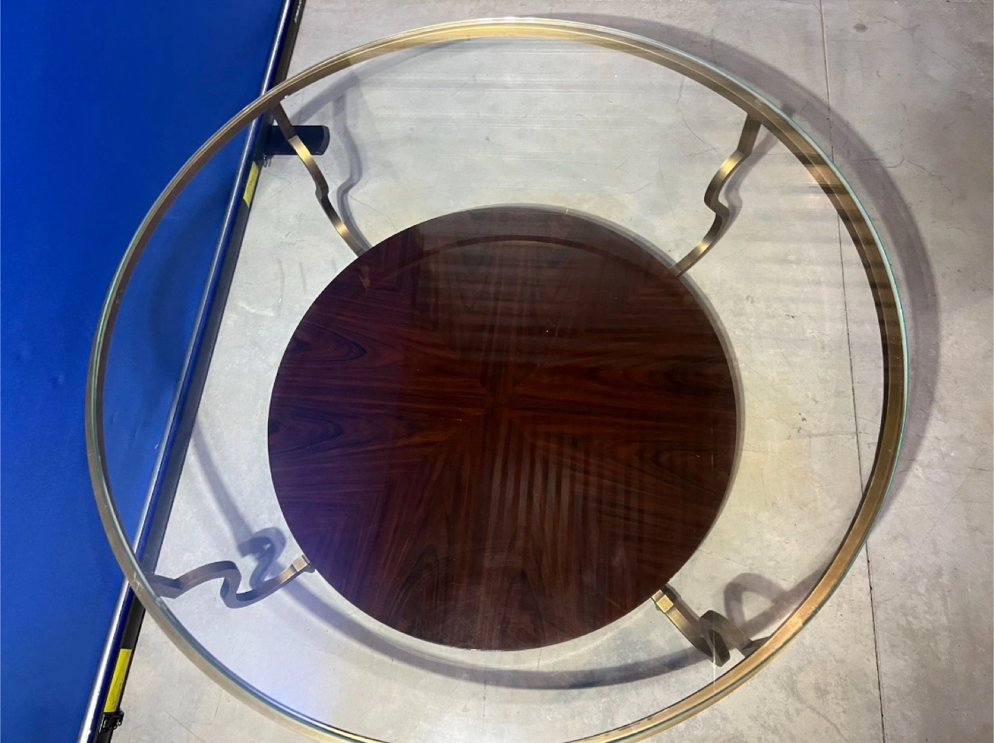 Beautiful coffee table. Features a round glass top and a dark wood lower shelf. Brass metal frame. Unique design. Both pieces are very heavy. Measures 44” all around and 18” in height.