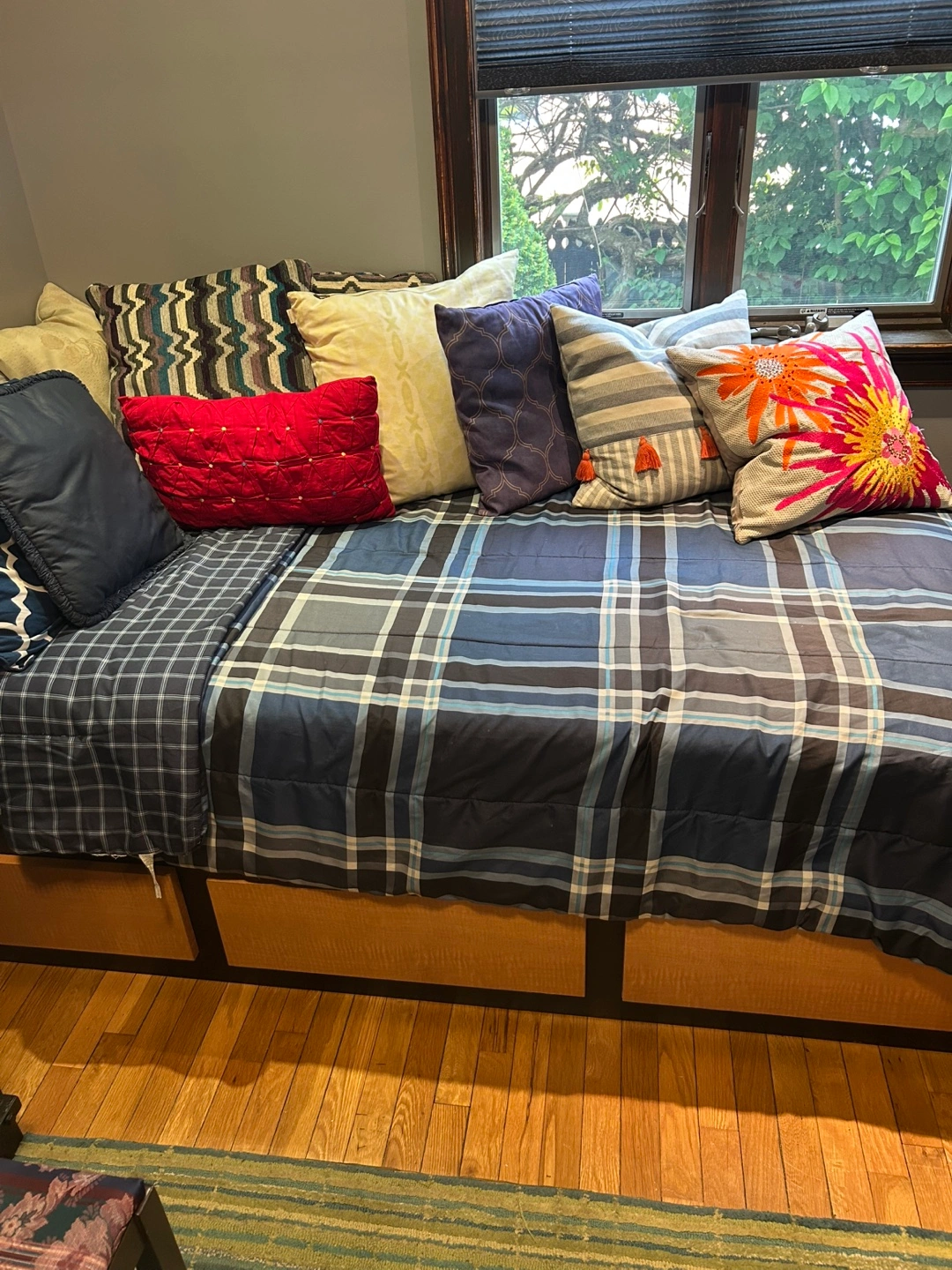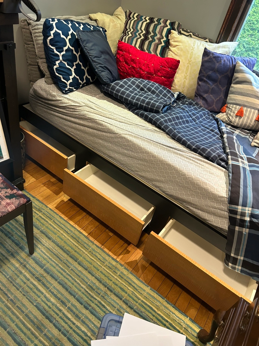 Captain’s bed fits twin mattress also available for additional fee of $50. It’s in good condition. Black base, white interiors, wood-look drawers. The drawers are long and deep. Perfect for small bedrooms needing clothing storage.custom built.