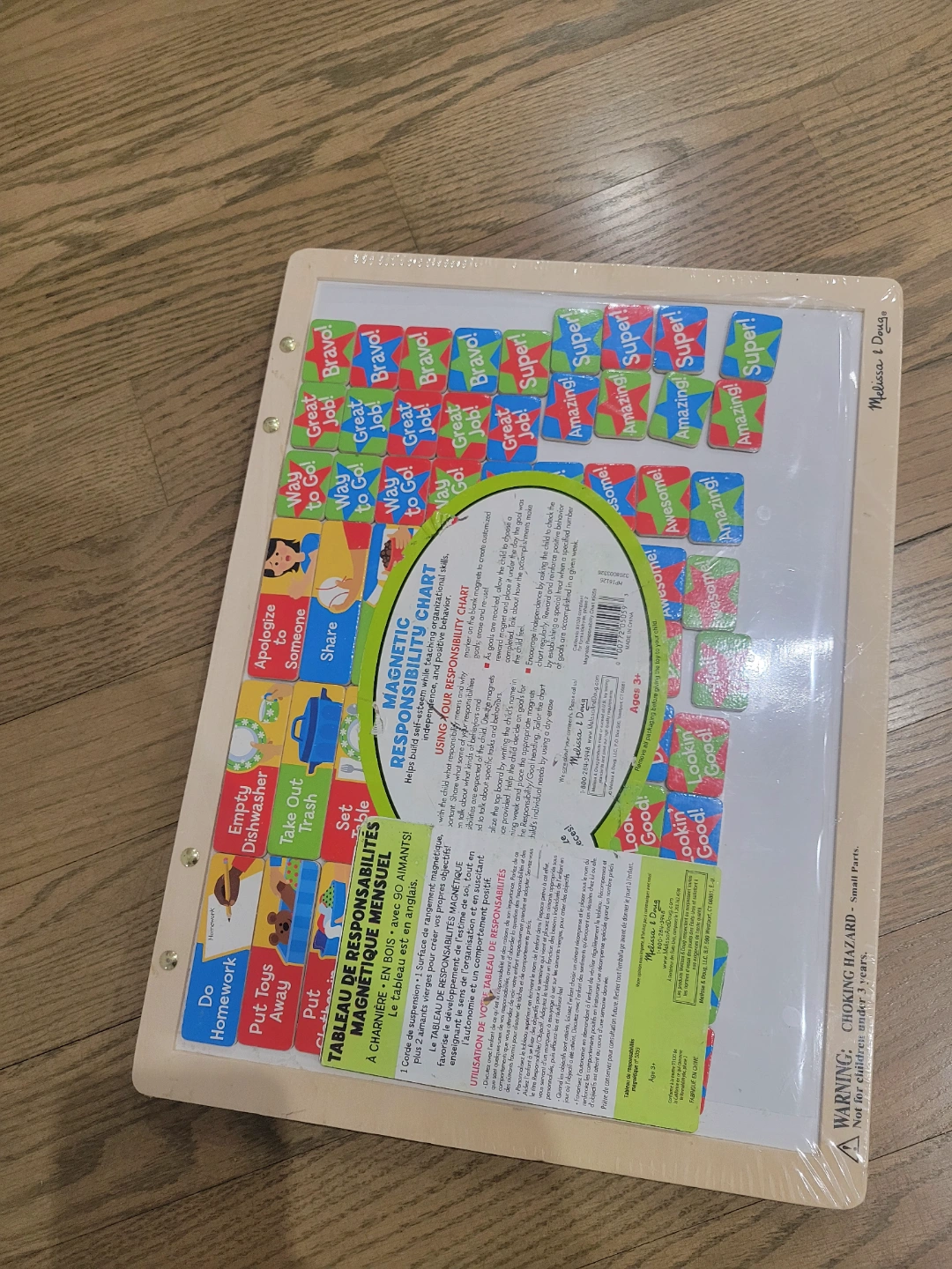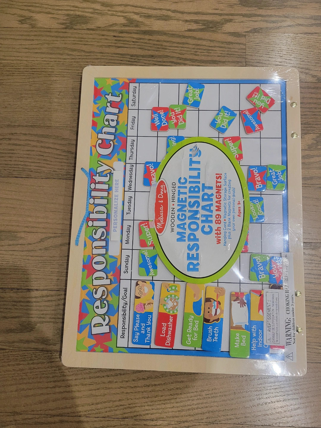 Wooden hinged chart with 39 magnets. Great for children's chore organization. Includes days of the week and various positive reinforcement words. Easy to personalize.