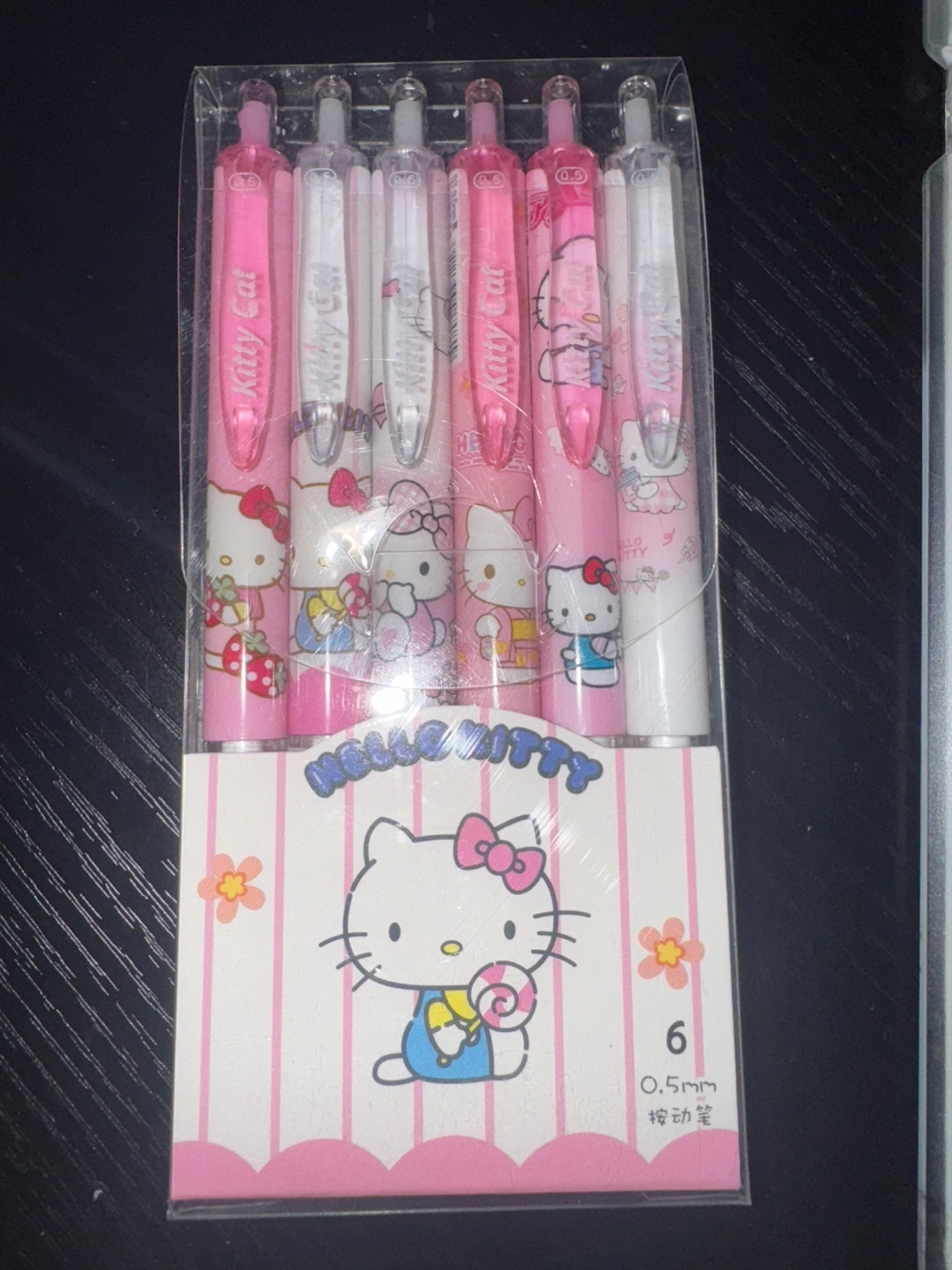 Six Hello Kitty themed gel pens. It’s 5$ for the entire pack. 0.5mm point size. Pink and white colours. Cute designs. New in package.