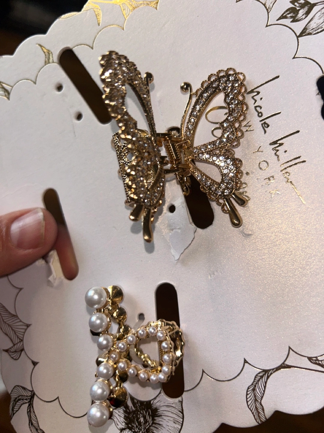 245Gold-tone metal hair clips. One butterfly-shaped clip, one with pearls. New without tags.