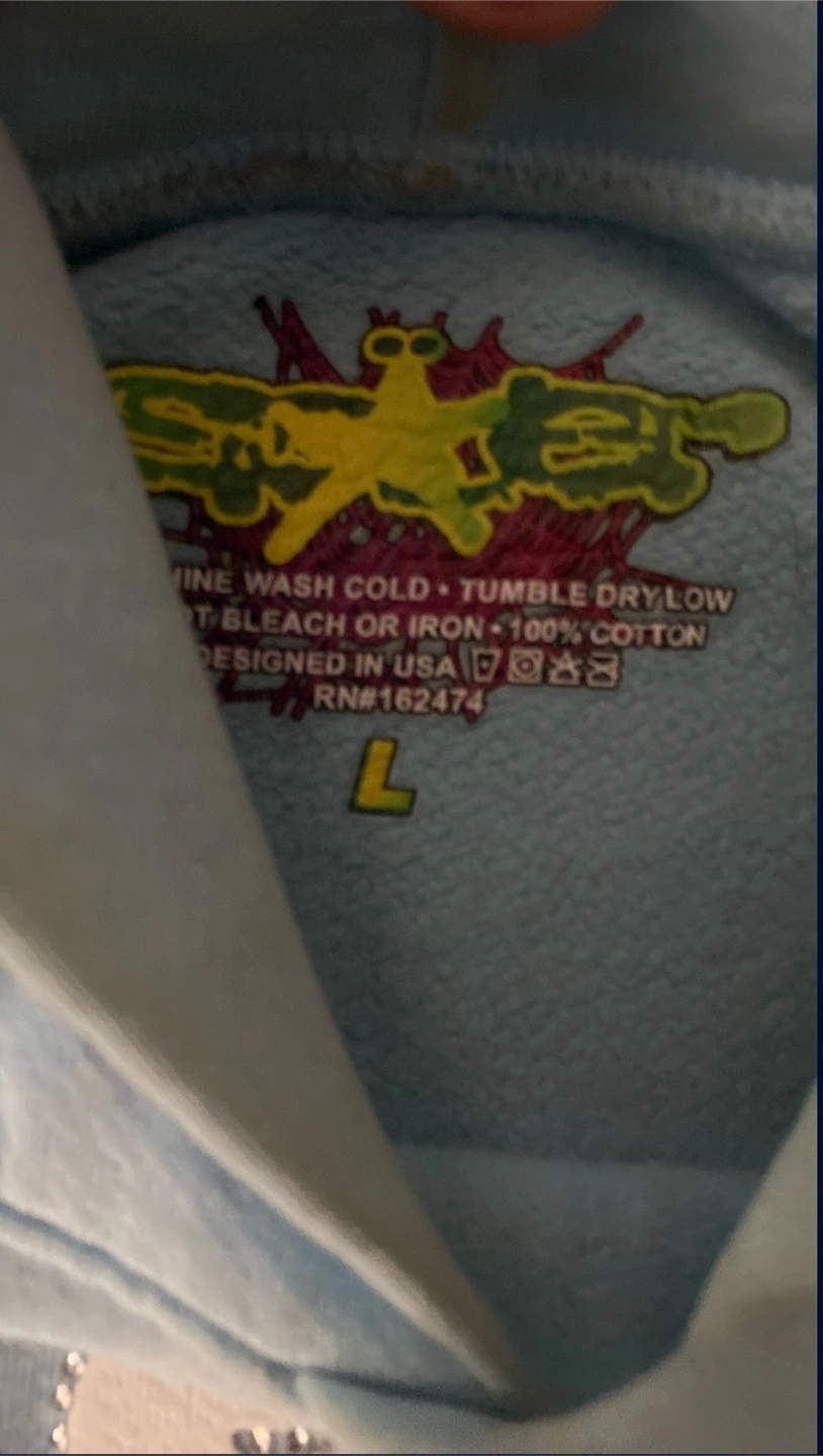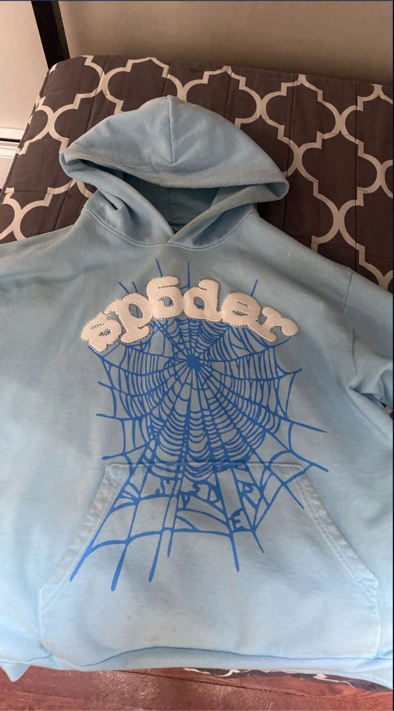 Light blue Spider World hoodie. Size large. Features a spiderweb design and logo. 100% cotton. Machine wash cold.