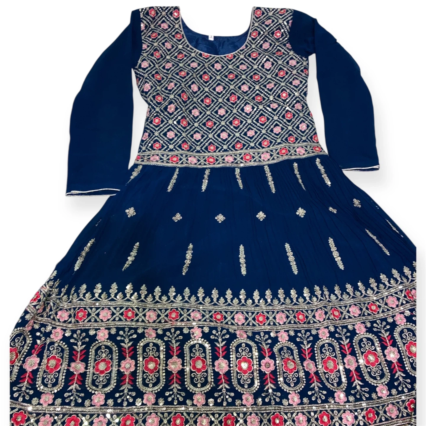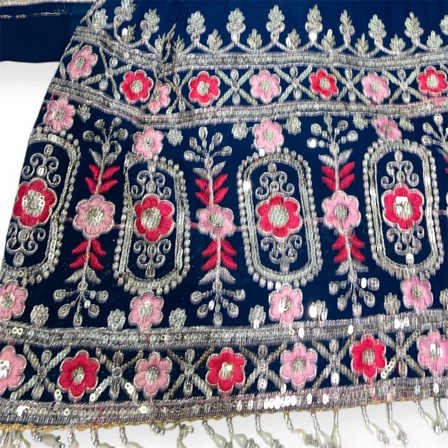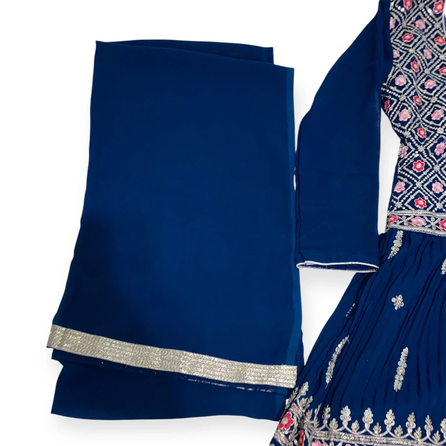 Beautiful navy blue 3-piece suit. Embroidered details. Pleated skirt and top. Matching dupatta. Elegant and festive wear .