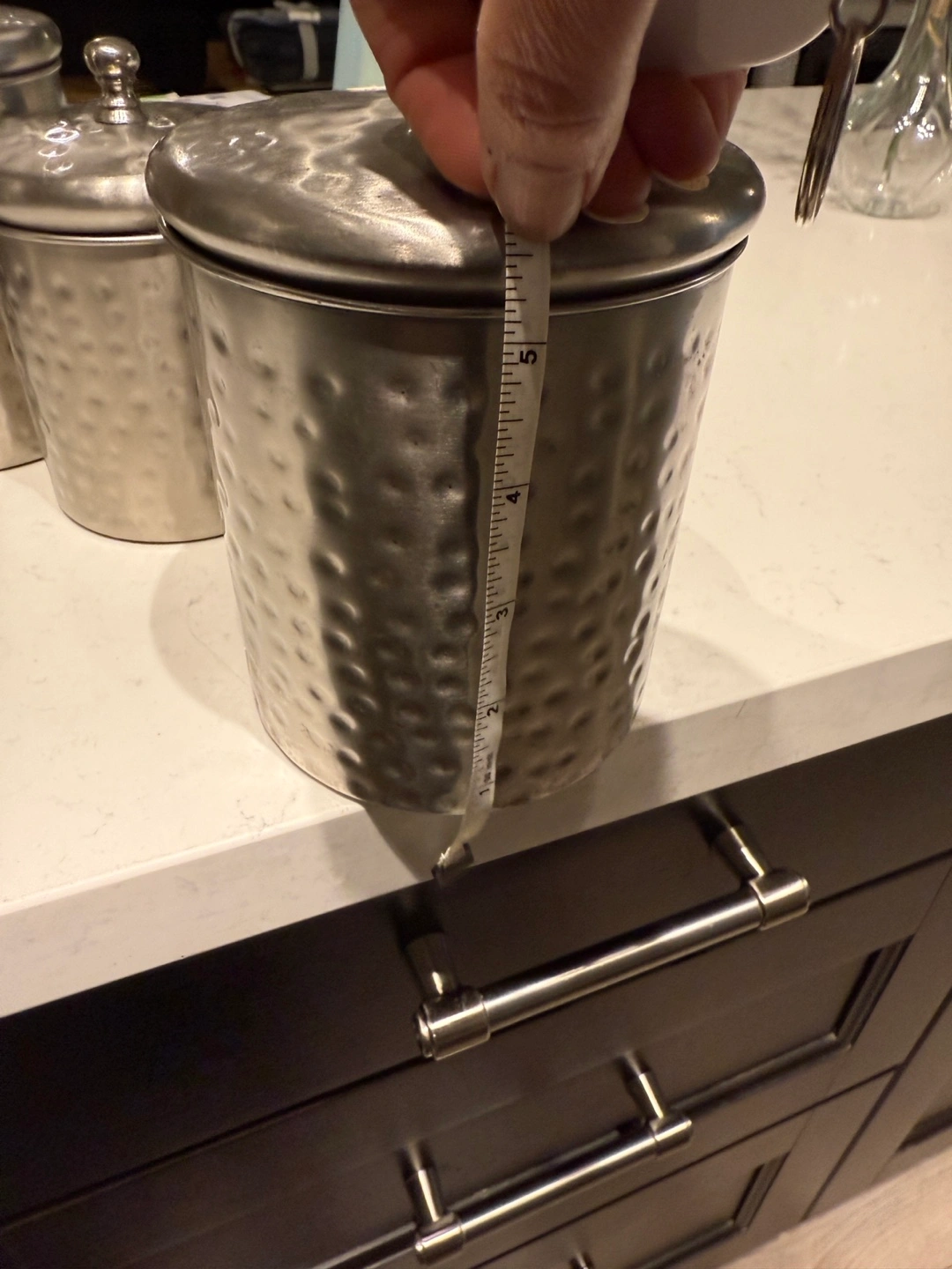Three silver metal canisters with lids. Perfect for storing coffee, tea, sugar, or other pantry staples. Stylish hammered texture.