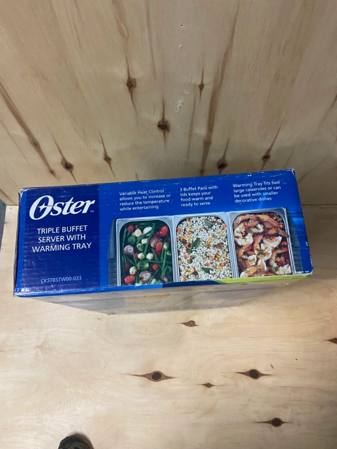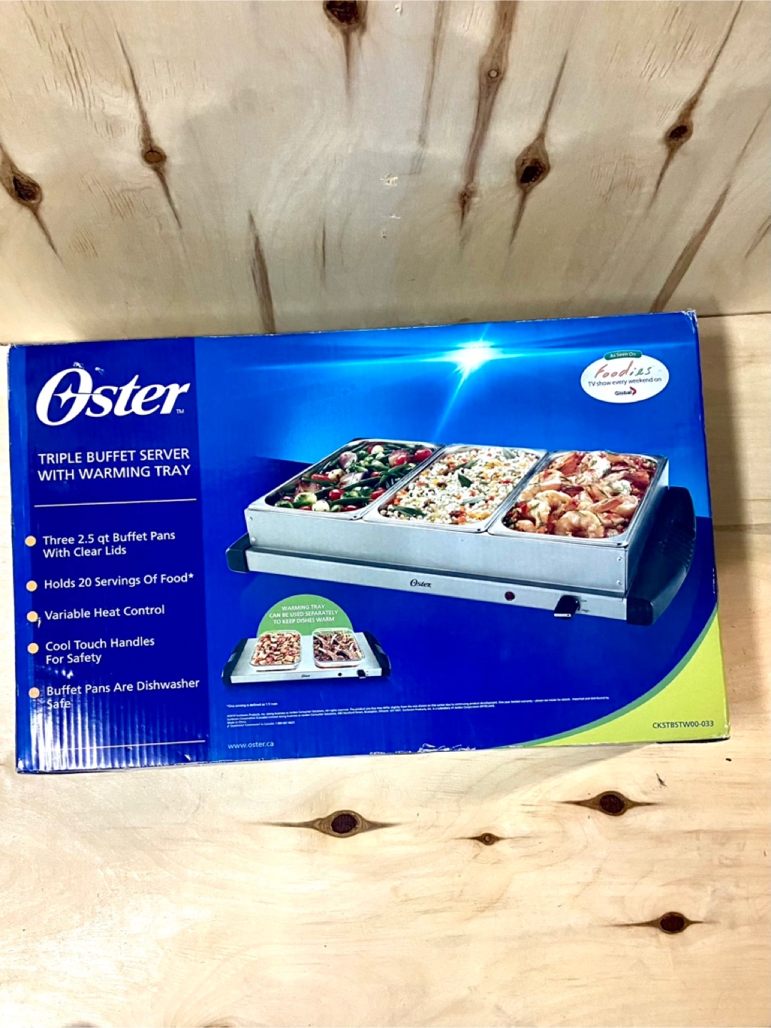 New in box. Three 2.5 qt buffet pans with clear lids. Holds 20 servings of food. Variable heat control. Cool touch handles for safety. Buffet pans are dishwasher safe.