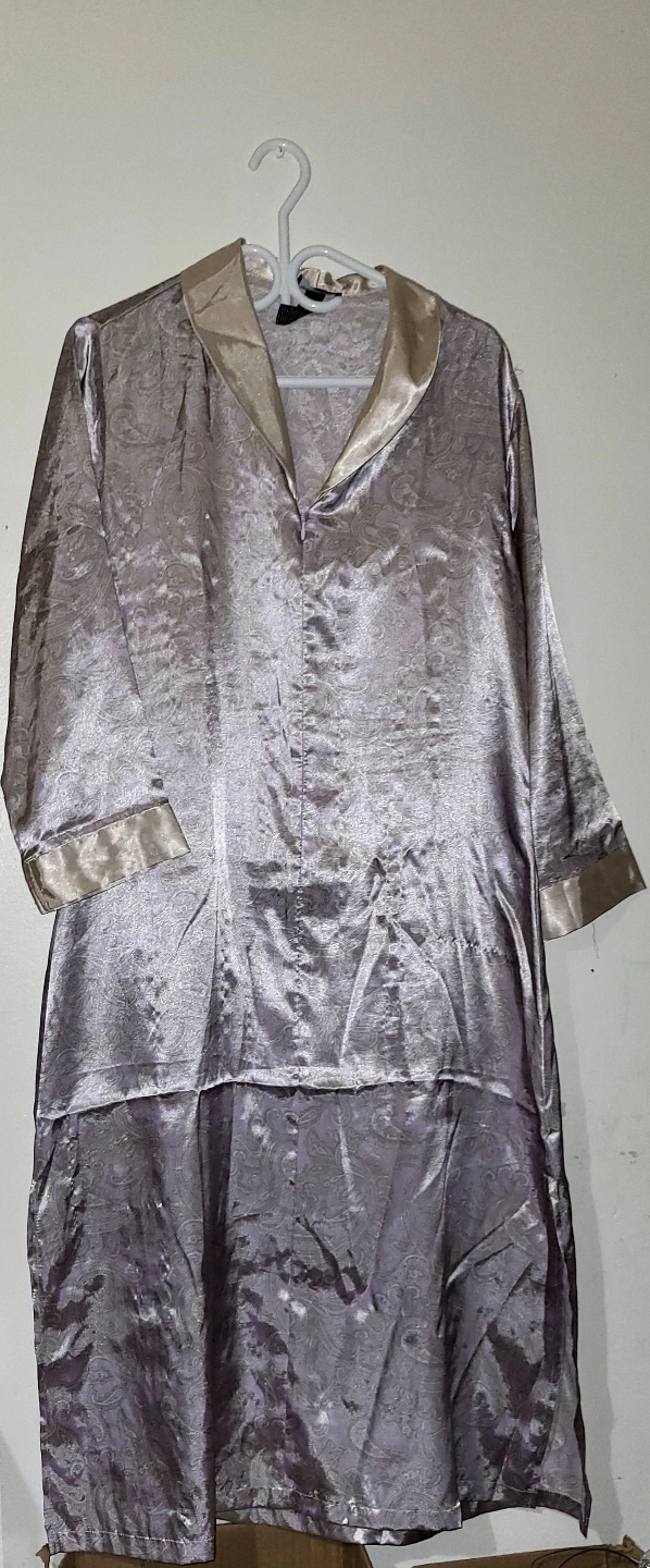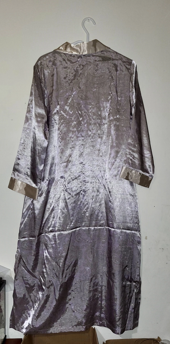 Silvery-purple satin loungewear. Three-quarter sleeves. Collared neckline. Relaxed fit. Side slits.