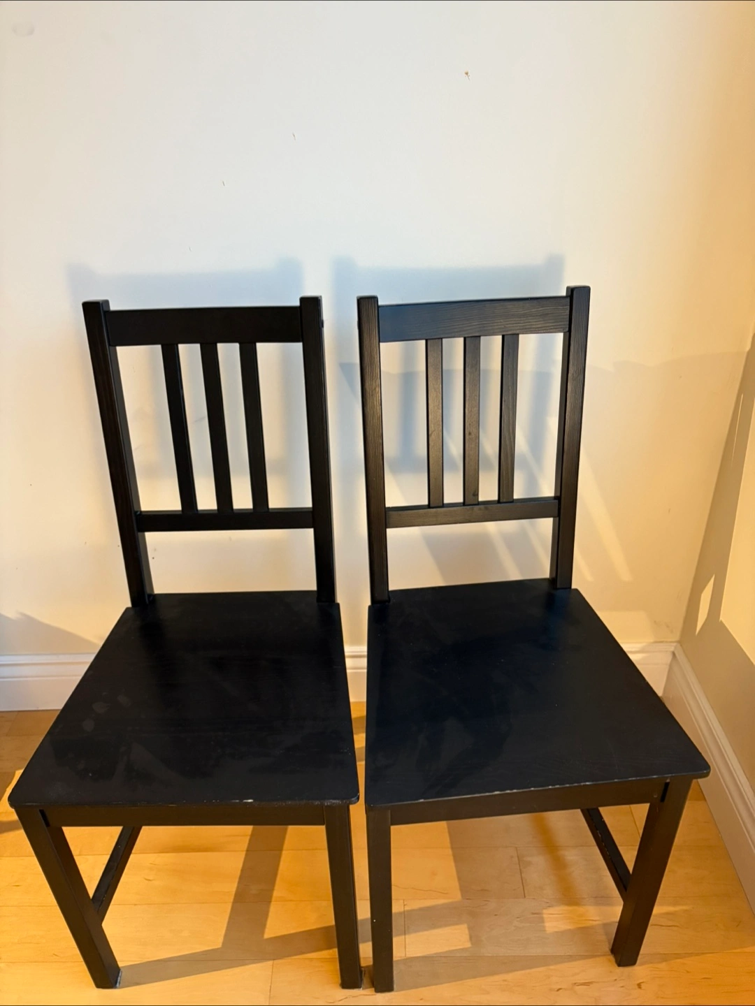 Selling a pair of IKEA chairs, brown-black. It has minor cosmetic wear, however the chair functions well. Simple and suitable for dining room or kitchen. The chairs are from a smoke and pet free home. The chair retail price is $40 from IKEA.