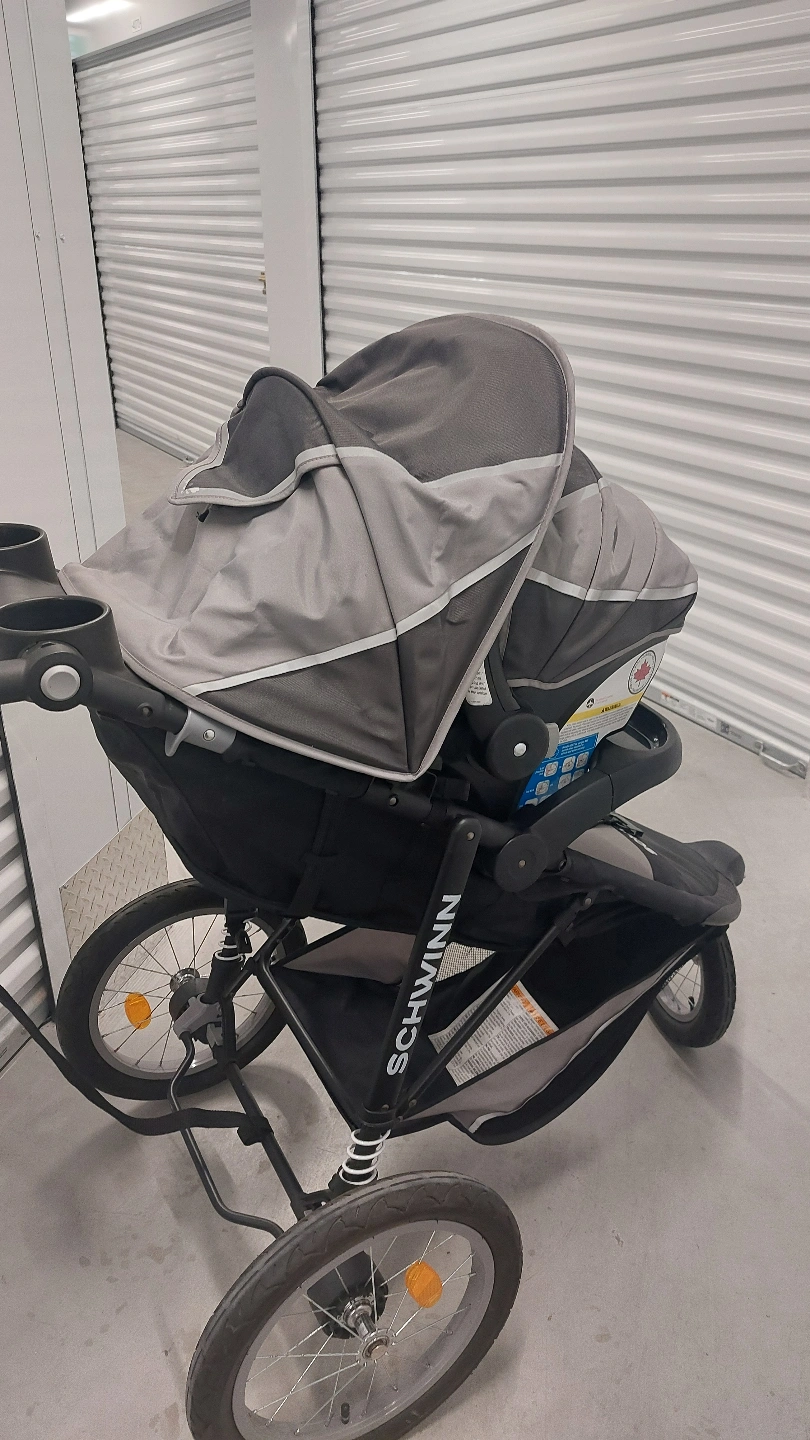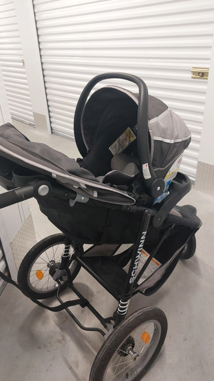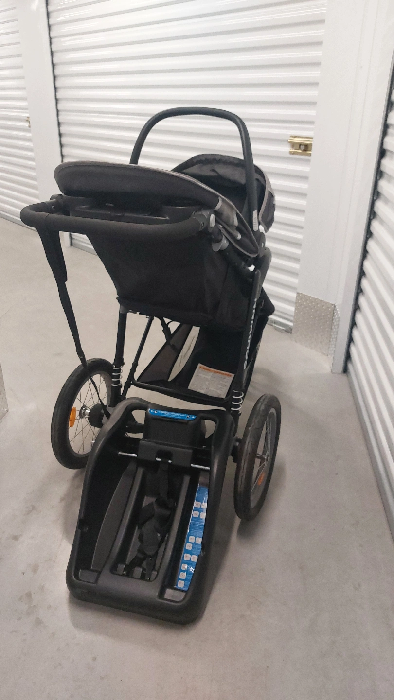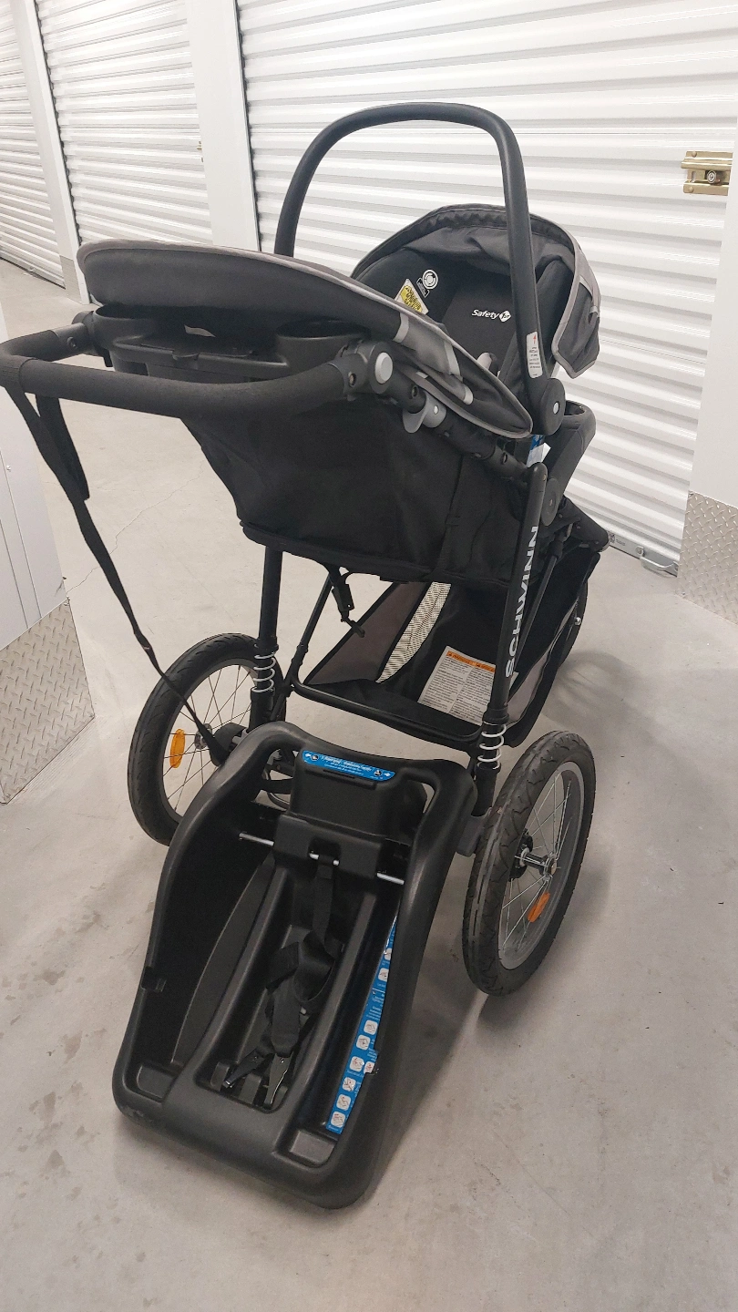 This travel system works great if you love the outdoors. Great suspension on the jogger, perfect for bumpy sidewalks and city streets. Works great on trails too. Golds up easy. Three-wheel jogging stroller. Features include a canopy, storage basket, and suspension. Accommodates an infant car seat. Grey and black colour scheme.