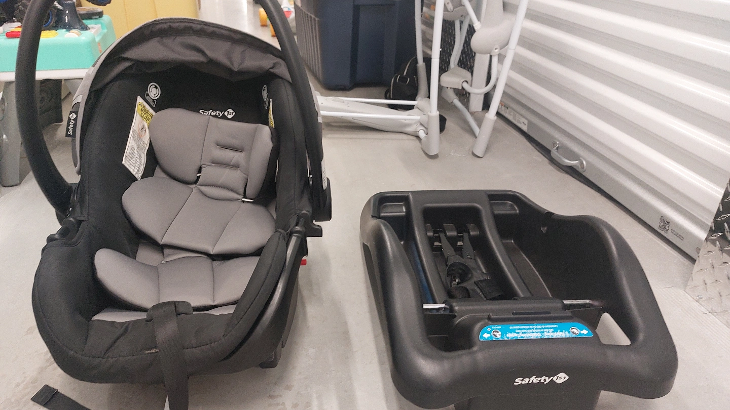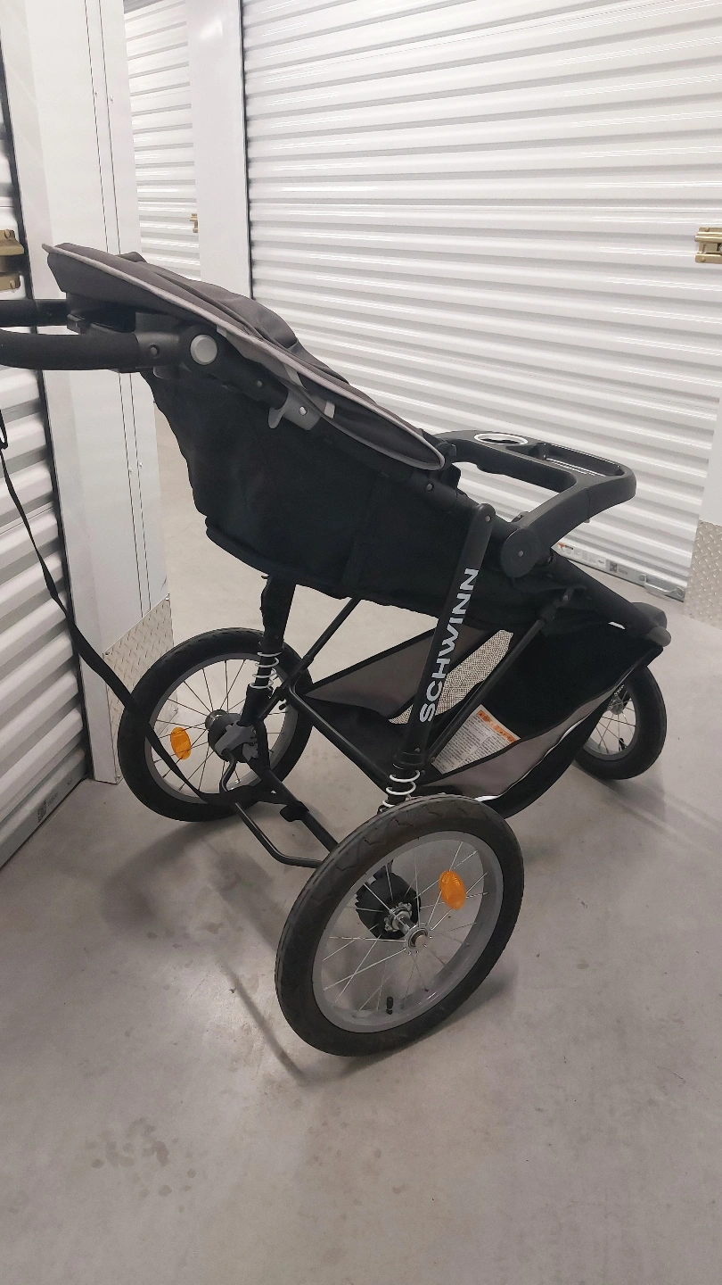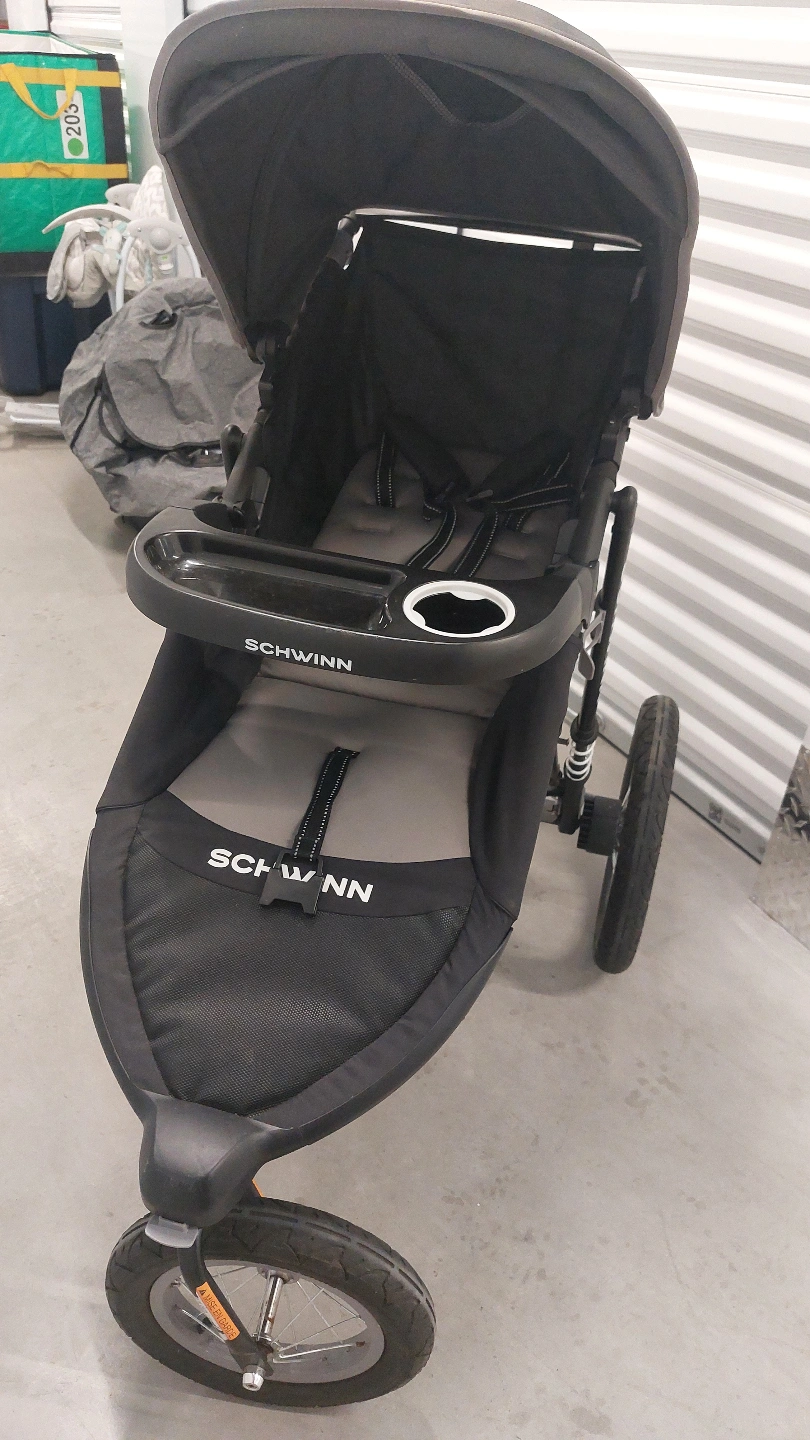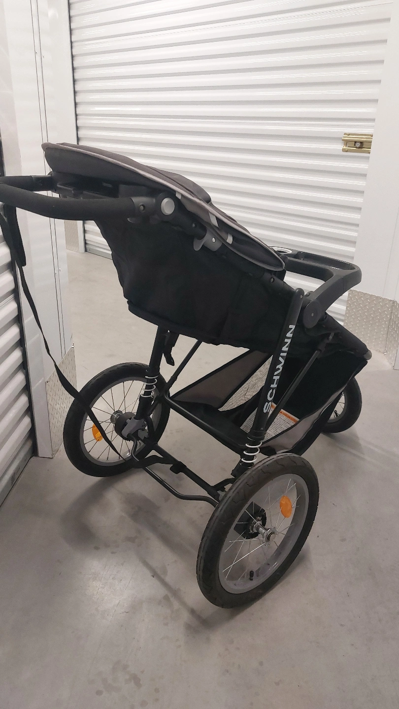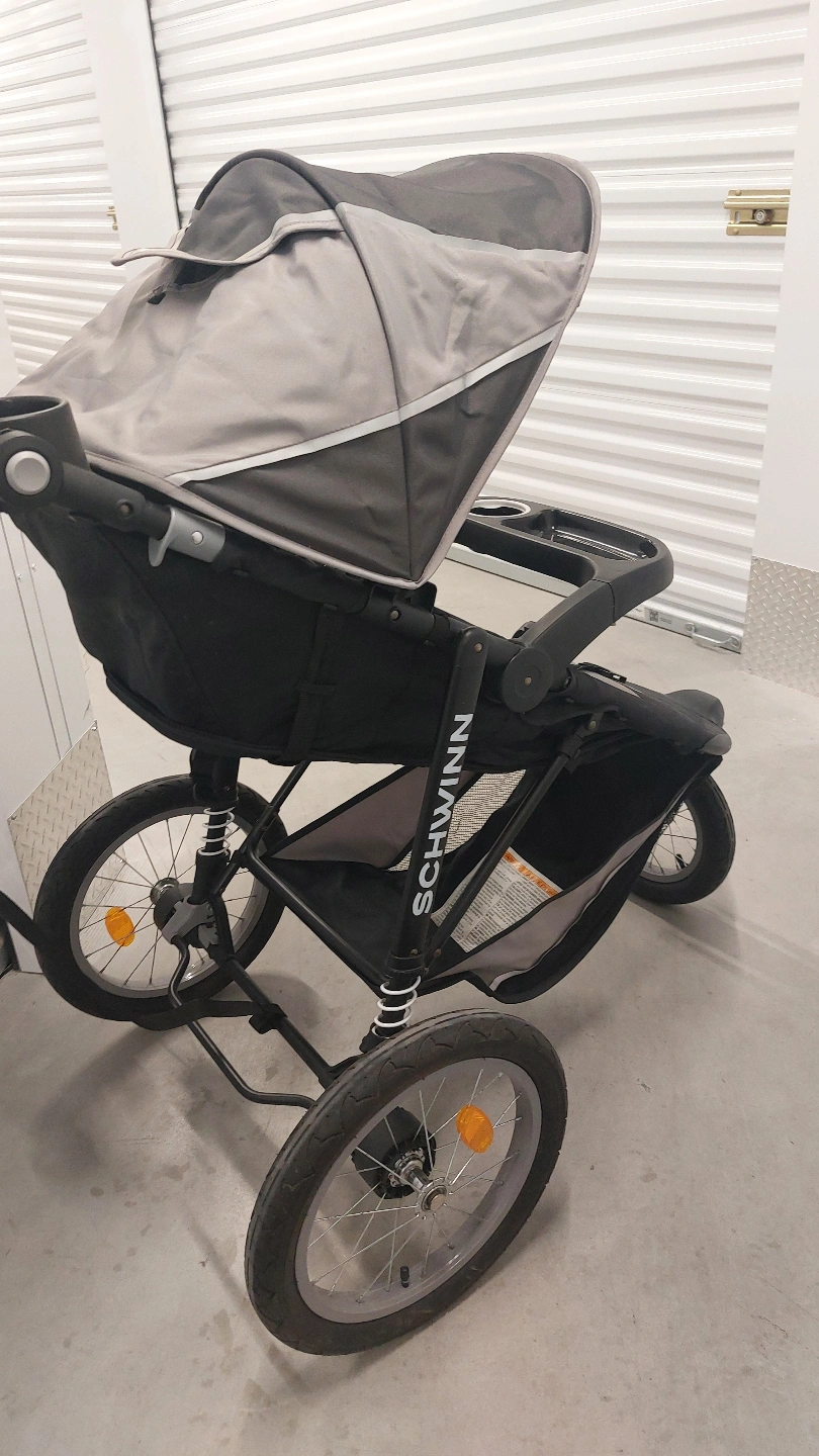 This travel system works great if you love the outdoors. Great suspension on the jogger, perfect for bumpy sidewalks and city streets. Works great on trails too. Golds up easy. Three-wheel jogging stroller. Features include a canopy, storage basket, and suspension. Accommodates an infant car seat. Grey and black colour scheme.