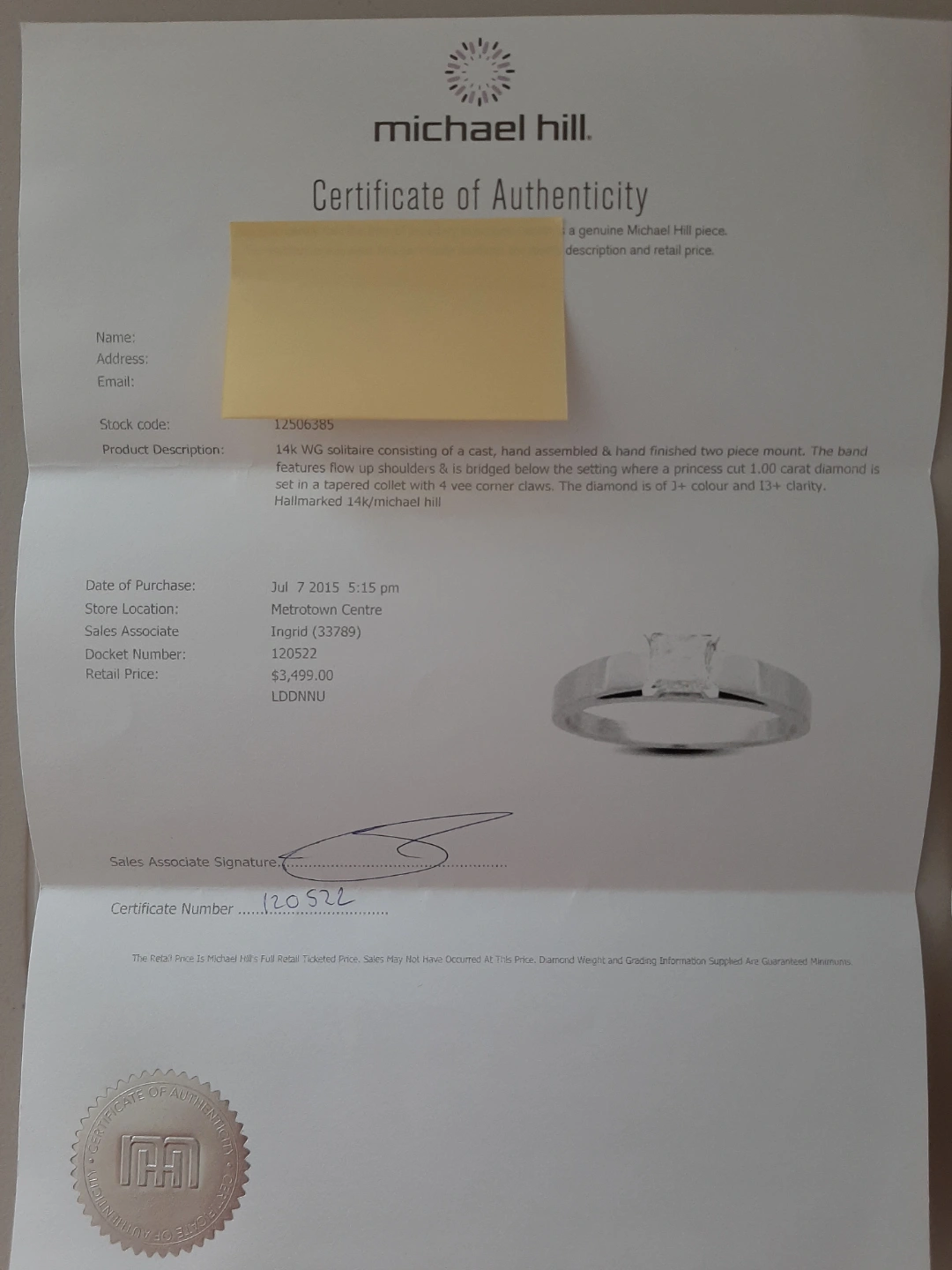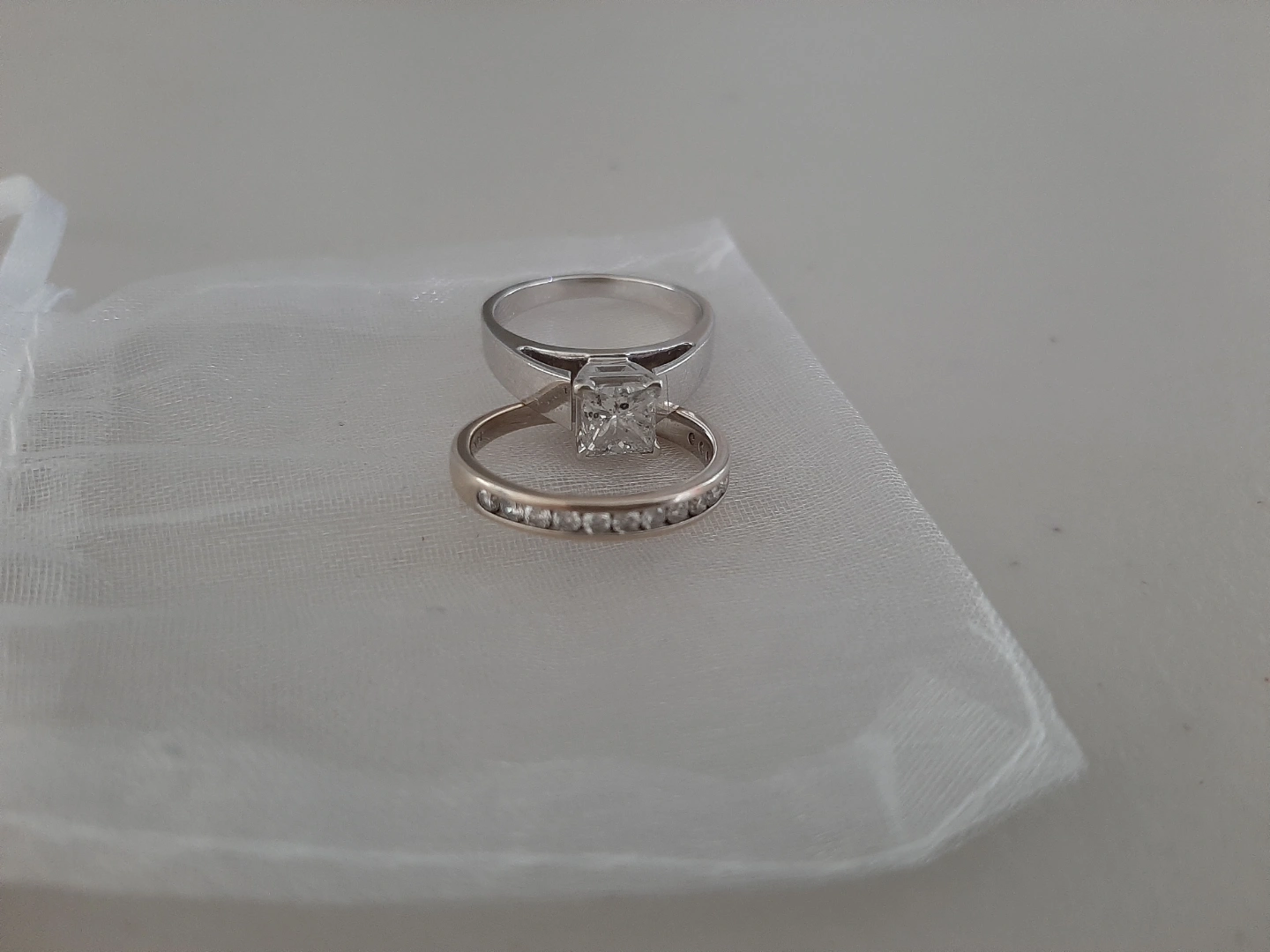 Stunning Michael Hill wedding set. Features a princess-cut diamond solitaire engagement ring and a matching channel-set diamond wedding band. Both rings are 14k white gold. Comes with certificates of authenticity.