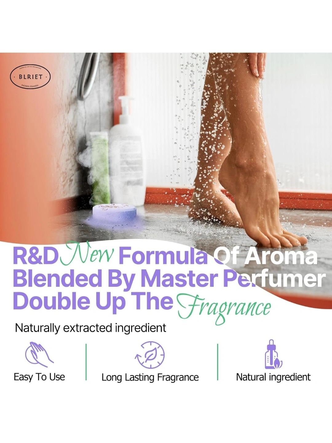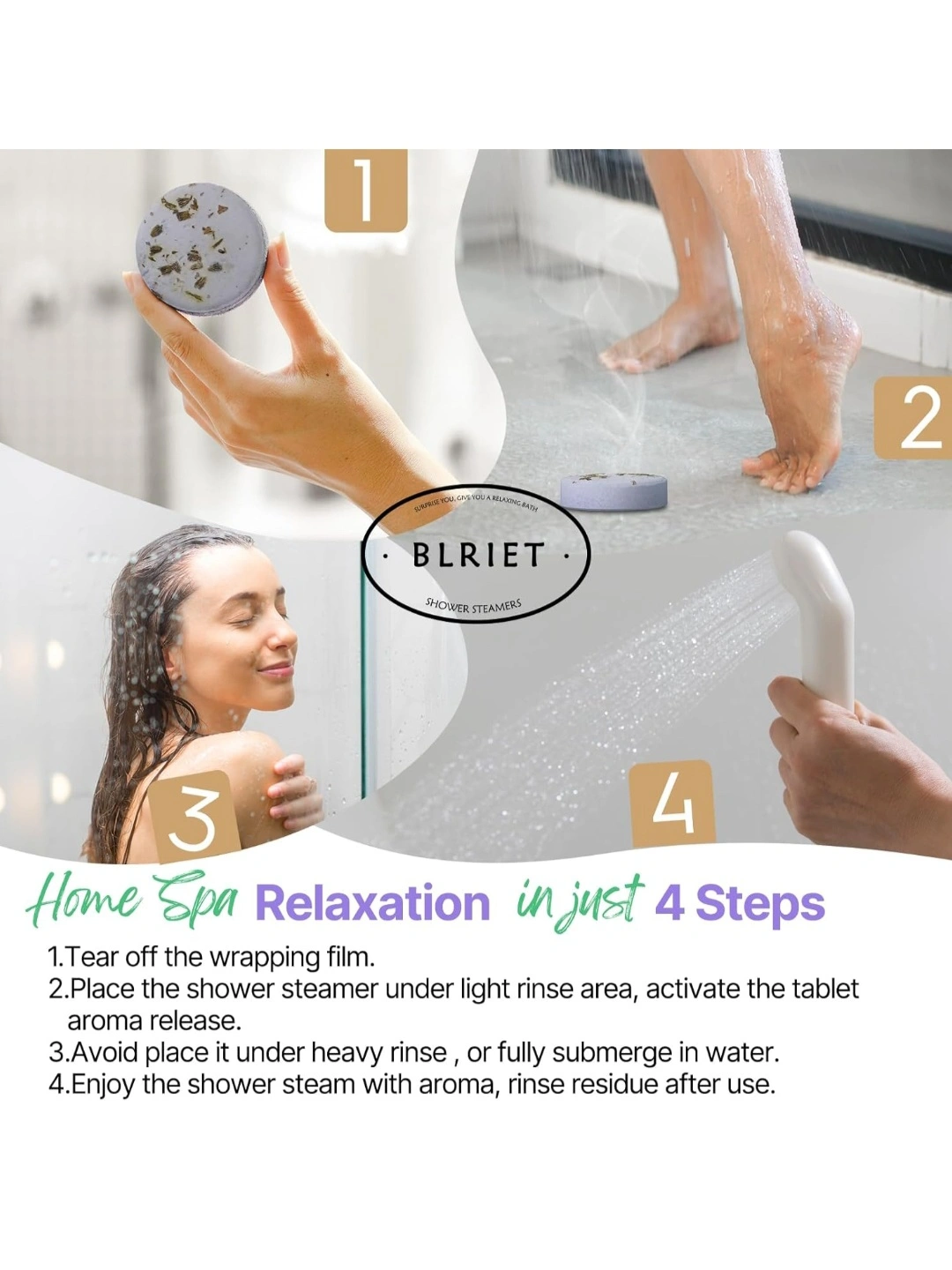 Relaxing shower steamers. Eight individually wrapped tablets. Long-lasting fragrance. Natural essential oils. Vegan and cruelty-free. Luxury design. Perfect gift.
