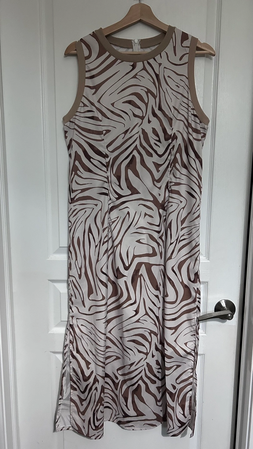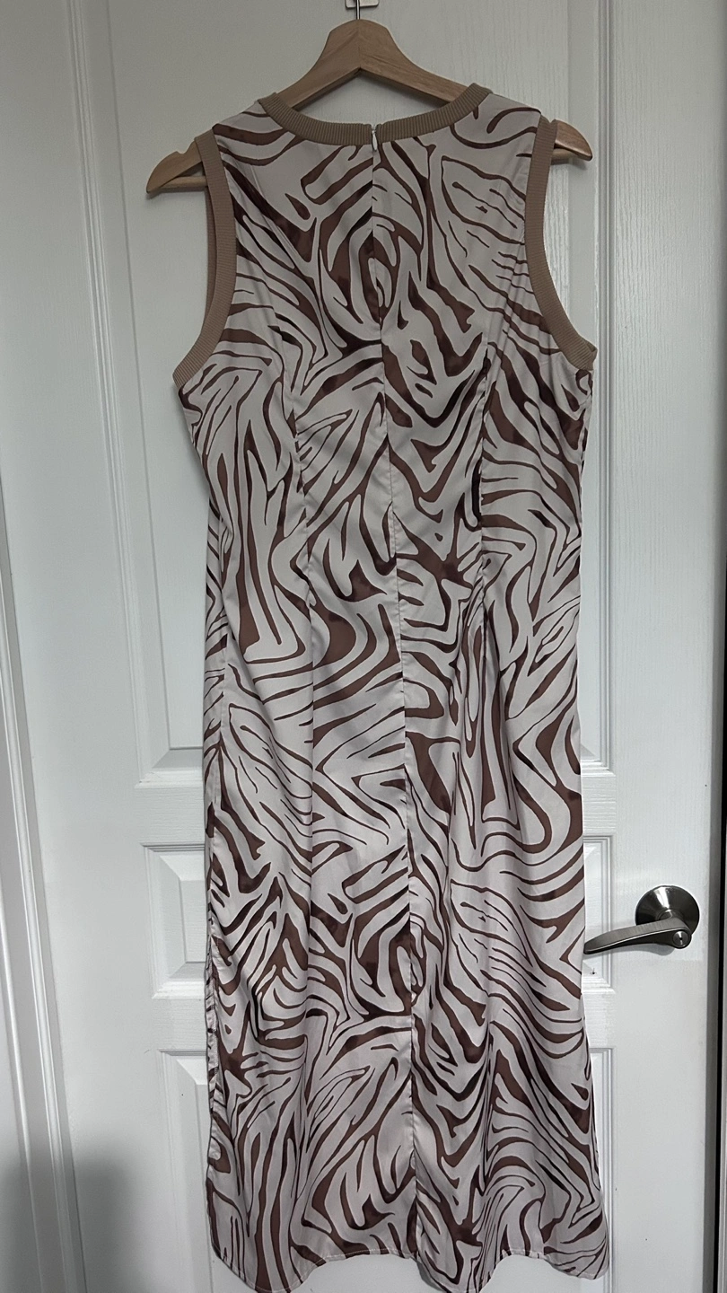 Stunning sleeveless midi dress. Features a zebra print design and side slits. Cream and brown colour scheme. Round neckline. Relaxed fit.