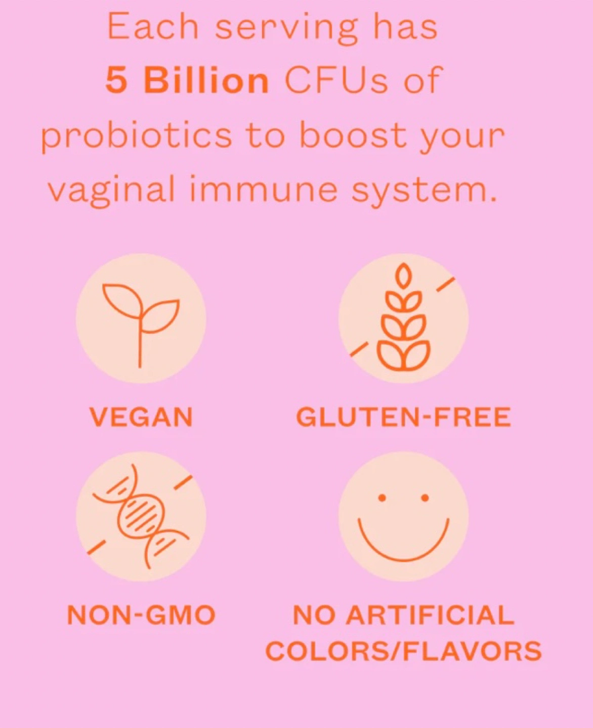60 count bottle of gummy vitamins. Promotes vaginal and gut health. 5 billion CFUs of probiotics. Vegan, gluten-free, non-GMO, no artificial colors/flavors. OBGYN formulated. Juicy strawberry flavor.
