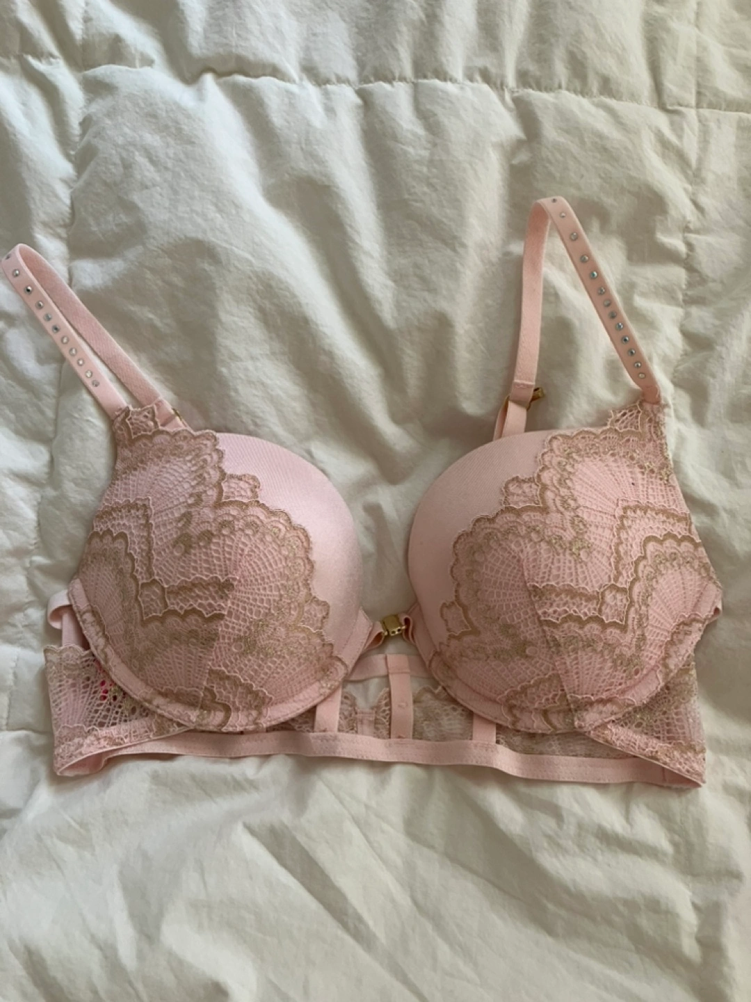 Pretty pink bralette. Delicate lace detailing. Straps embellished with rhinestones. Excellent support.