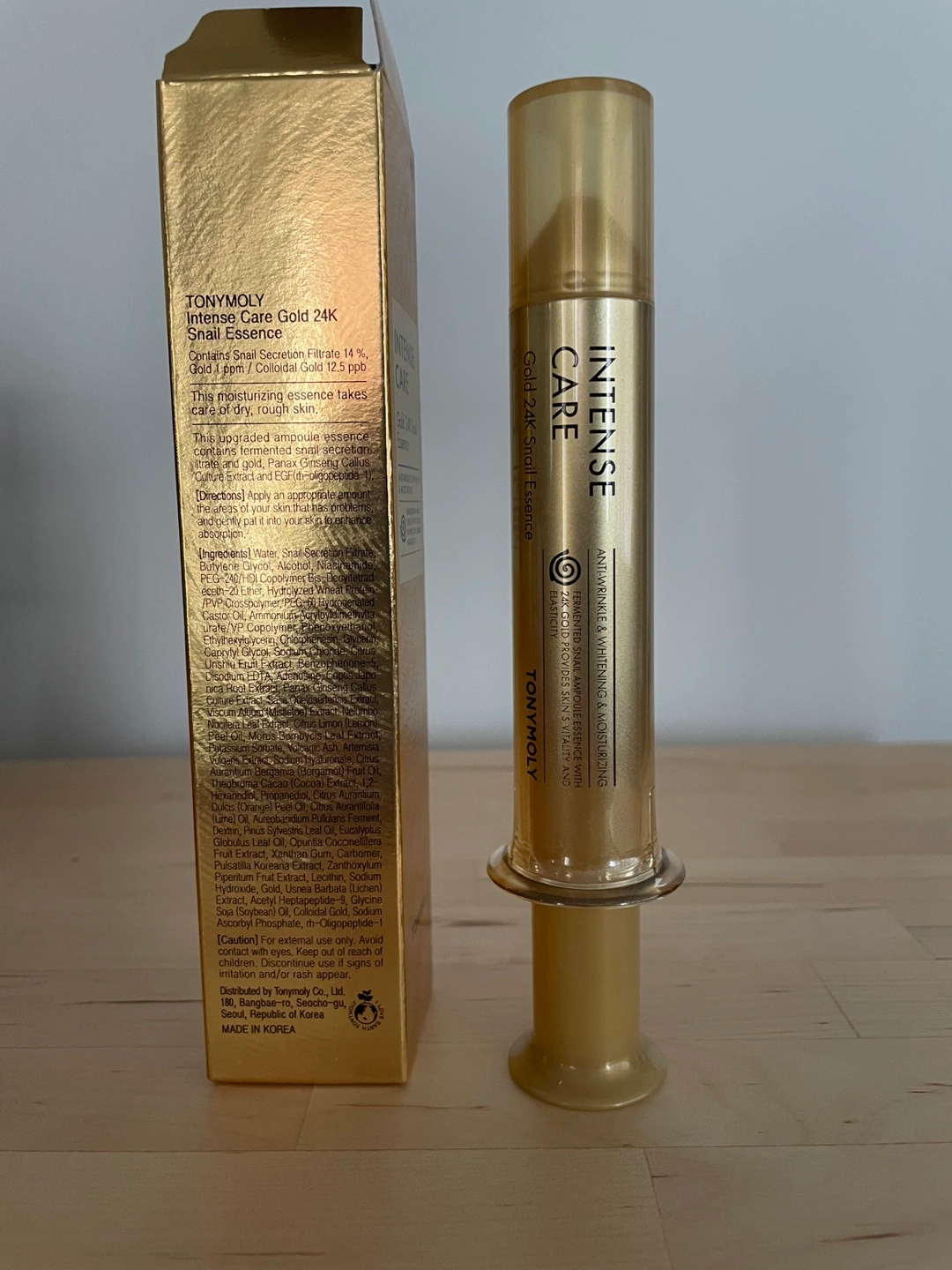New, unopened ampoule. Anti-wrinkle and whitening. Moisturizing. Improves skin elasticity and strength. Contains 24K gold and snail secretion filtrate.