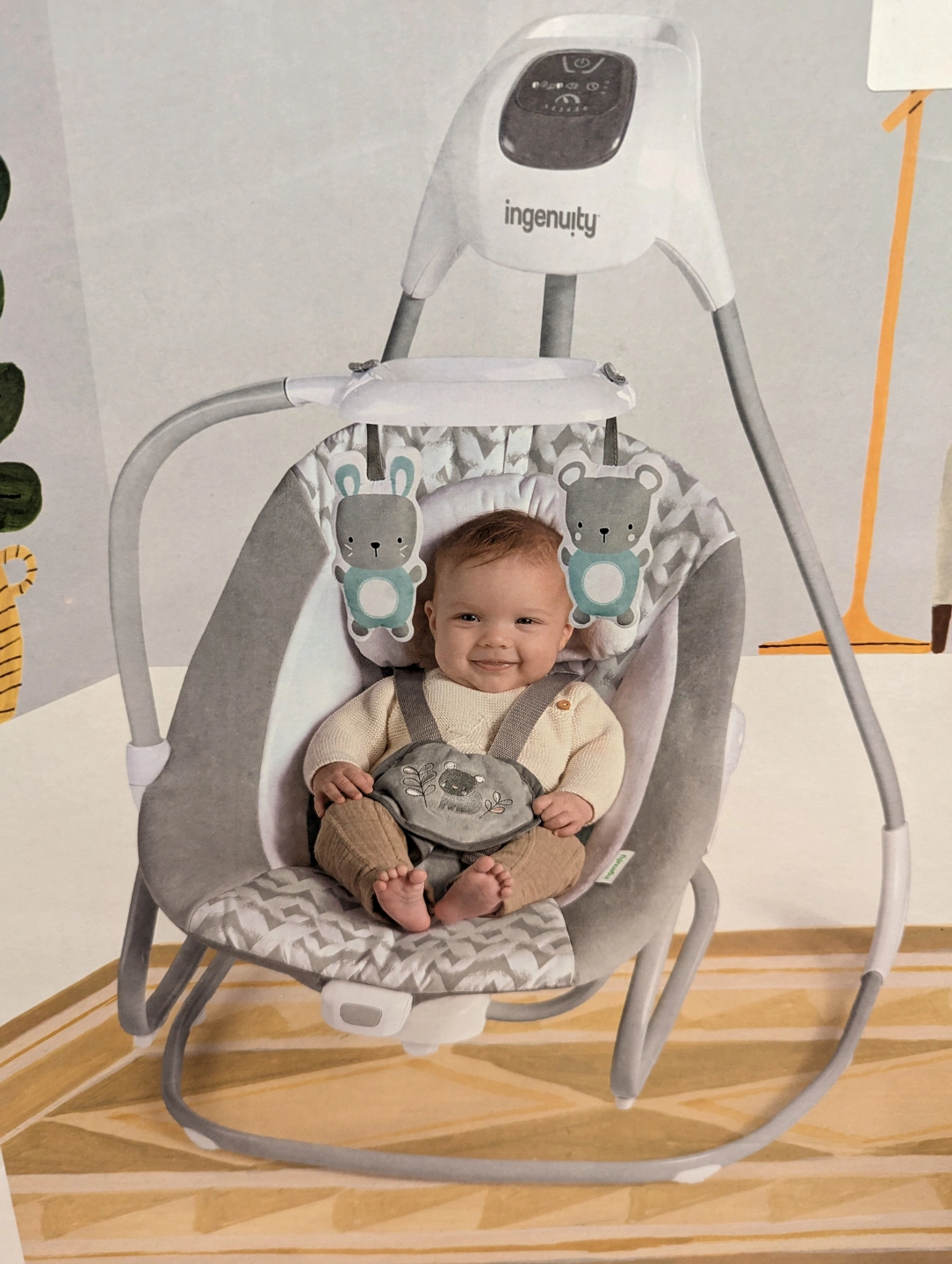 Baby swing and rocker. Grey and white pattern. Suitable for 0-9 months. Compact design. Includes soothing features.