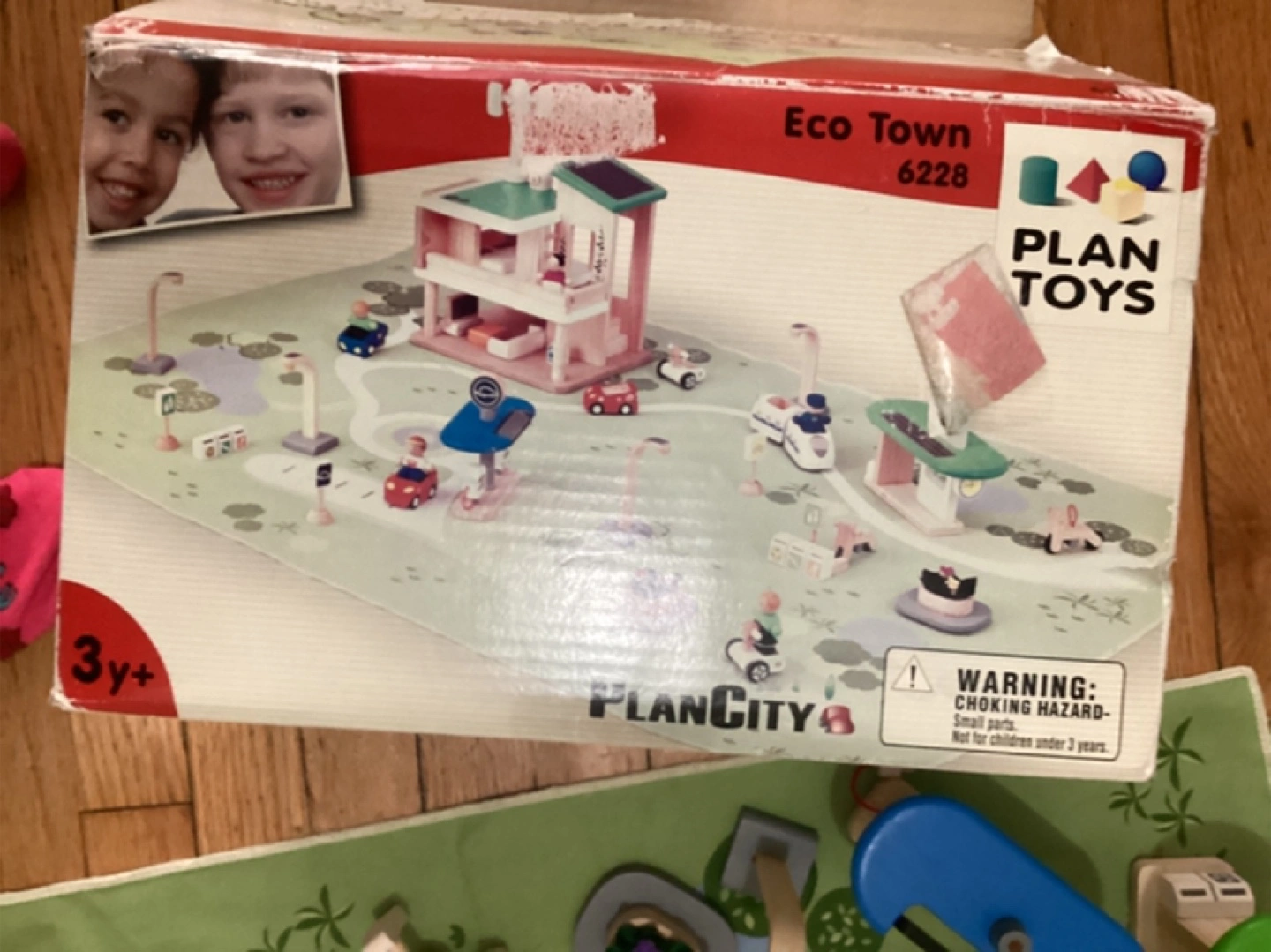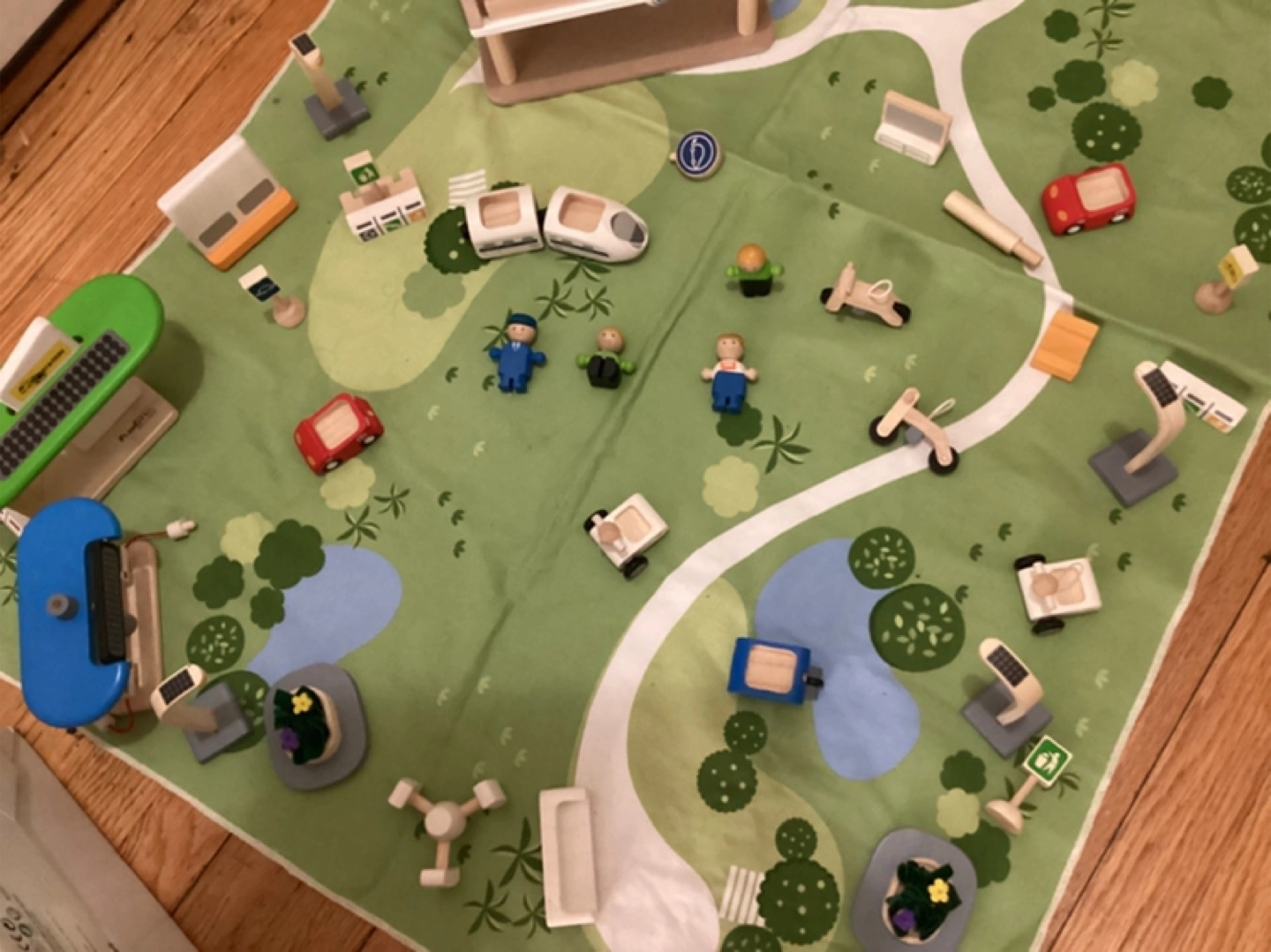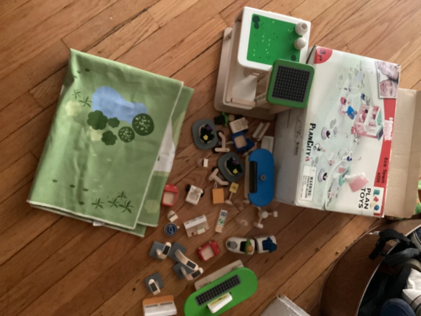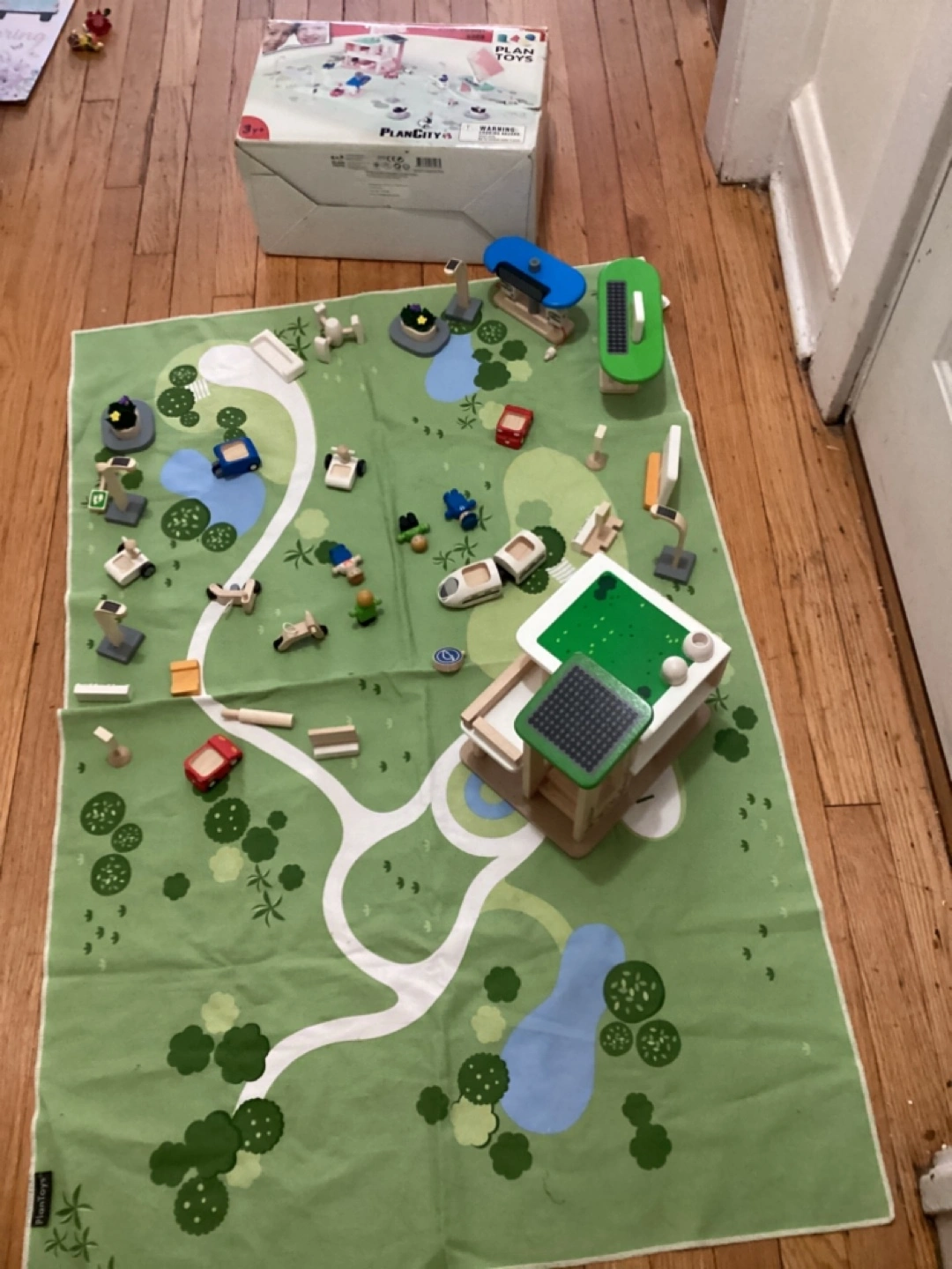 PlanCity Eco Town set with majority of pieces. Includes wooden buildings, vehicles, figures, and playmat. Excellent condition. Box included.