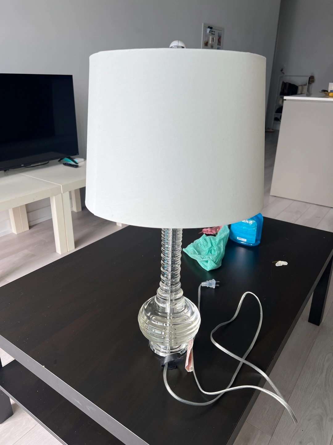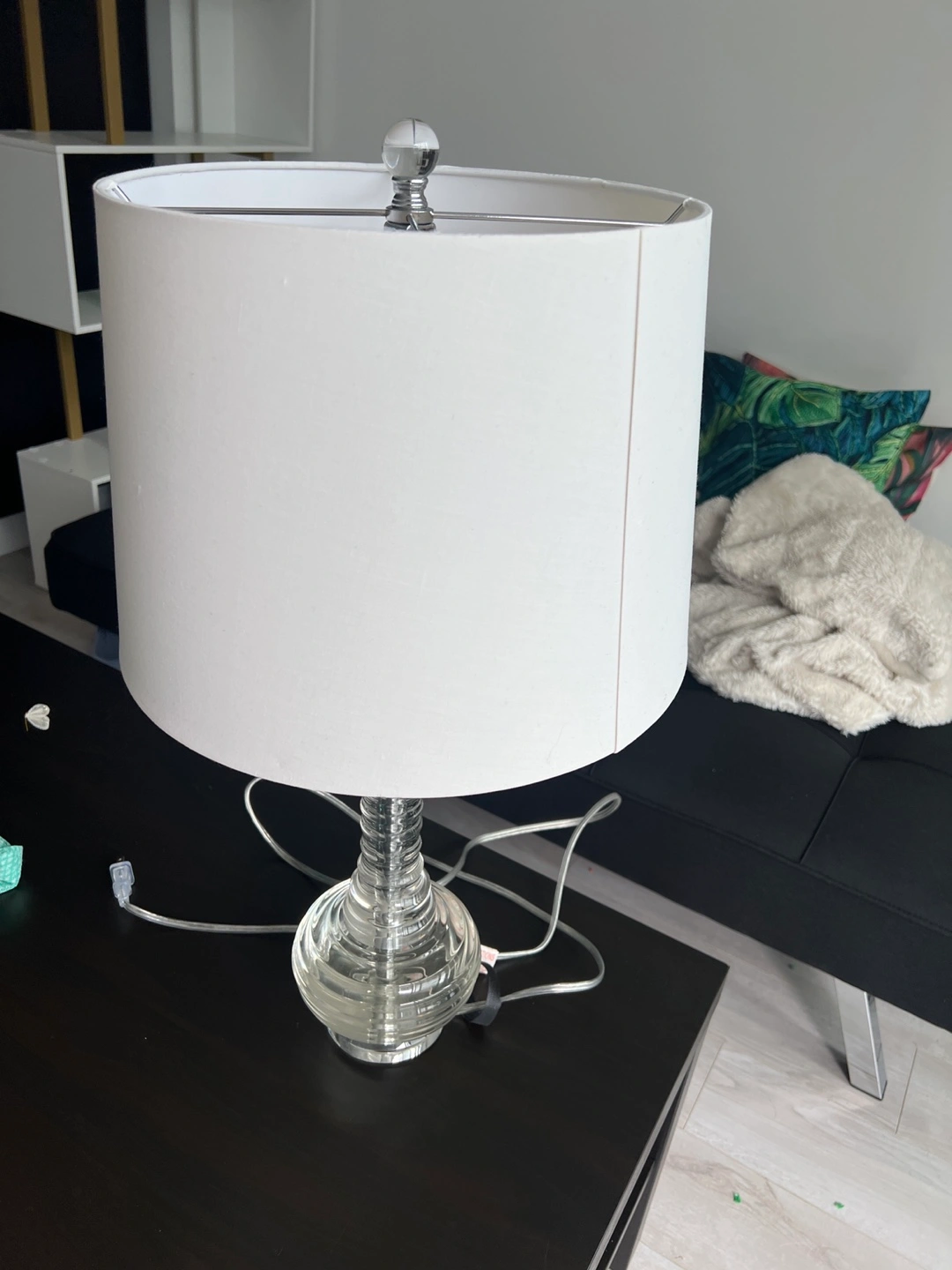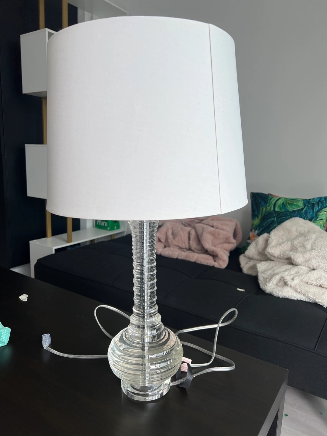 Elegant lamp. Features a clear glass base and a white fabric shade. Simple design, perfect for a bedside table or living room.