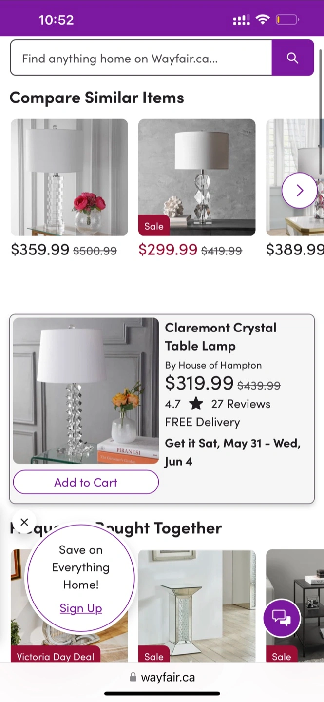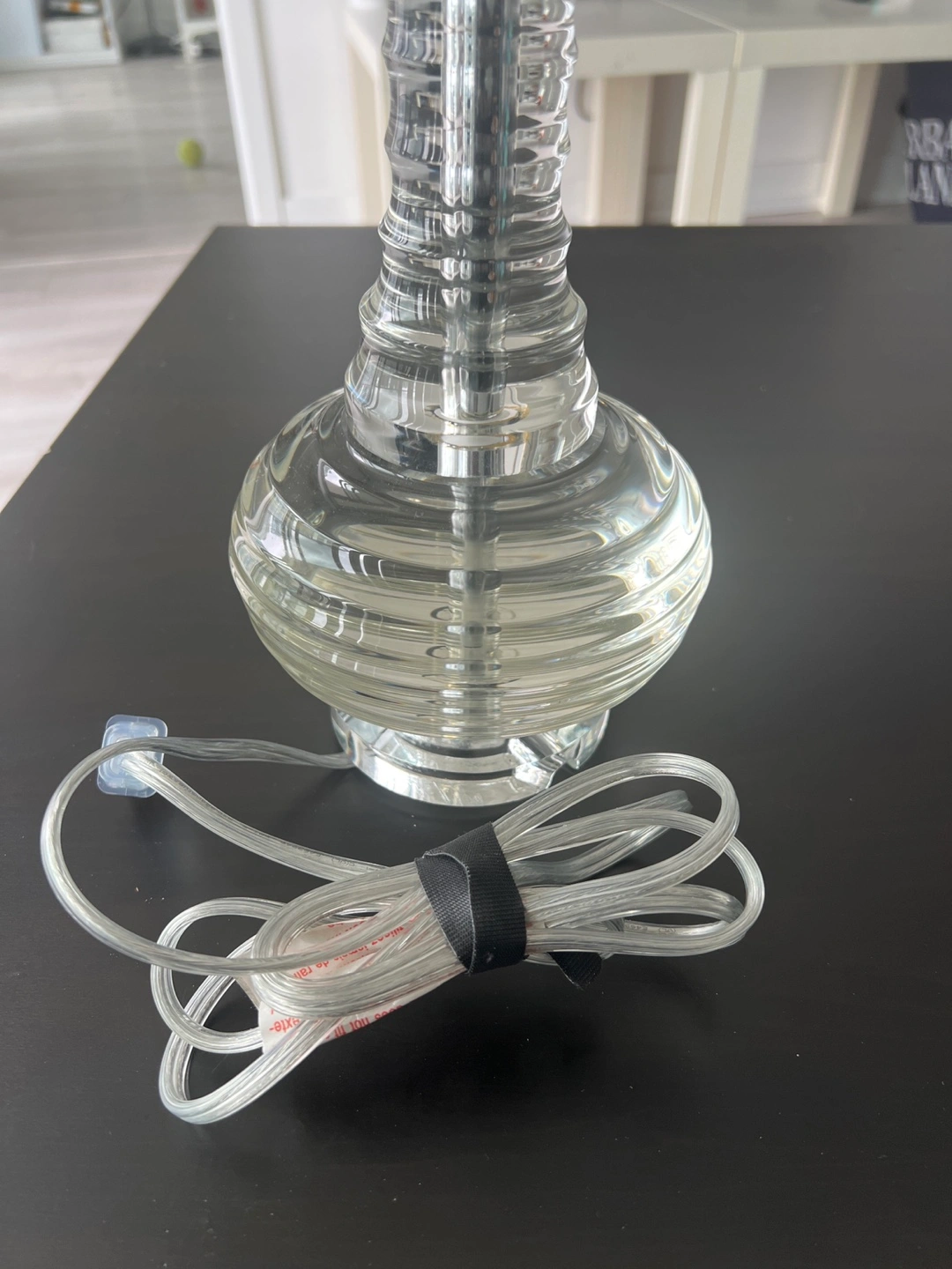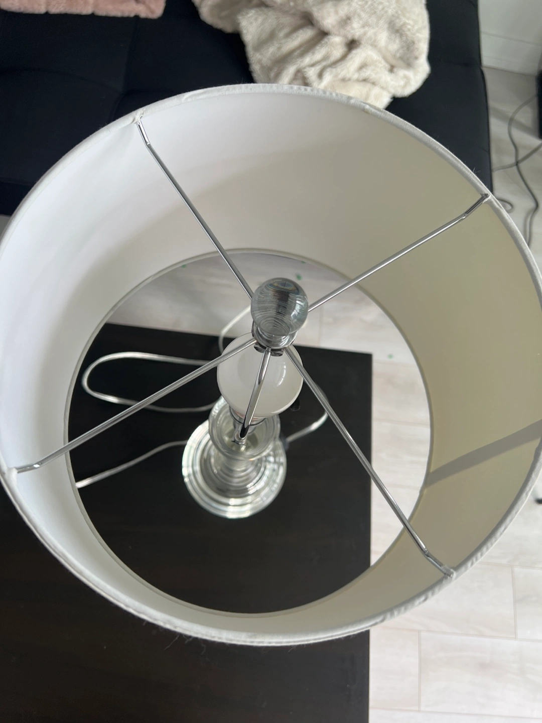 Elegant lamp. Features a clear glass base and a white fabric shade. Simple design, perfect for a bedside table or living room.