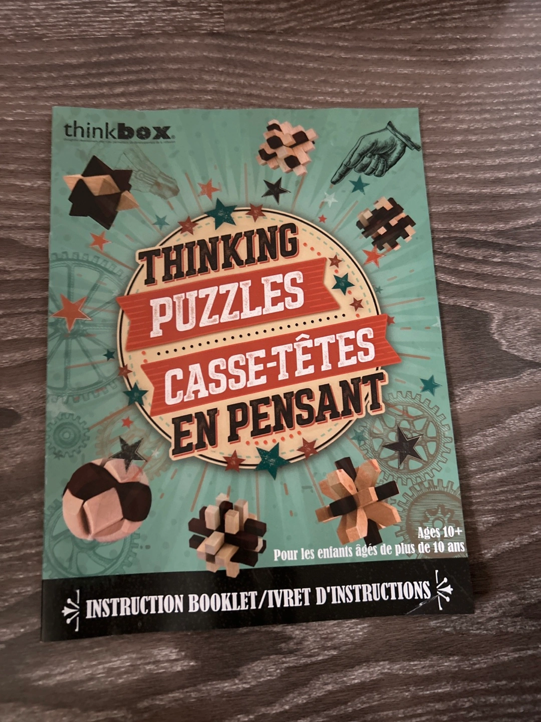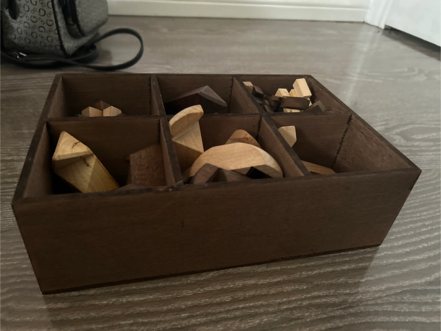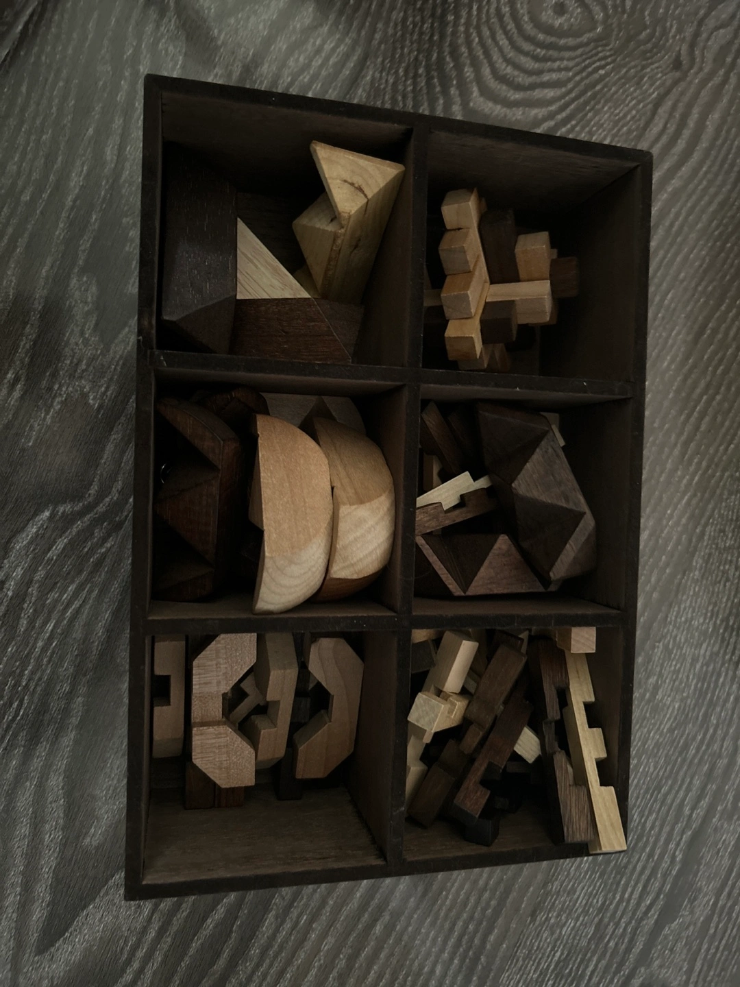 Collection of wooden brain teaser puzzles. Variety of shapes and sizes. Comes in a dark wooden storage box. Great for puzzle enthusiasts.