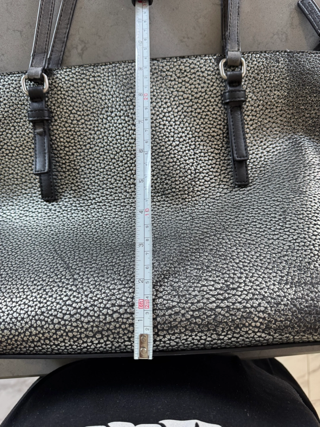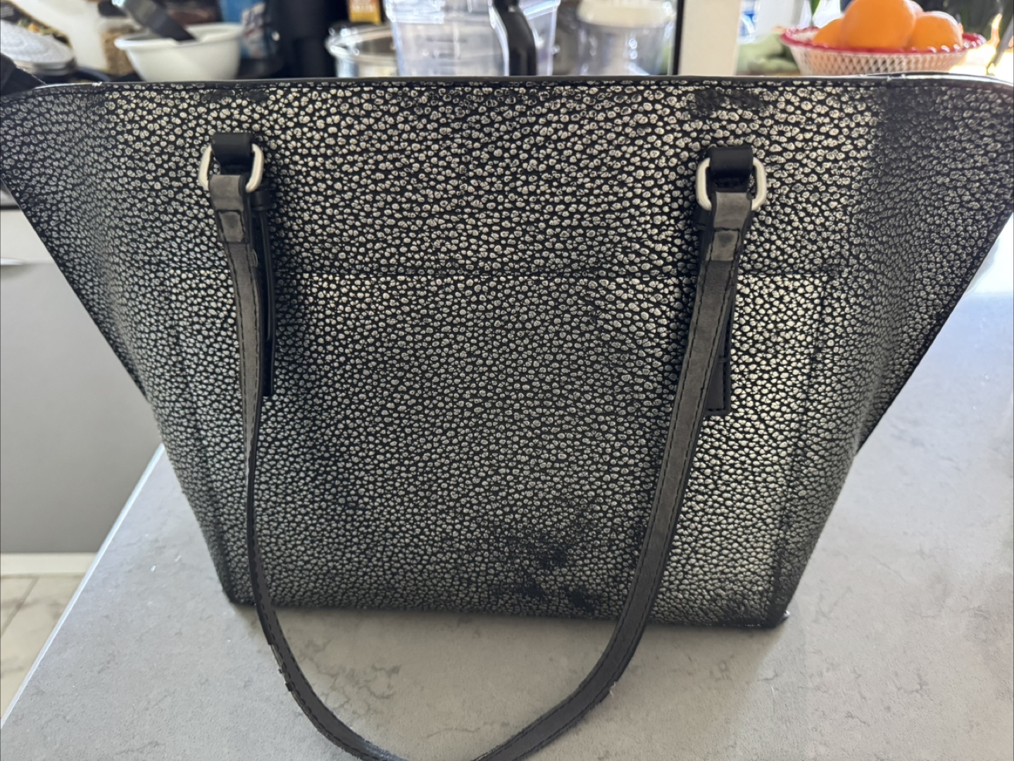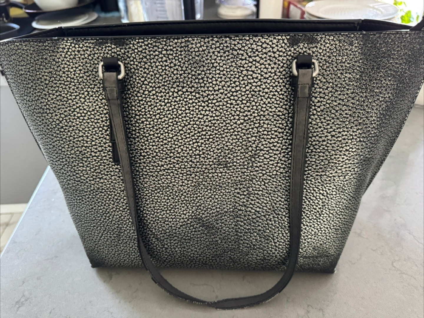 Stylish silver tote bag. Features two shoulder straps and a zipper closure. Black interior lining. Great for everyday use.