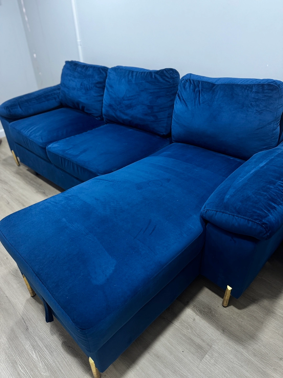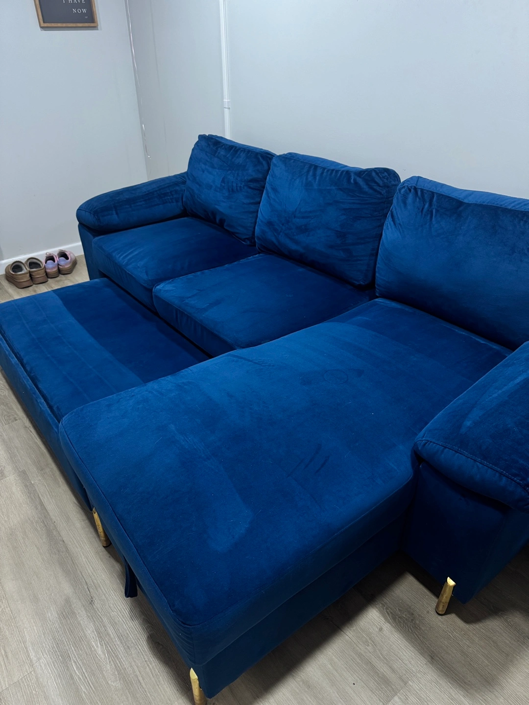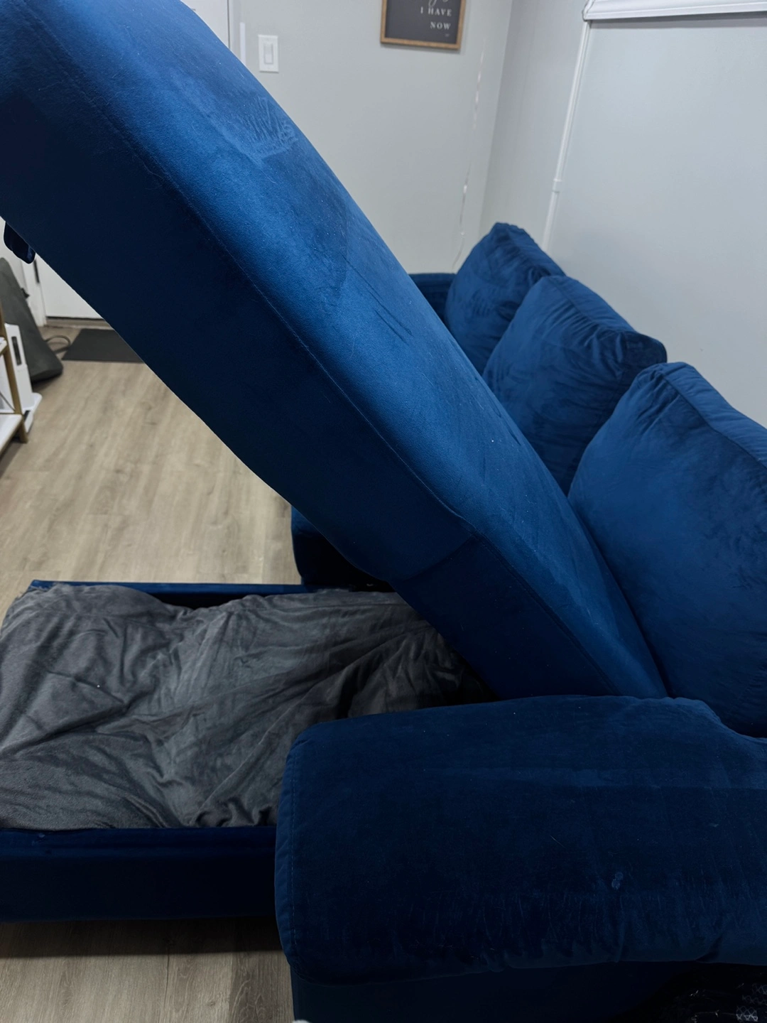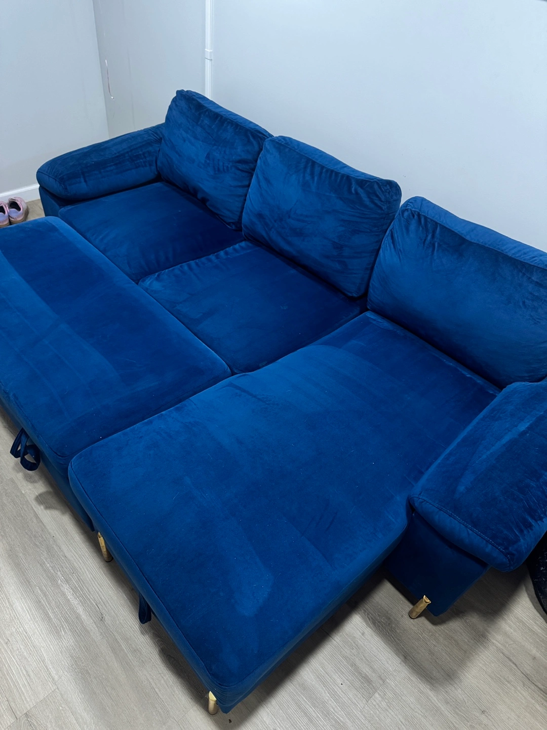 Stylish, functional, and super cozy! This 9/10 gently used sleeper sectional by Devion Furniture is the perfect piece for your living room or guest space. The sleek velvet finish adds a touch of luxury, and it easily converts into a bed for visitors. The reversible design allows flexibility in setup to fit your space—and it even includes built-in storage under the chaise for blankets, pillows, or anything you need hidden but handy.