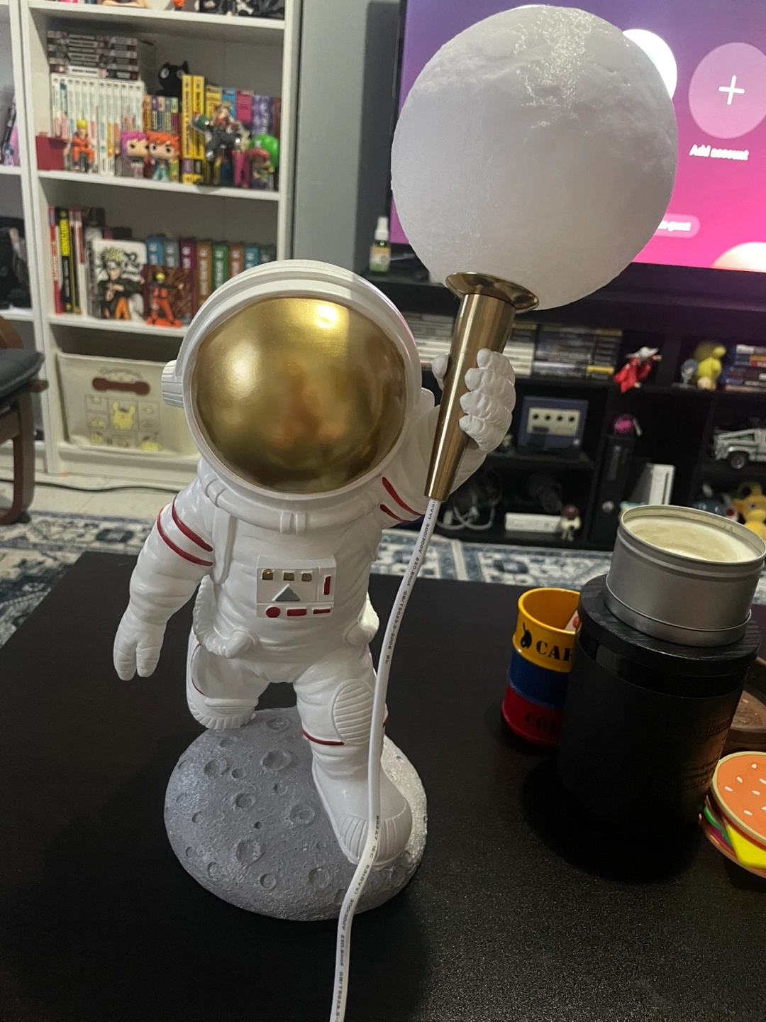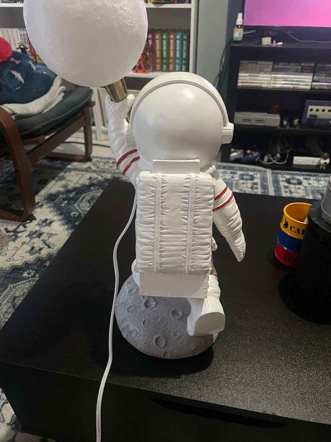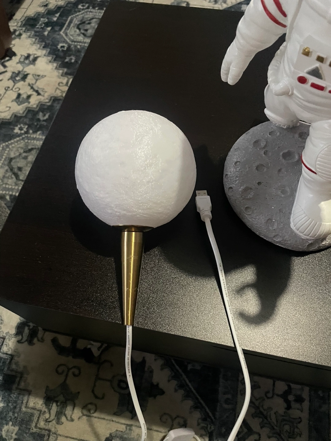 Adorable astronaut lamp. Features a moon-shaped lamp. USB powered. Great for bedrooms or desks. works great, turned on maybe twice but has just sat mostly